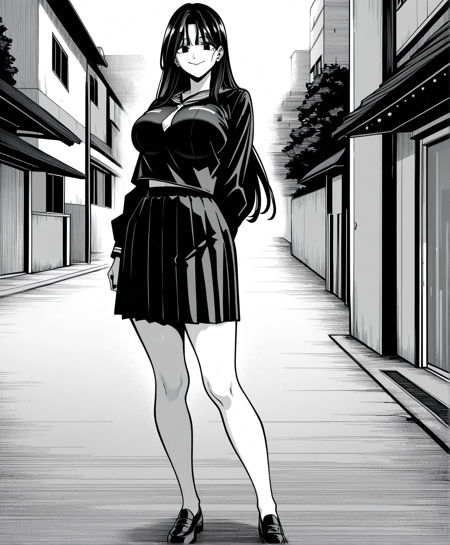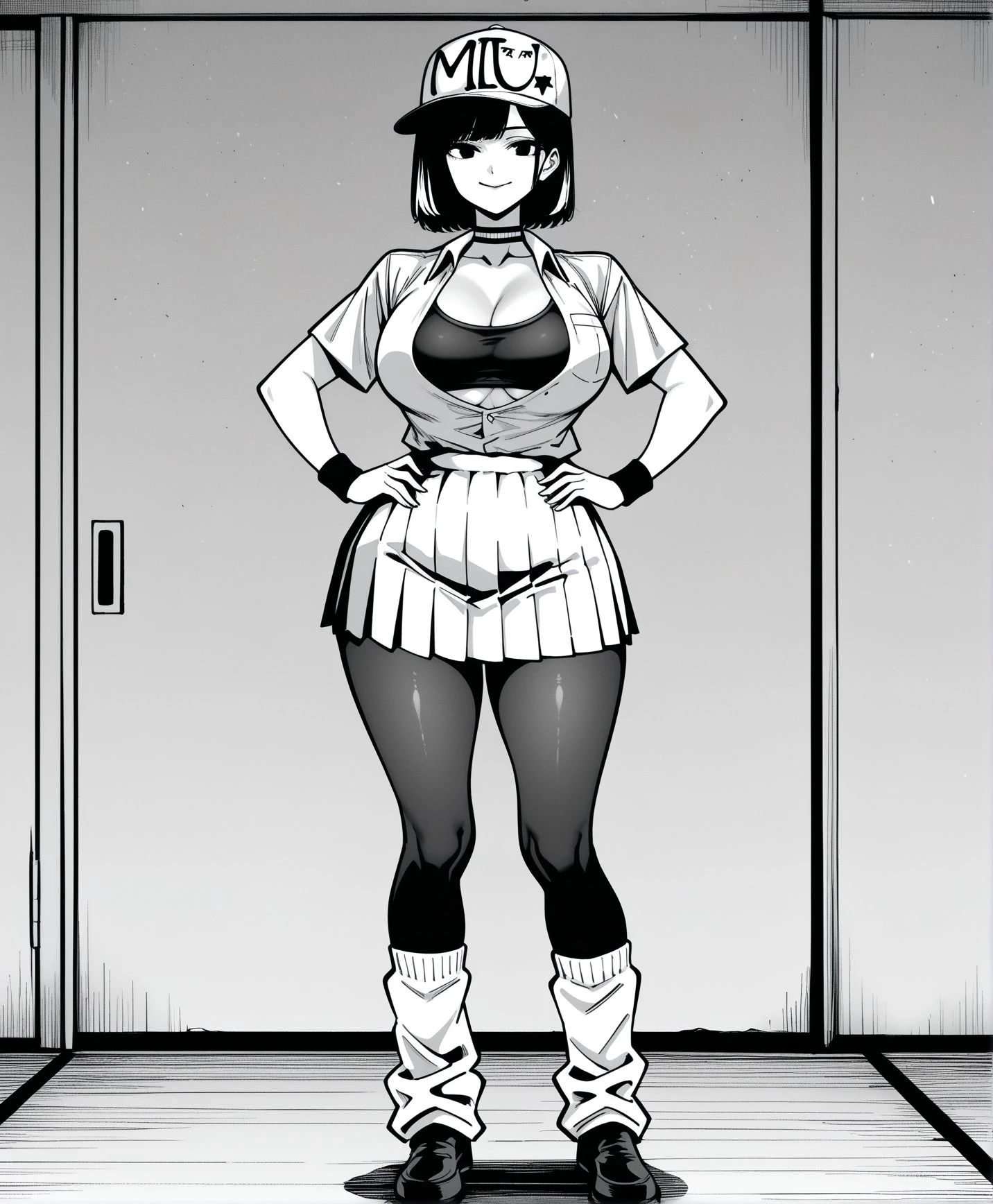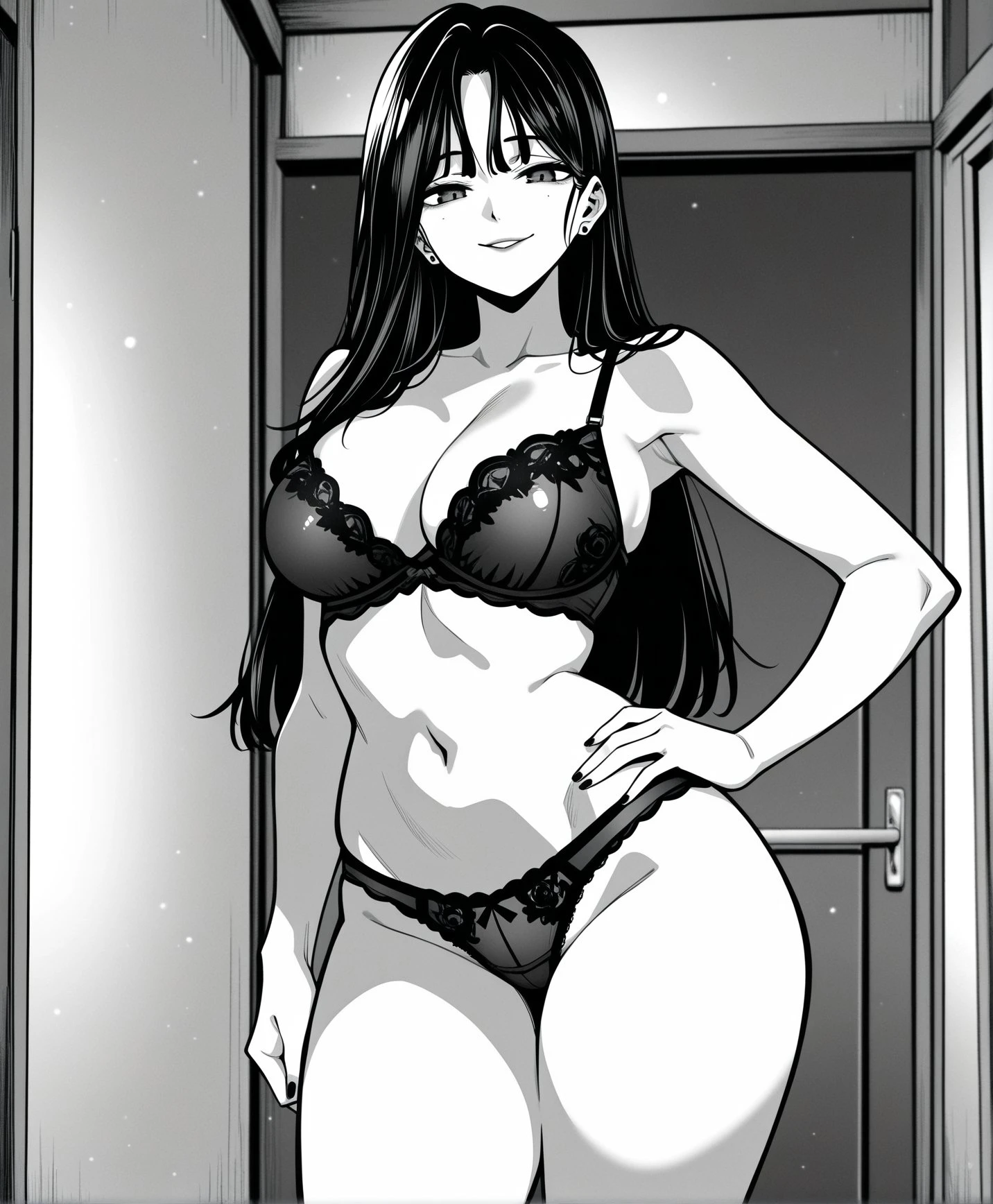 b_gal,1girl,monochrome, balck ribbon on neck,