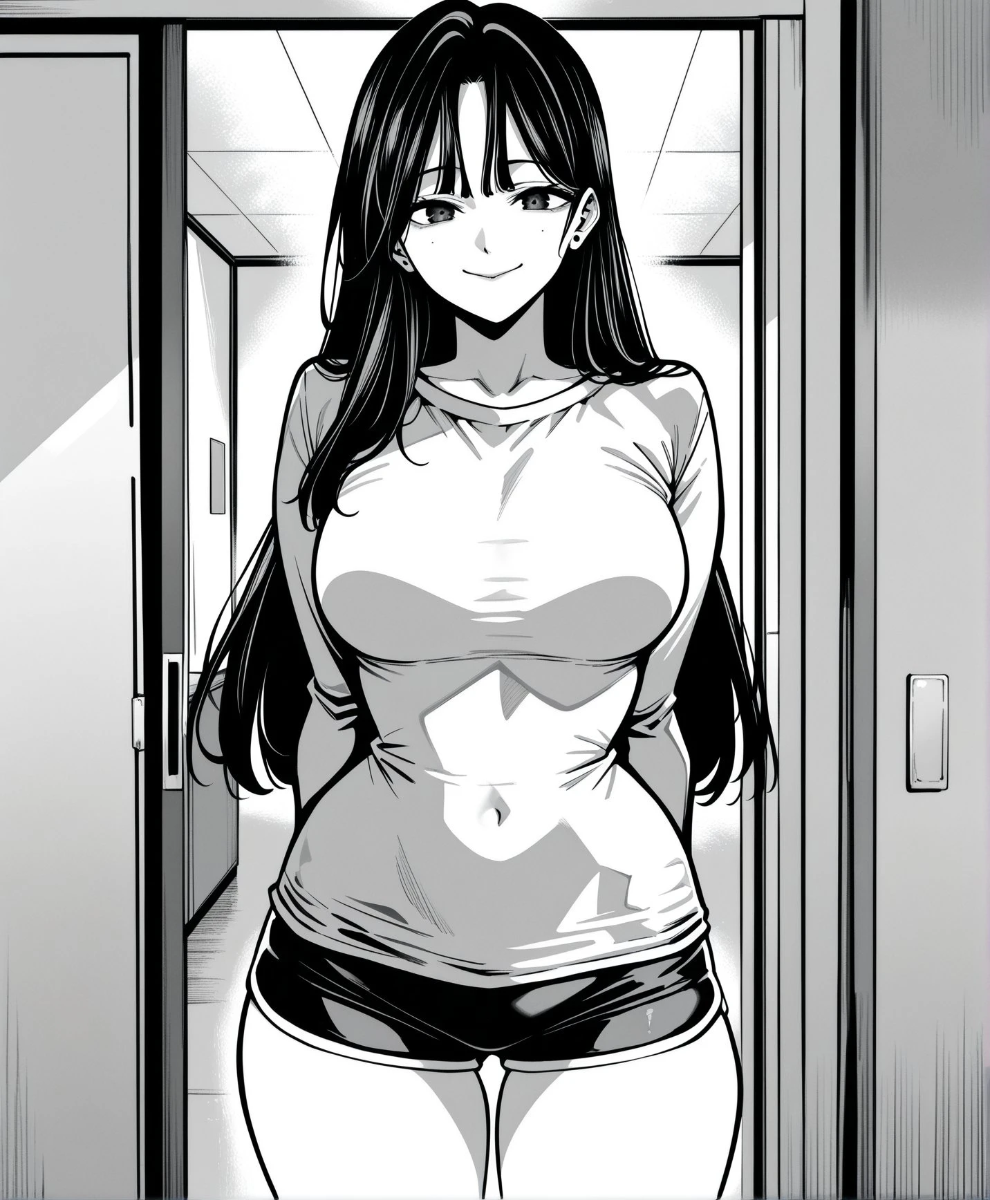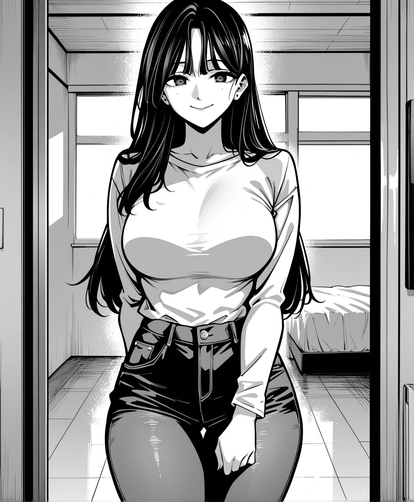 monochrome,solo,looking at viewer,smile, black pants,black shirt,
