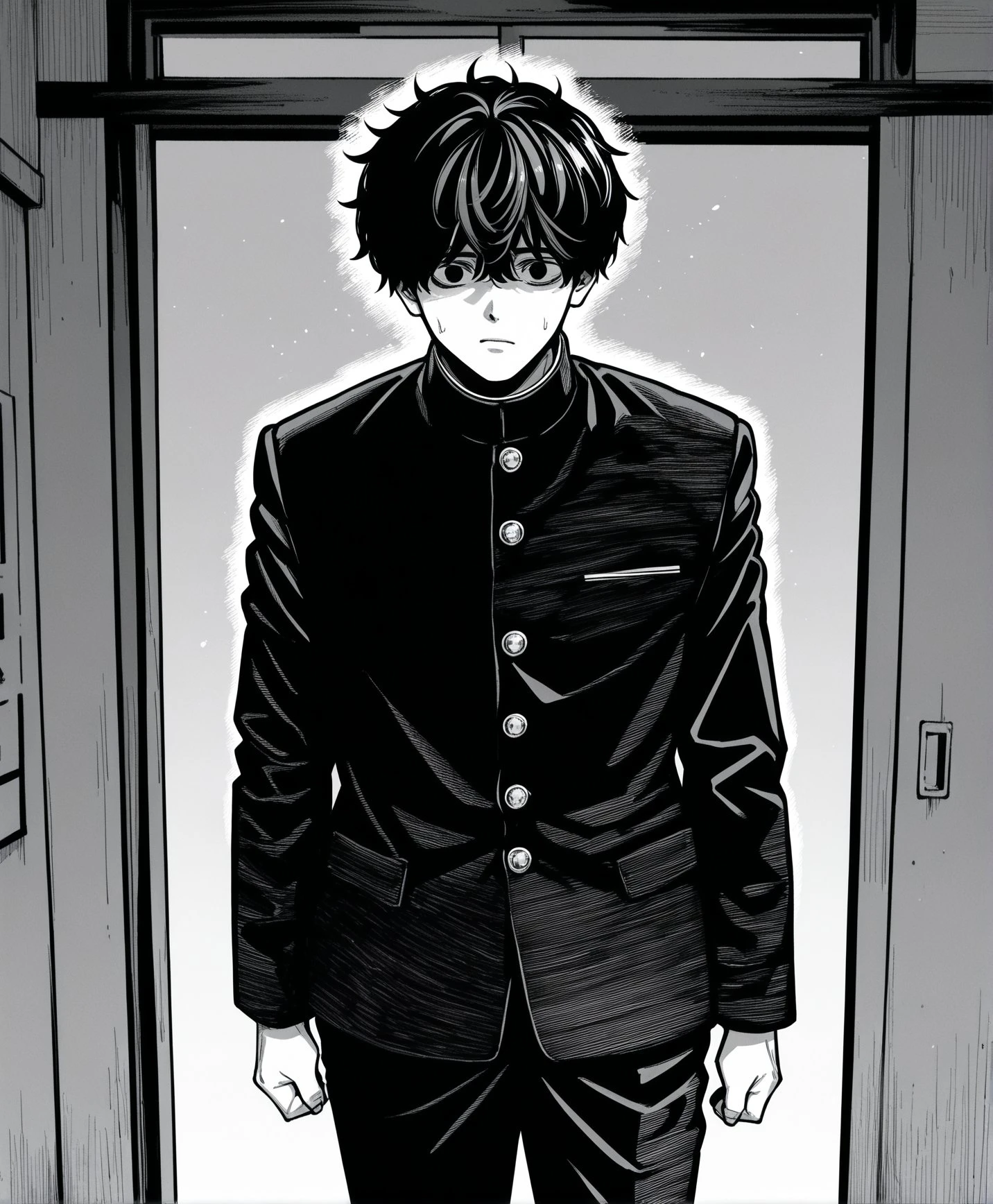 1boy,greyscale,male focus,black collared shirt, open shirt,