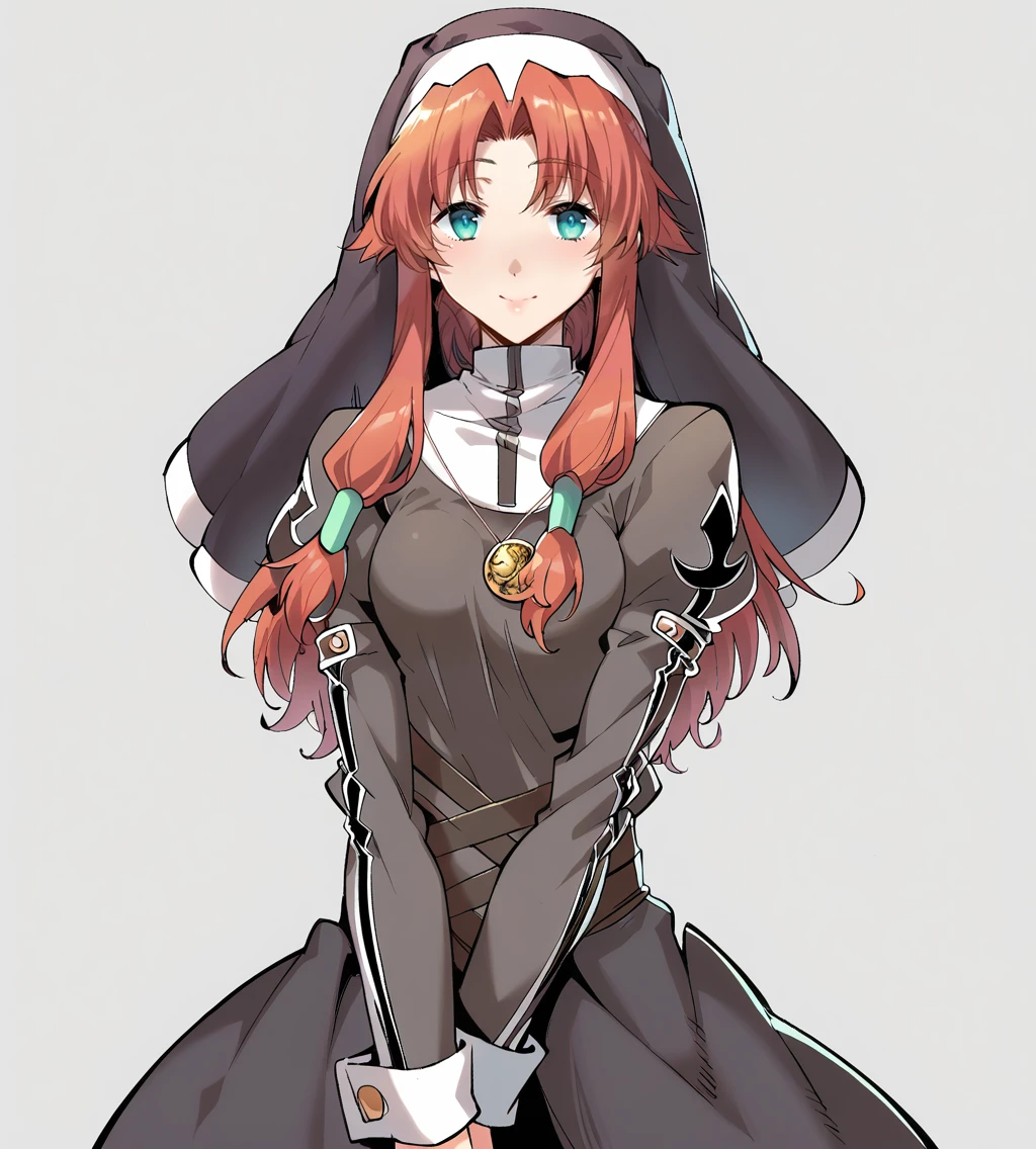 <lora:TrailsInTheSky-000023:0.9>, Ries Argent, aqua eyes, red hair, hair tubes, hair over shoulder, sidelocks, small breasts, nun outfit, long skirt, habit, large gold medallion,Scherazard Harvey