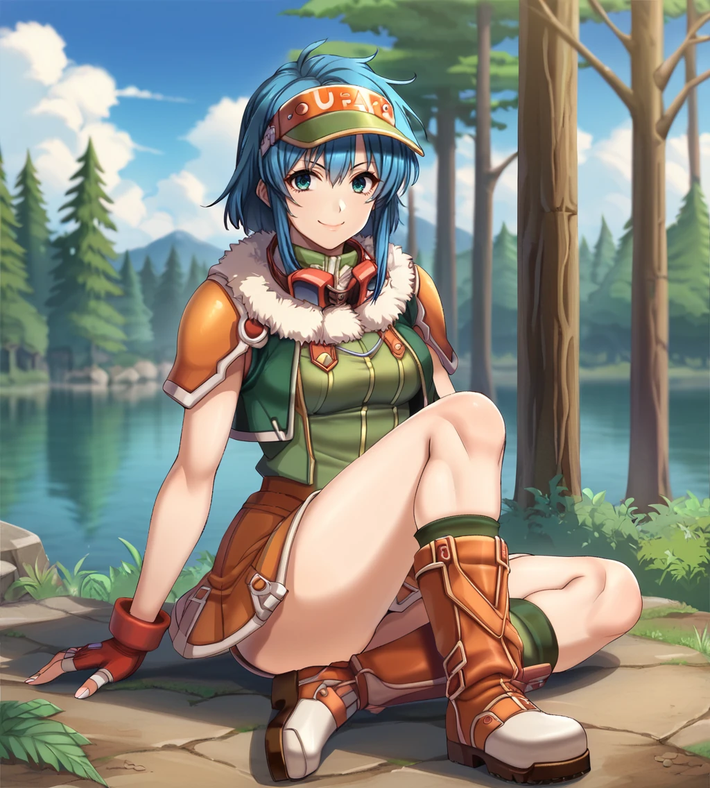 <lora:TrailsInTheSky-000023:0.9>, Josette Capua, blue hair, long hair, green eyes, medium breasts, visor cap, goggles around neck, green jacket, fur trim, shoulder armor, pauldron, orange miniskirt, boots, Julia Schwarz