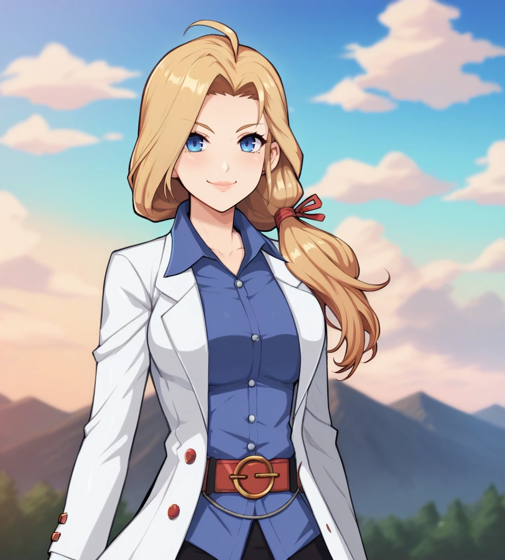 <lora:TrailsInTheSky-000023:0.9>, Erika Russell, blonde hair, long hair, hair over shoulder, blue eyes, red ribbon in hair, medium breasts, white labcoat, blue shirt, long black skirt, pantyhose, red high heels,Josette Capua