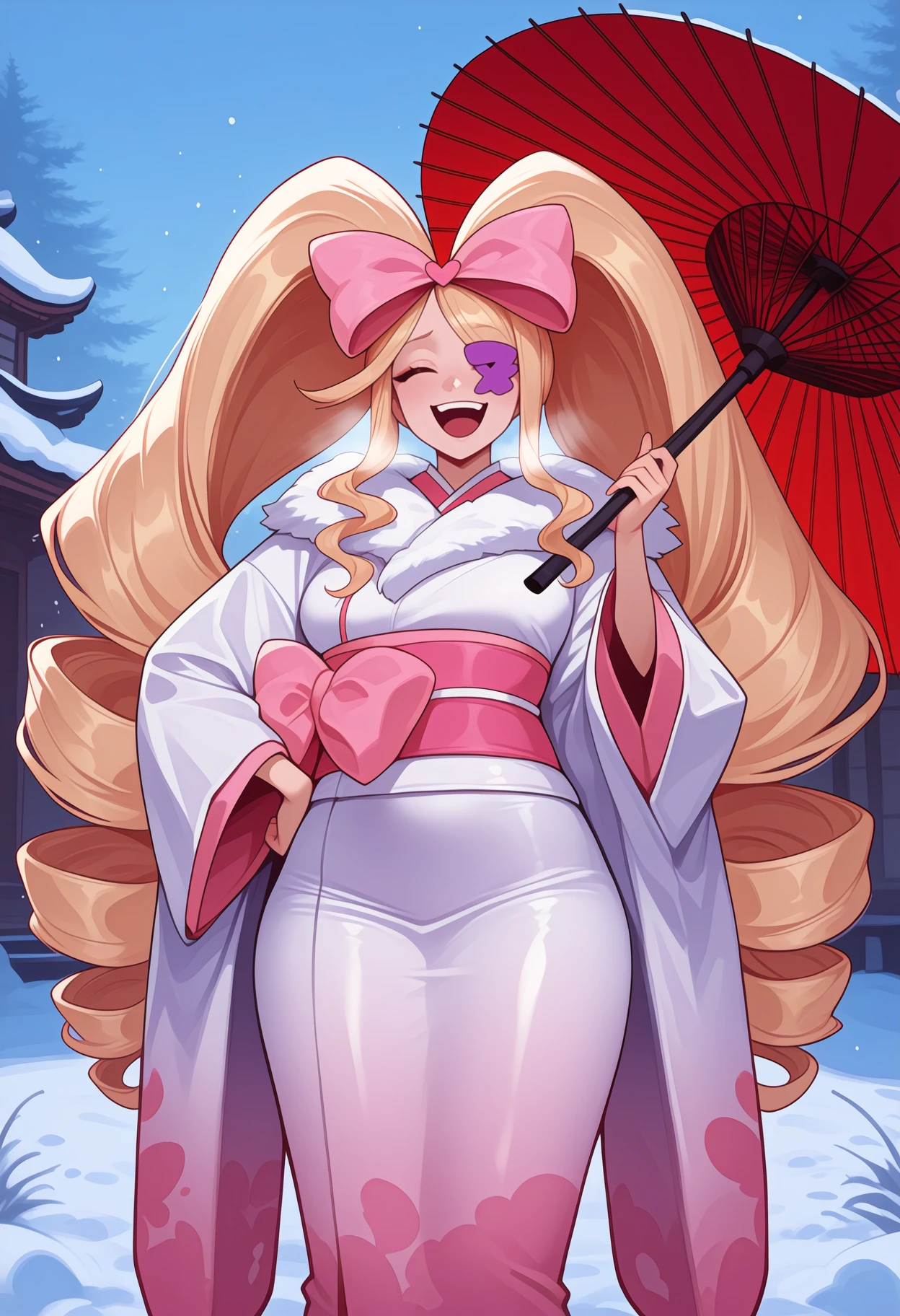 Appearance: long hair, blonde hair, big hair, twin drills, hair bow, pink bow, huge bow, blue eyes, eyepatch