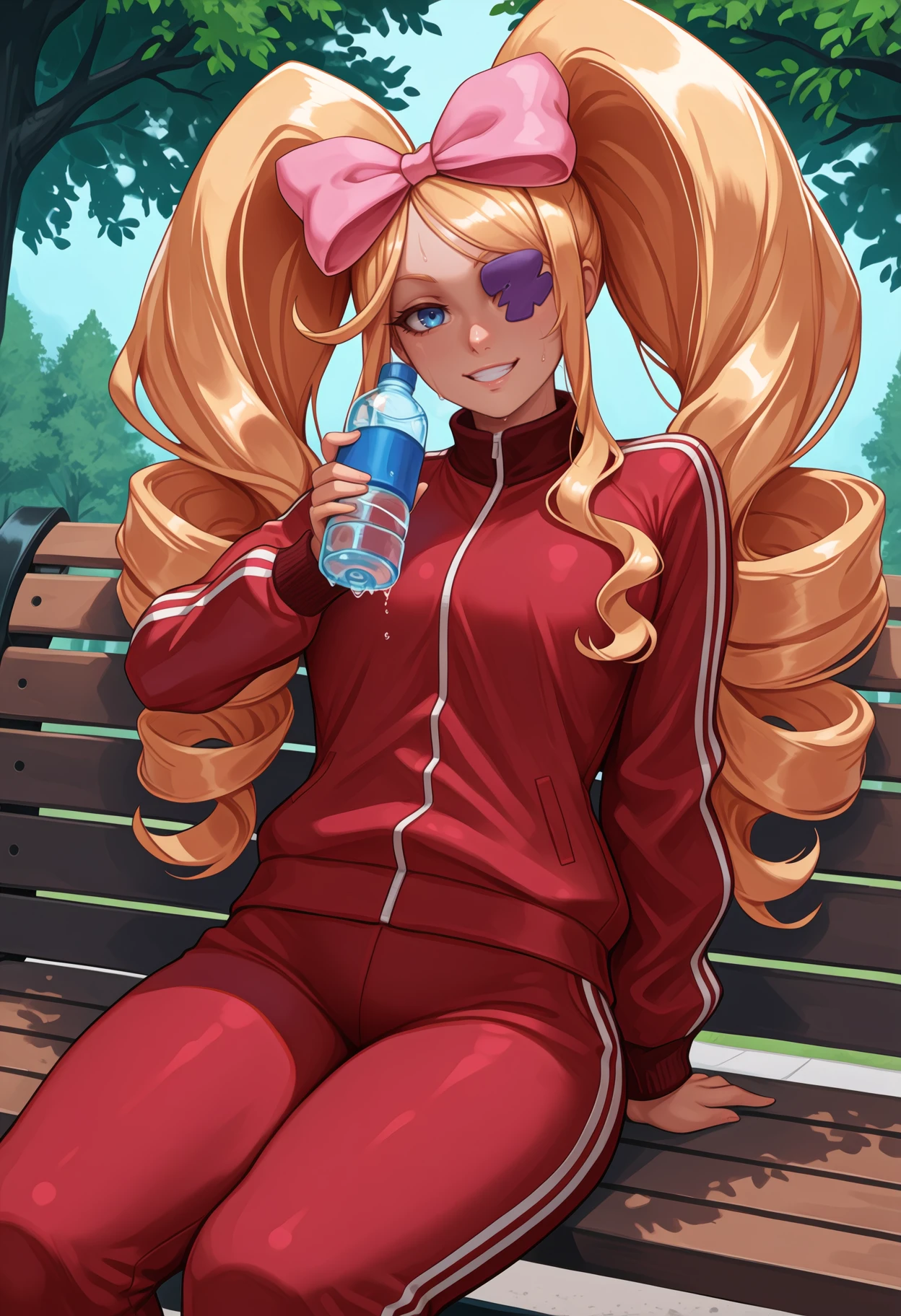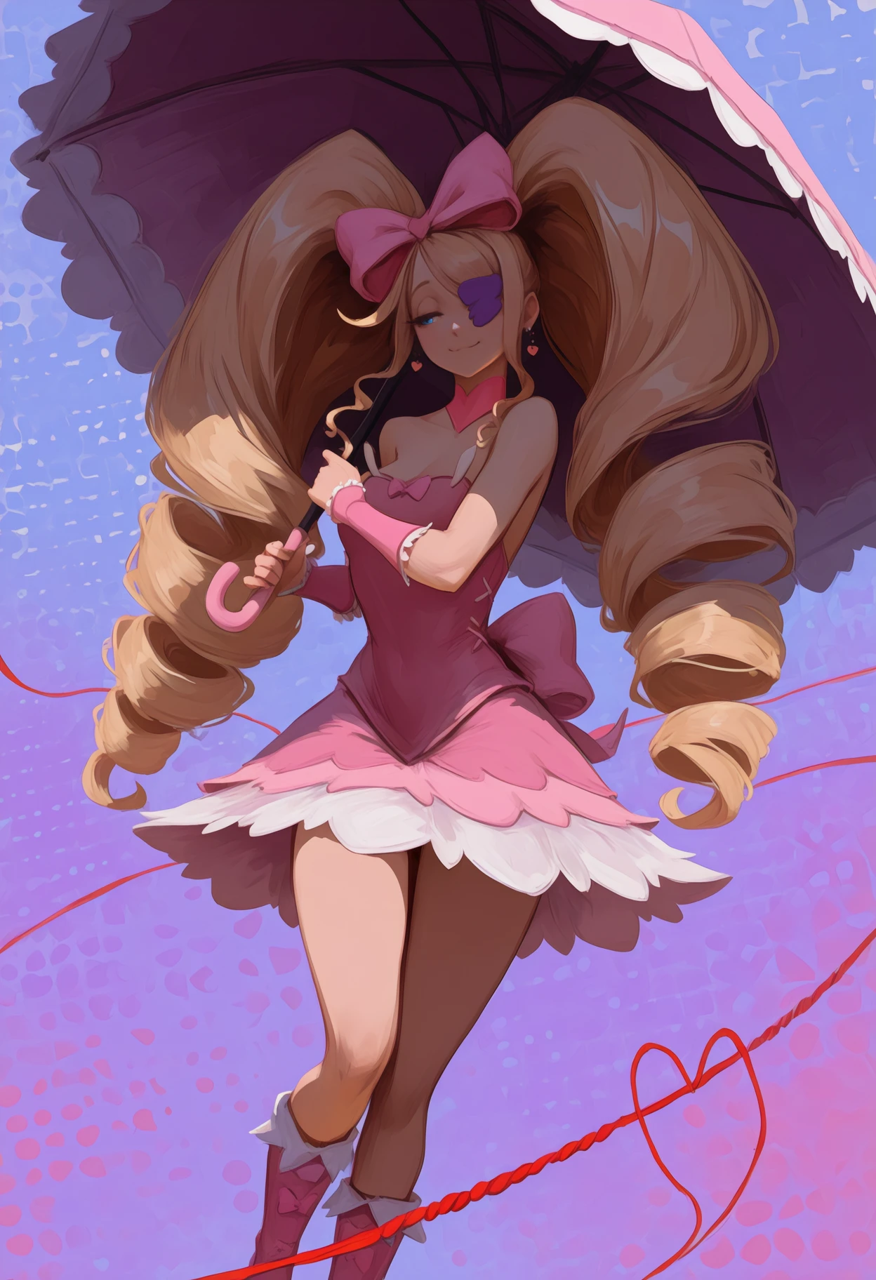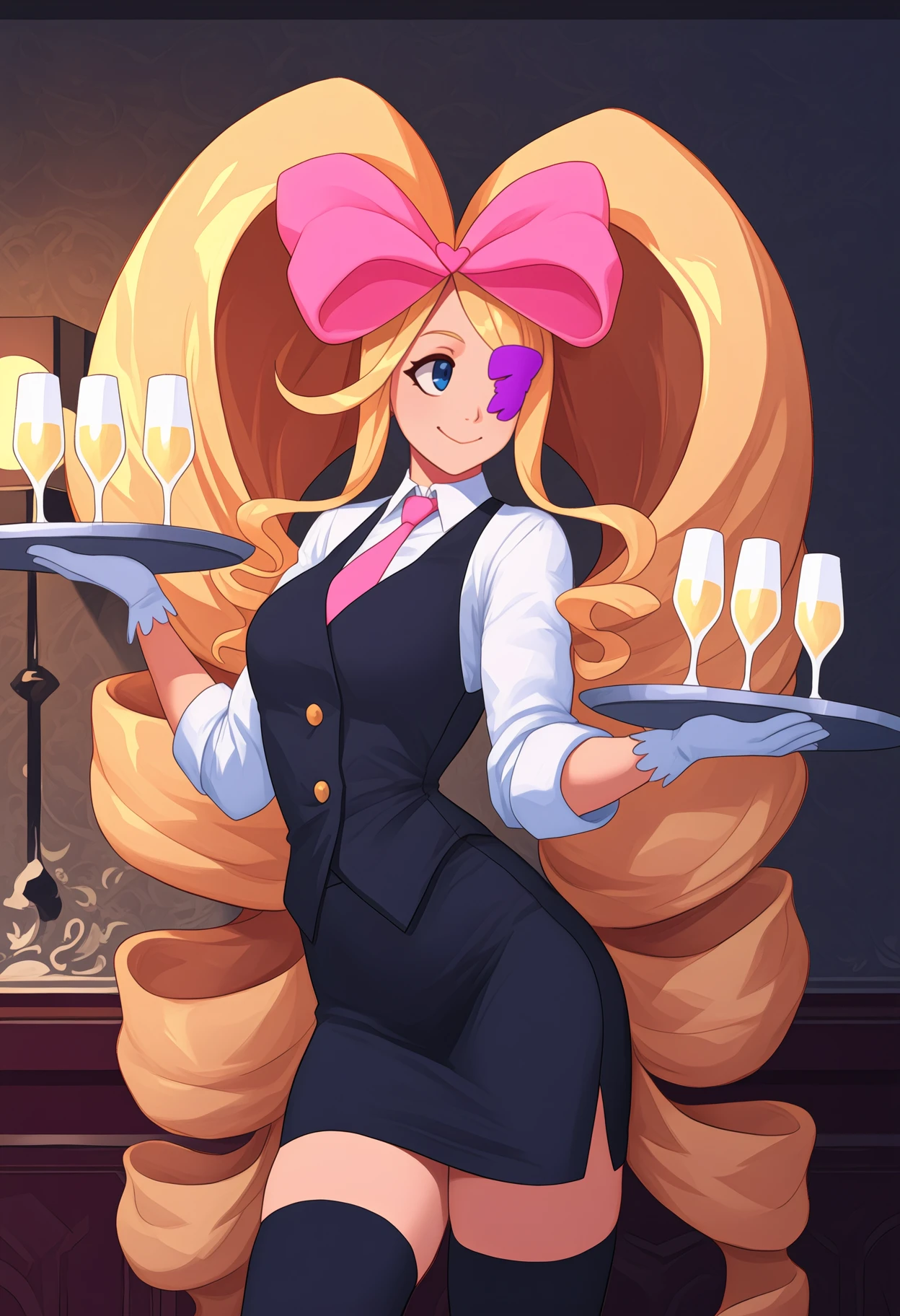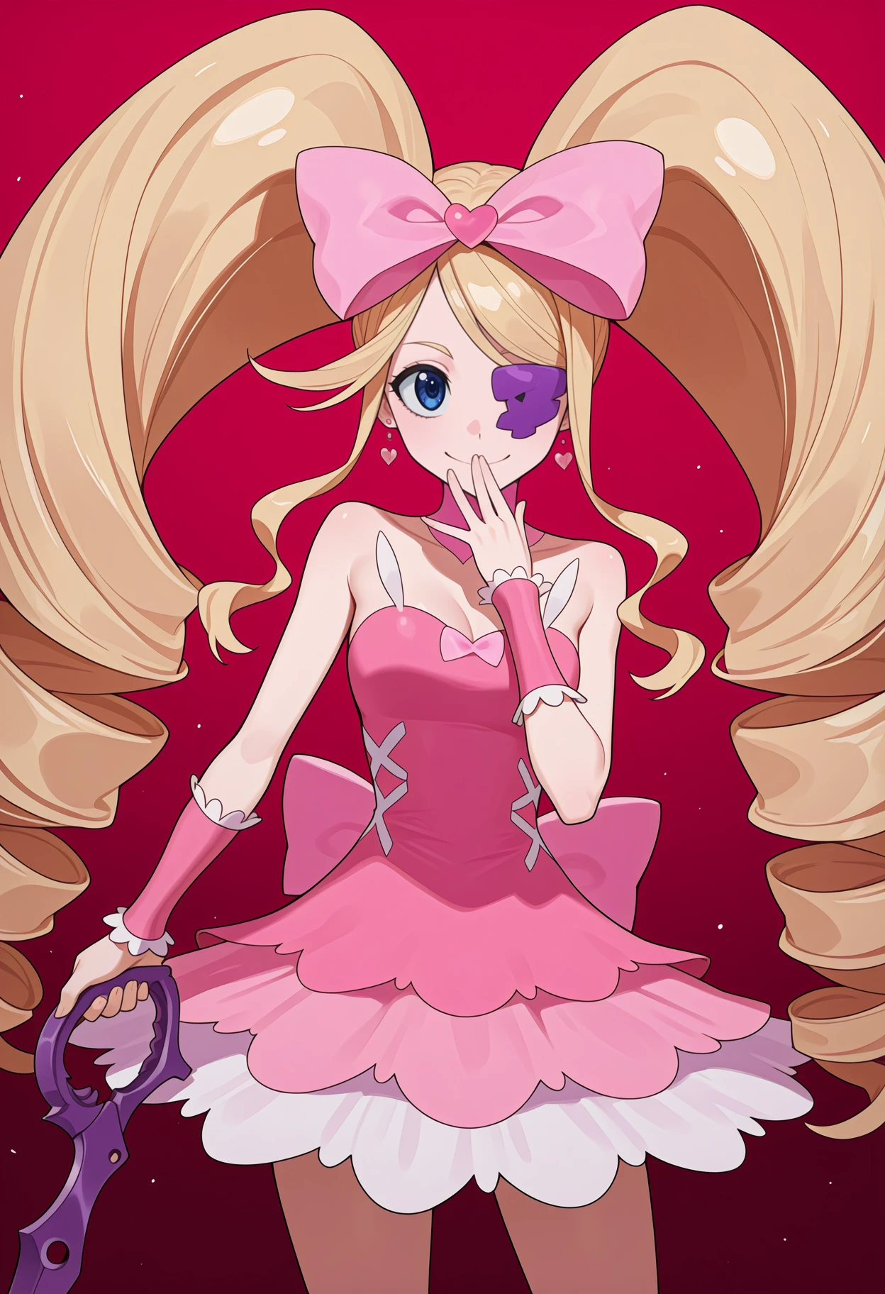 long hair, blonde hair, big hair, twin drills, hair bow, pink bow, huge bow, blue eyes, eyepatch
