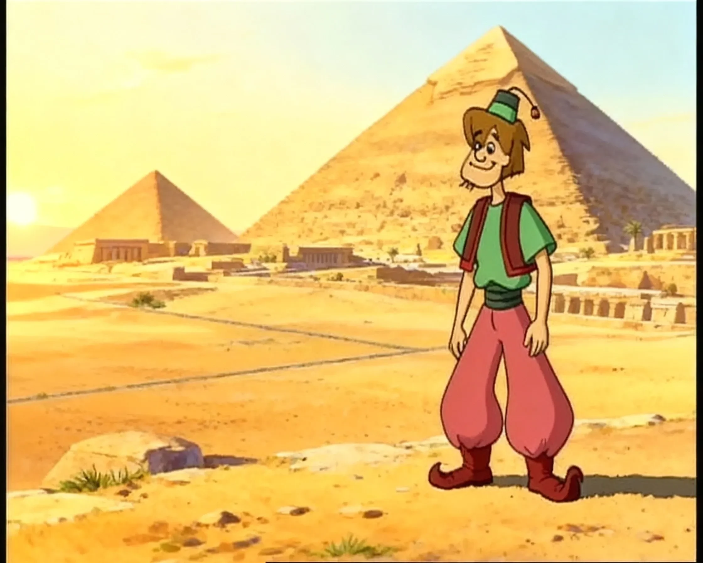Shaggy,1boy,solo,fair skin, green eyes, brown hair, short hair, smile, closed mouth, green sleeveless vest with red trim, , pink baggy pants, red boots, red fez