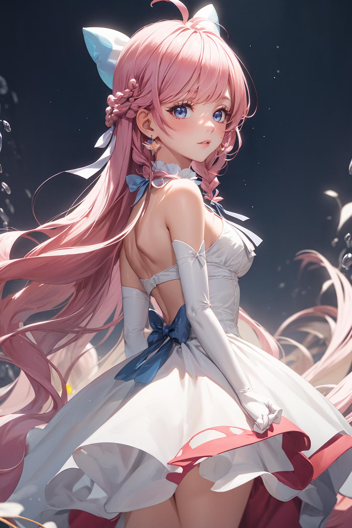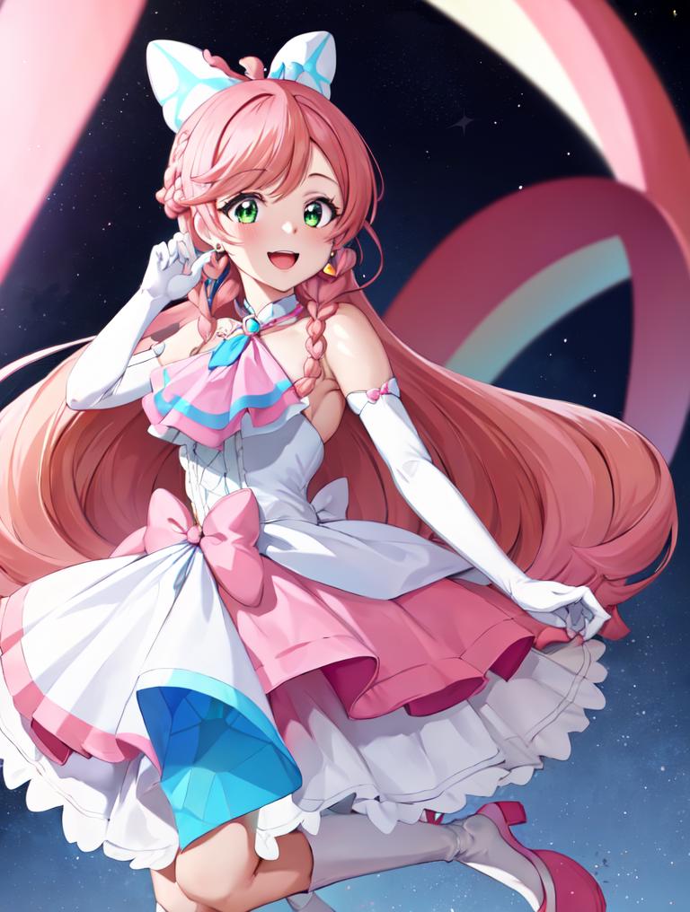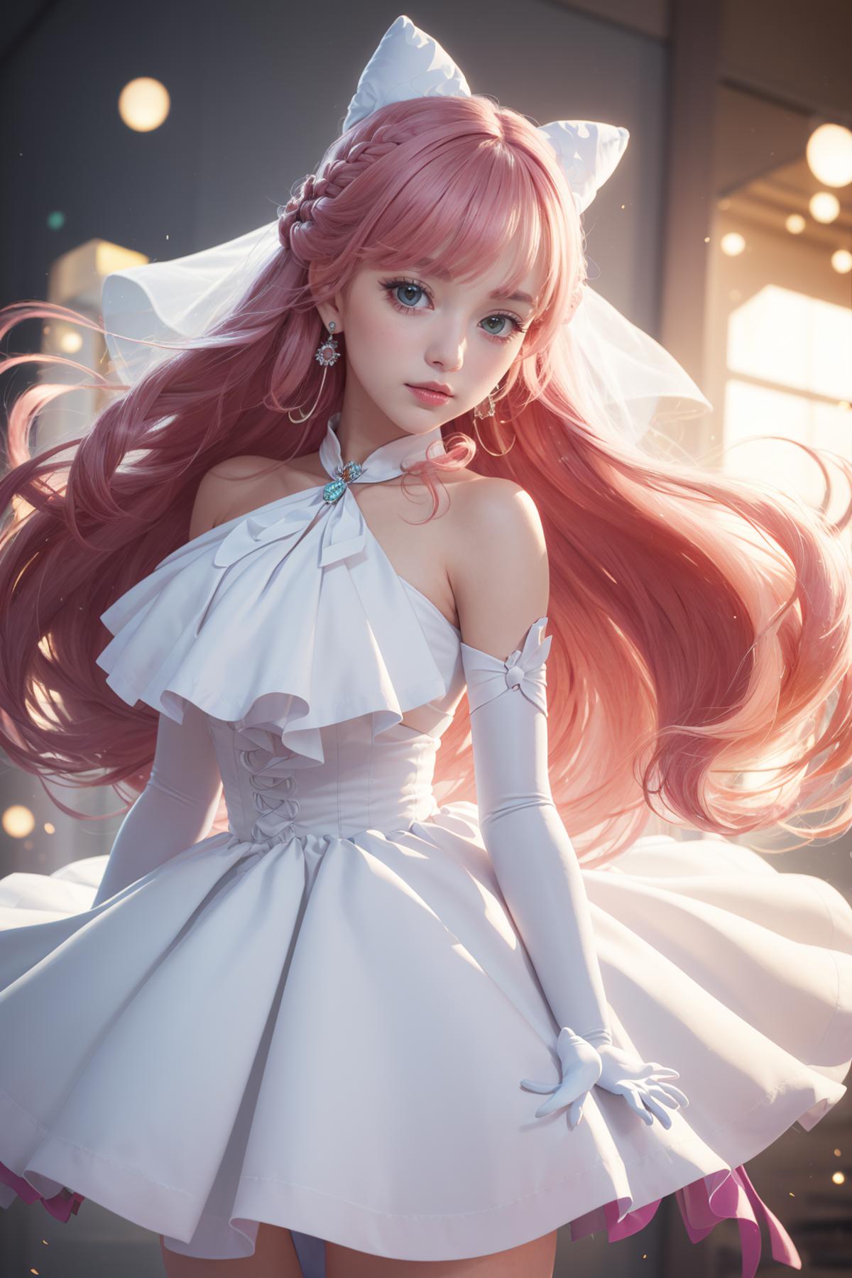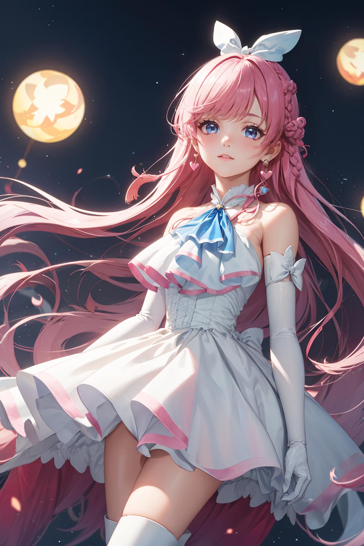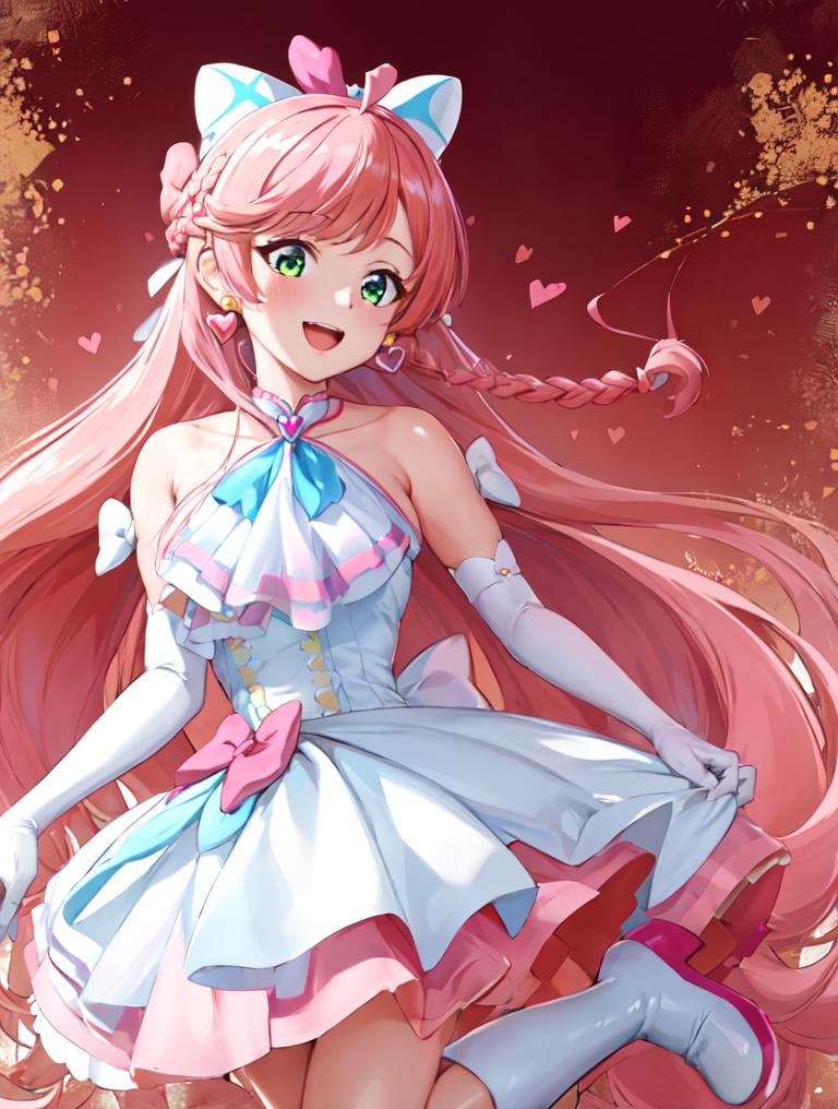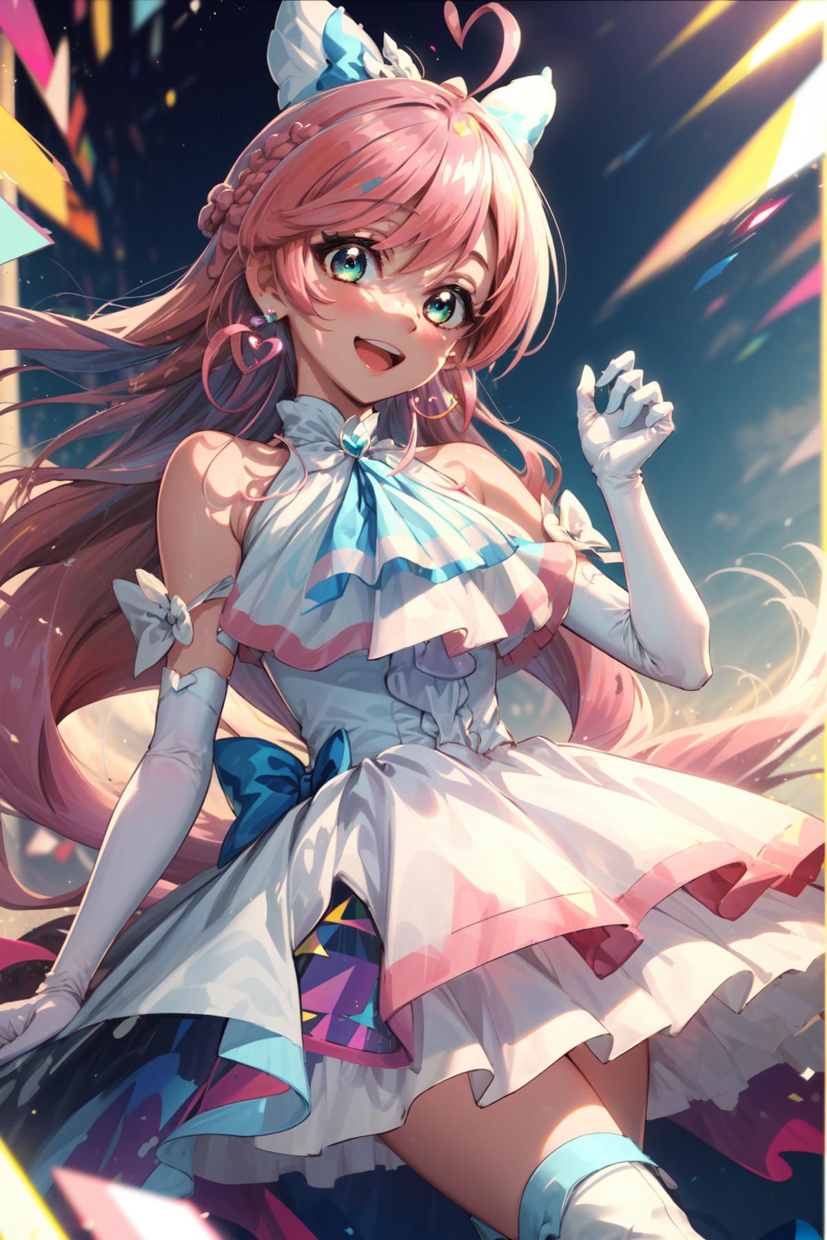 pink hair, long hair, side braid, white ascot, white boots, elbow gloves, hair ribbon, earrings, layered skirt, heart ahoge, sleeveless
