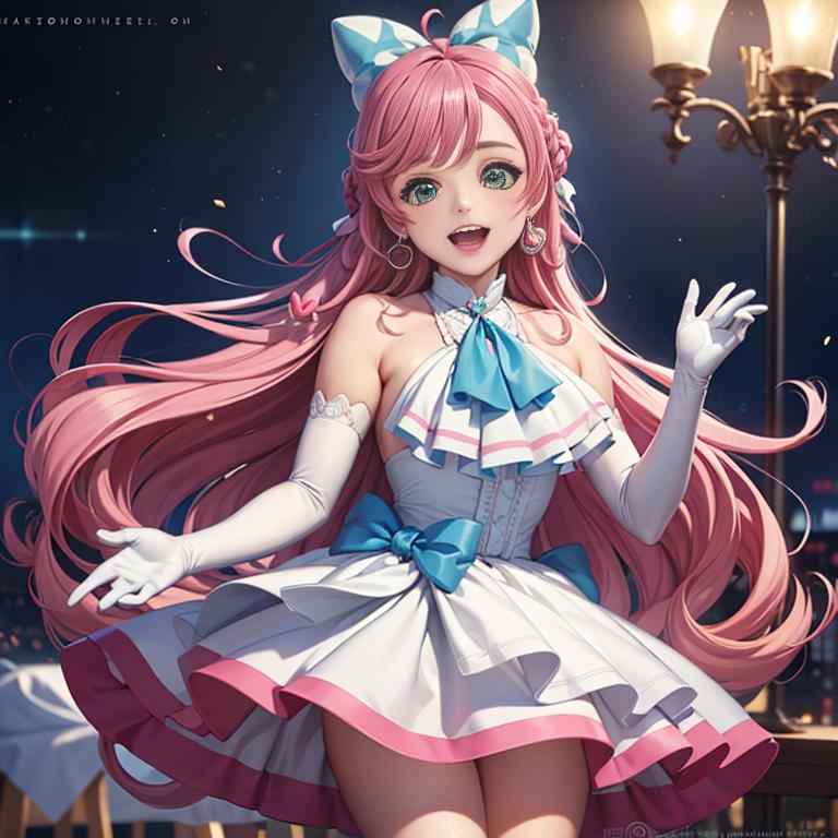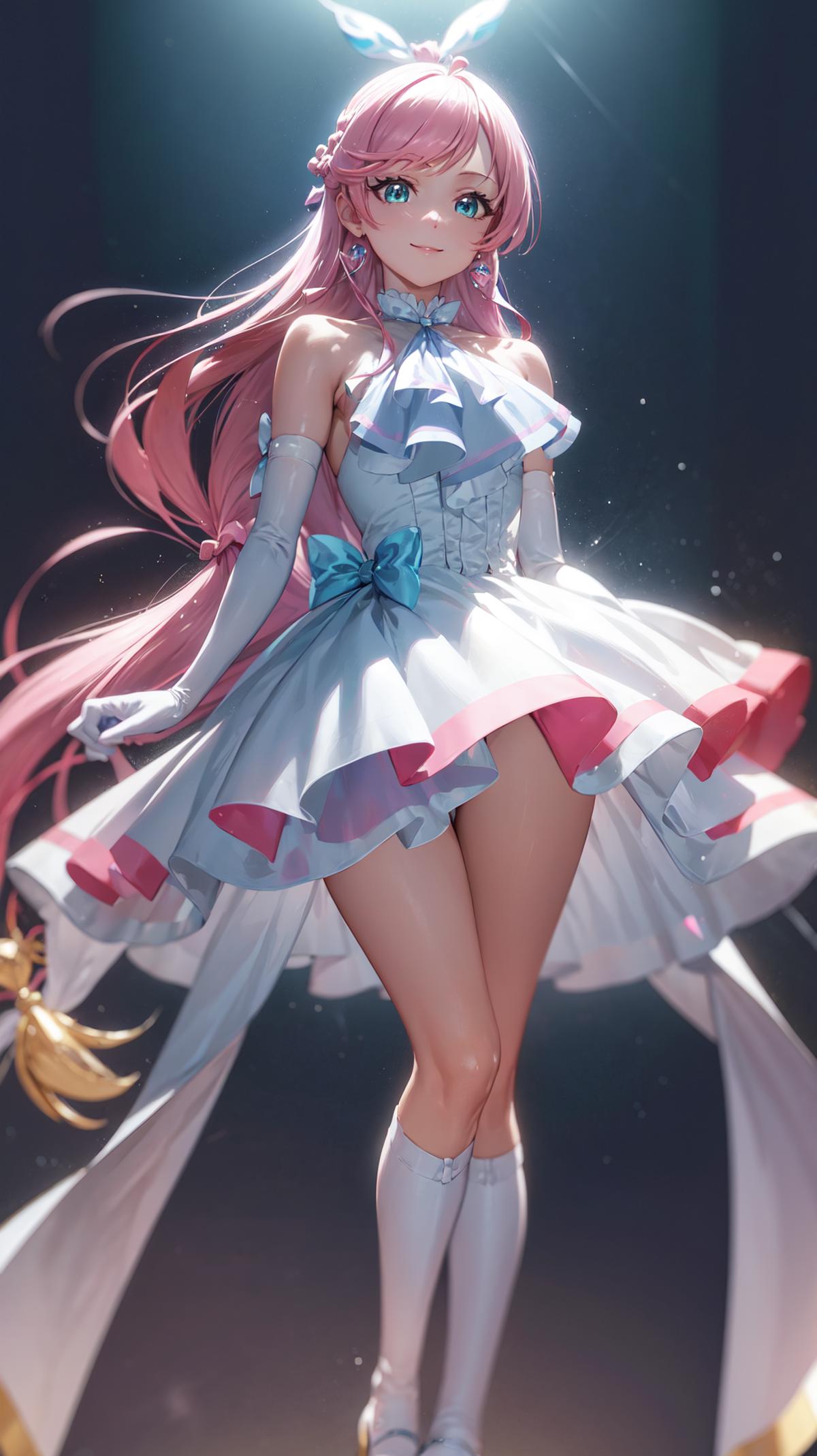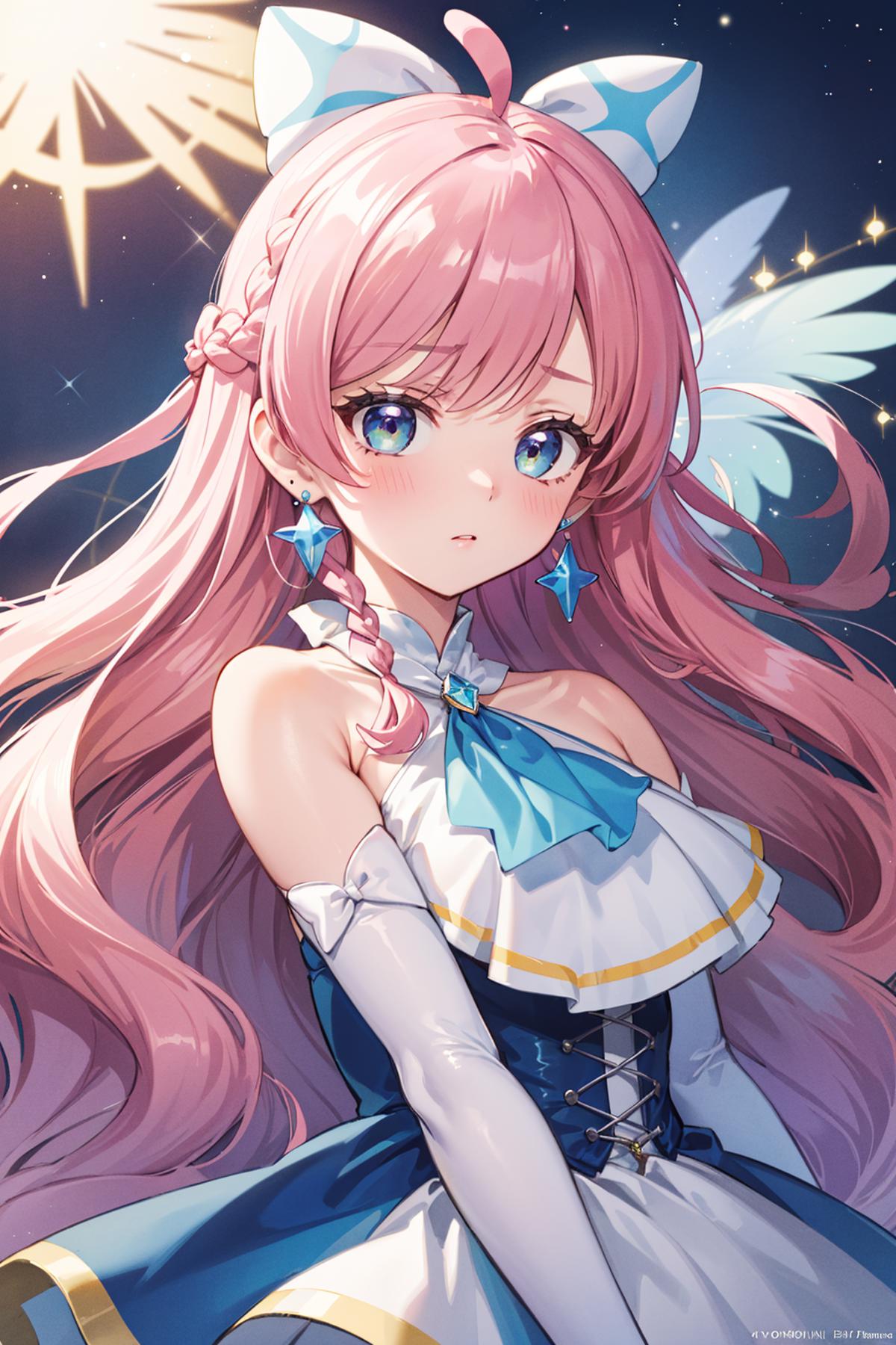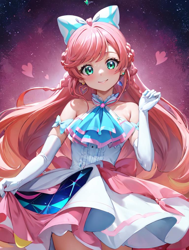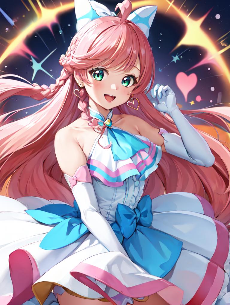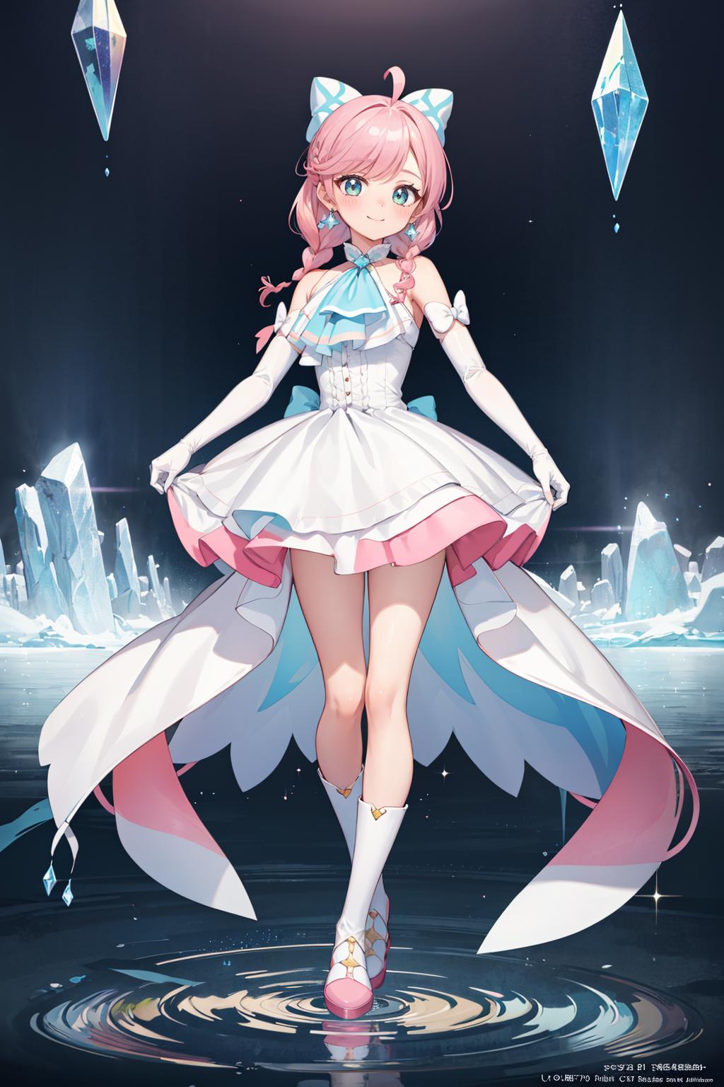 pink hair, long hair, side braid, white ascot, white boots, elbow gloves, hair ribbon, earrings, layered skirt, heart ahoge, sleeveless