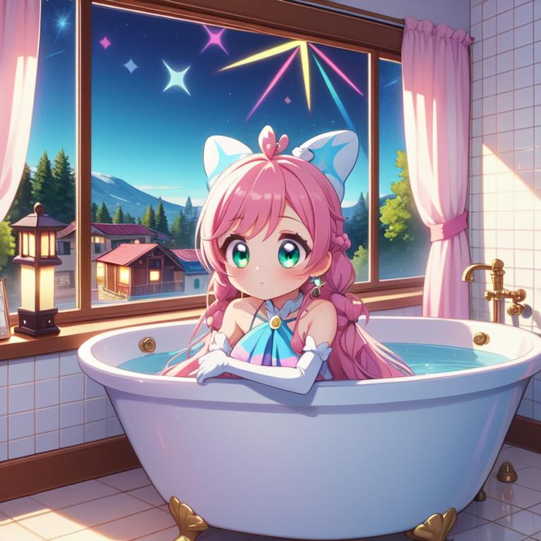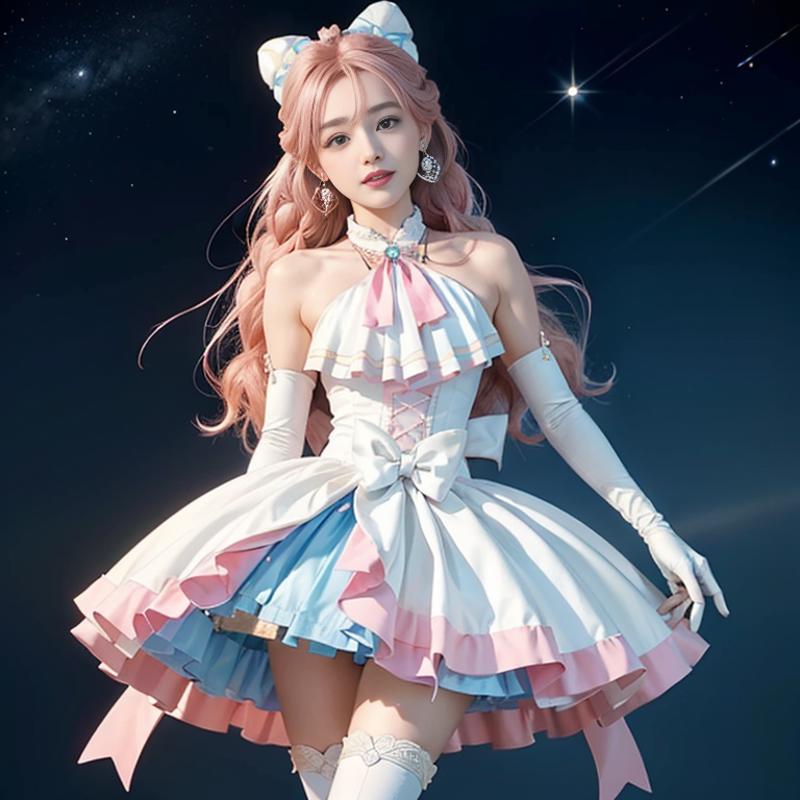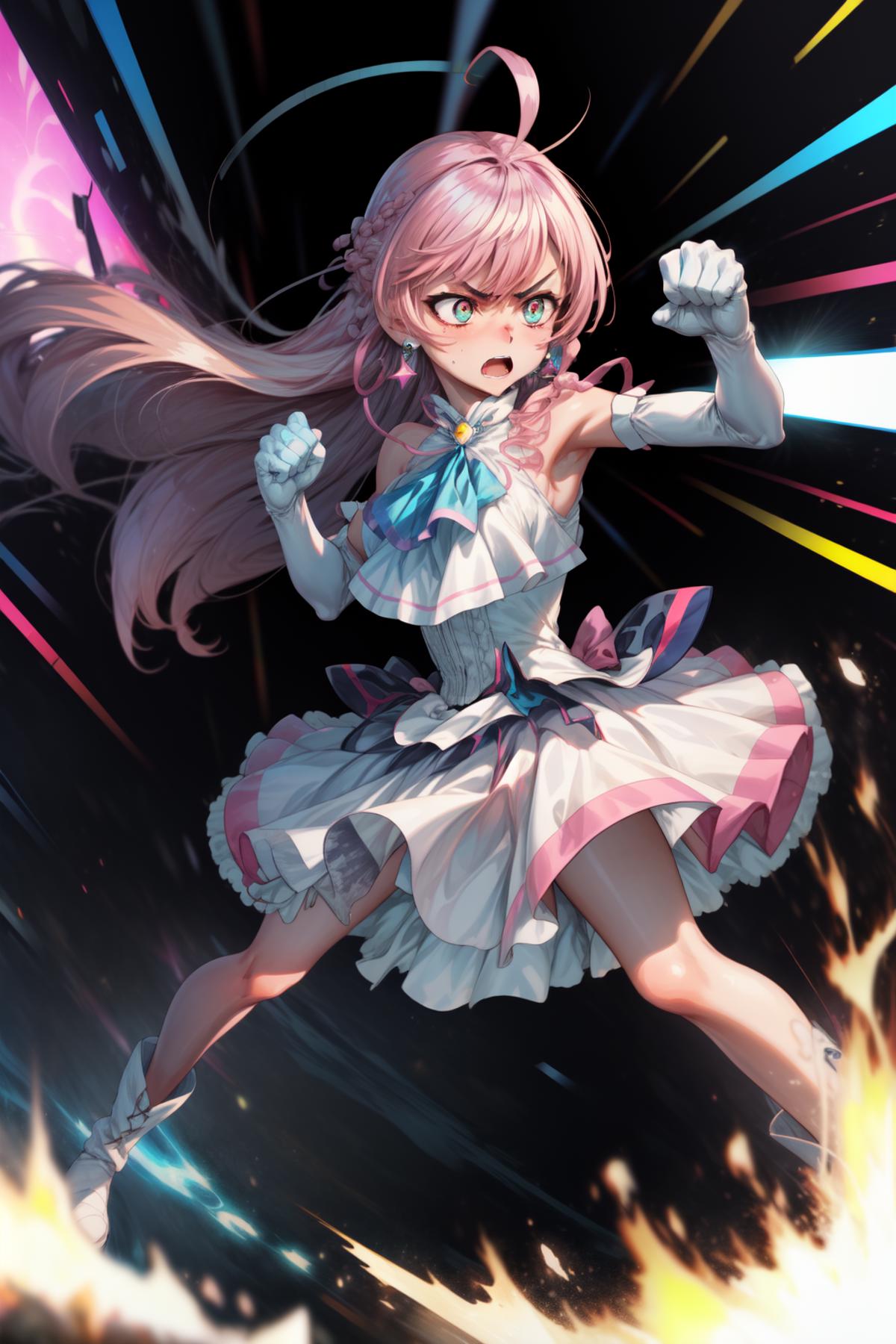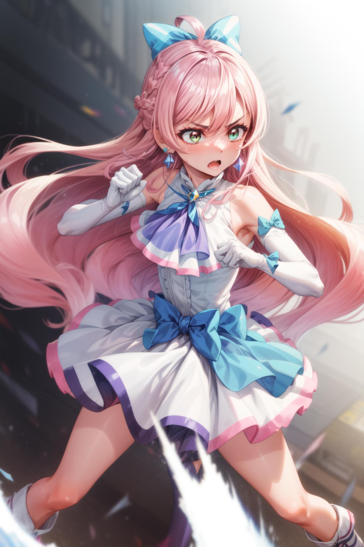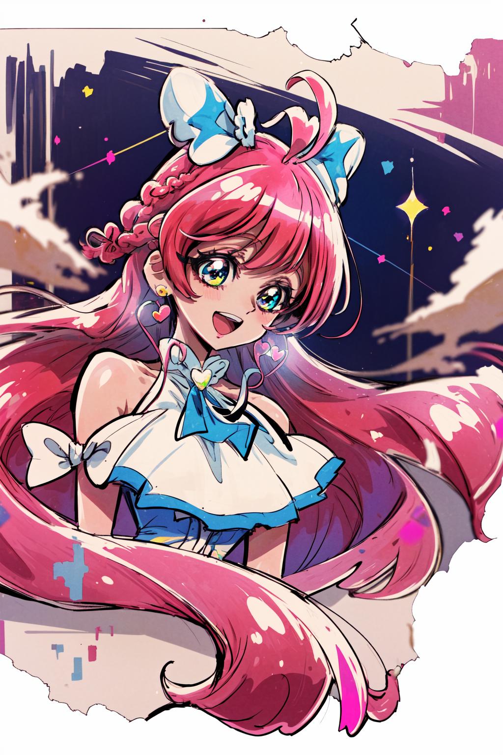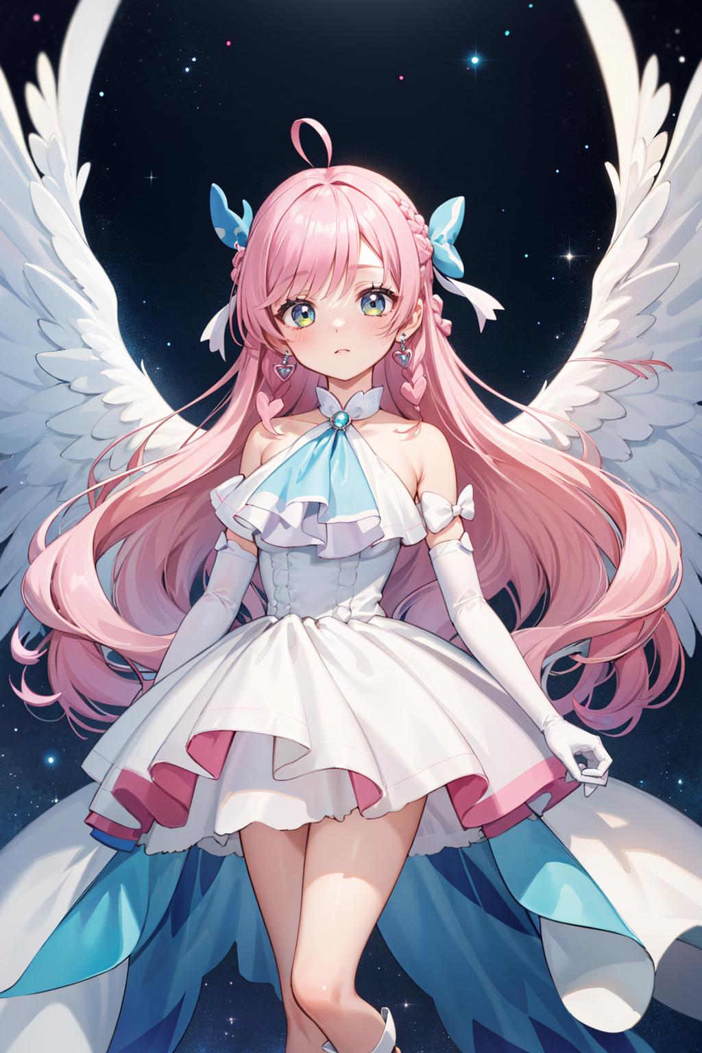 pink hair, long hair, side braid, white ascot, white boots, elbow gloves, hair ribbon, earrings, layered skirt, heart ahoge, sleeveless
