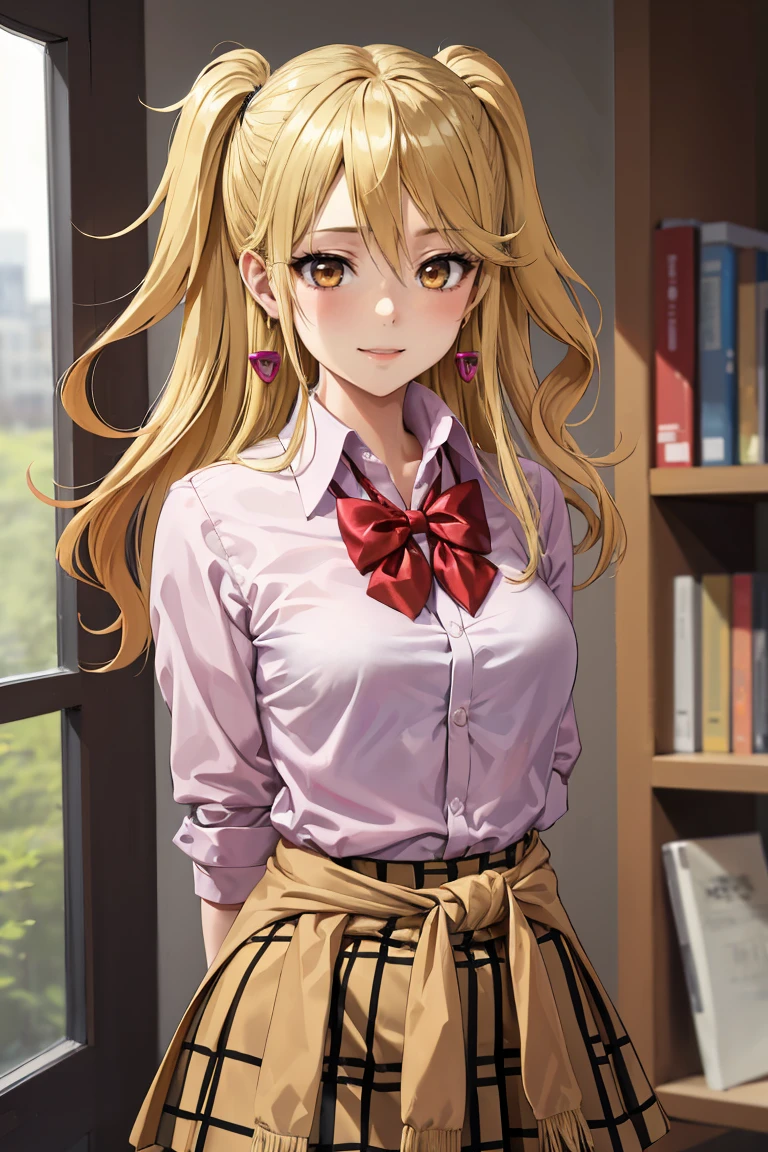 YuzuAihara, blonde hair, long hair, two side up, earrings, red bowtie, collared shirt, pink shirt, brown skirt, plaid skirt, clothes around waistLet me know if you have any issues.