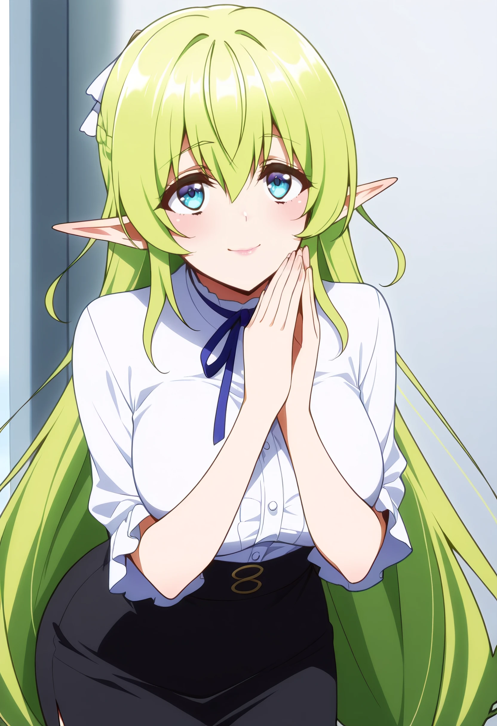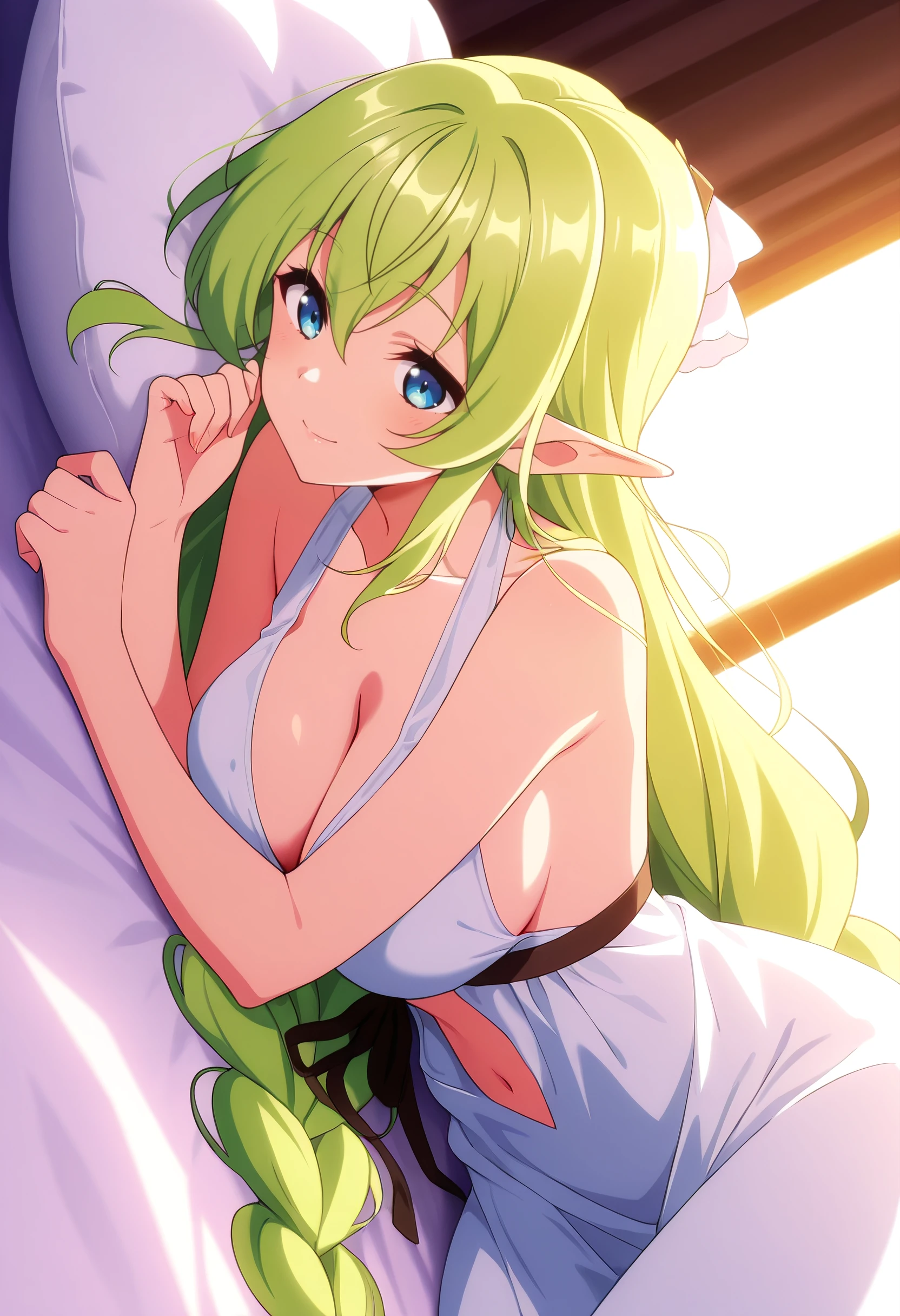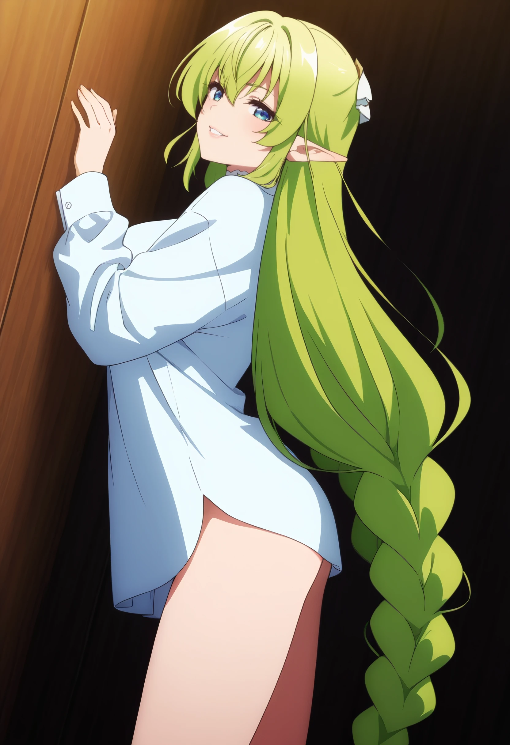 CKWLyrule, elf, green hair, pointy ears, braid, twin braids, hair between eyes, blue eyes, eyebrows visible through hair, bangs, very long hair, absurdly long hair, long pointy ears,