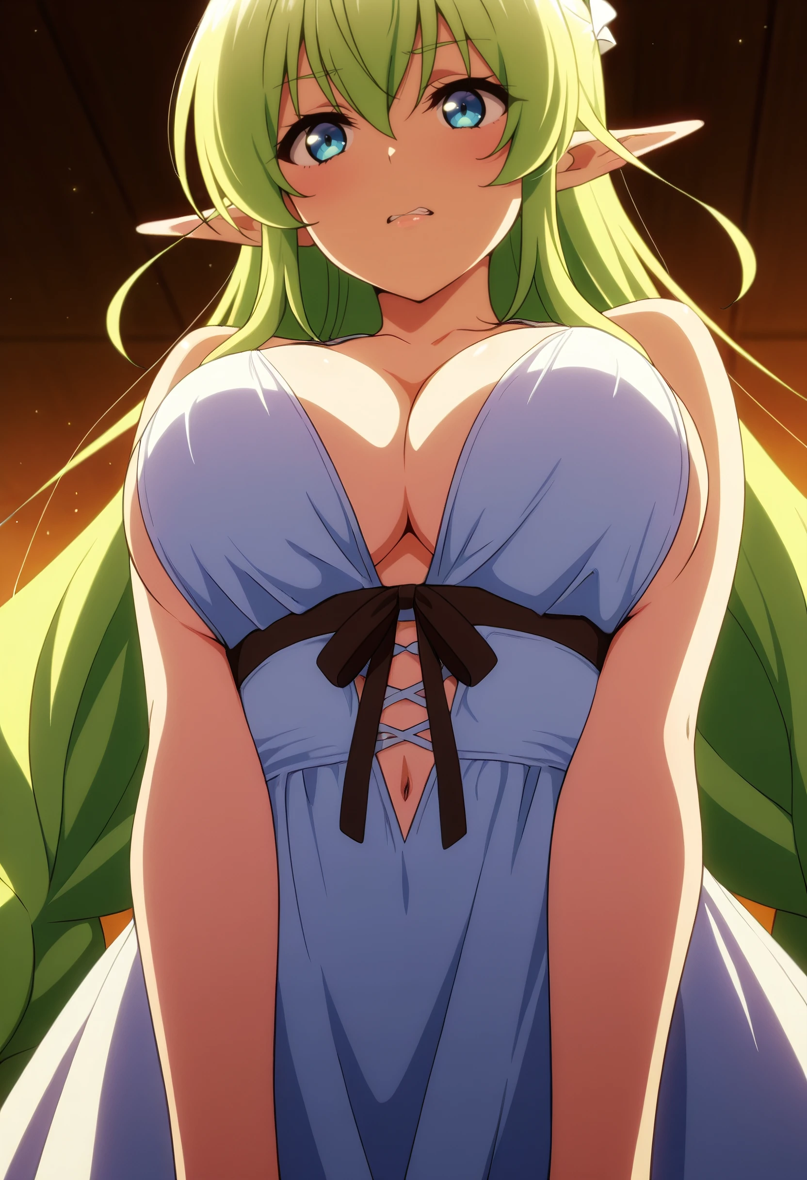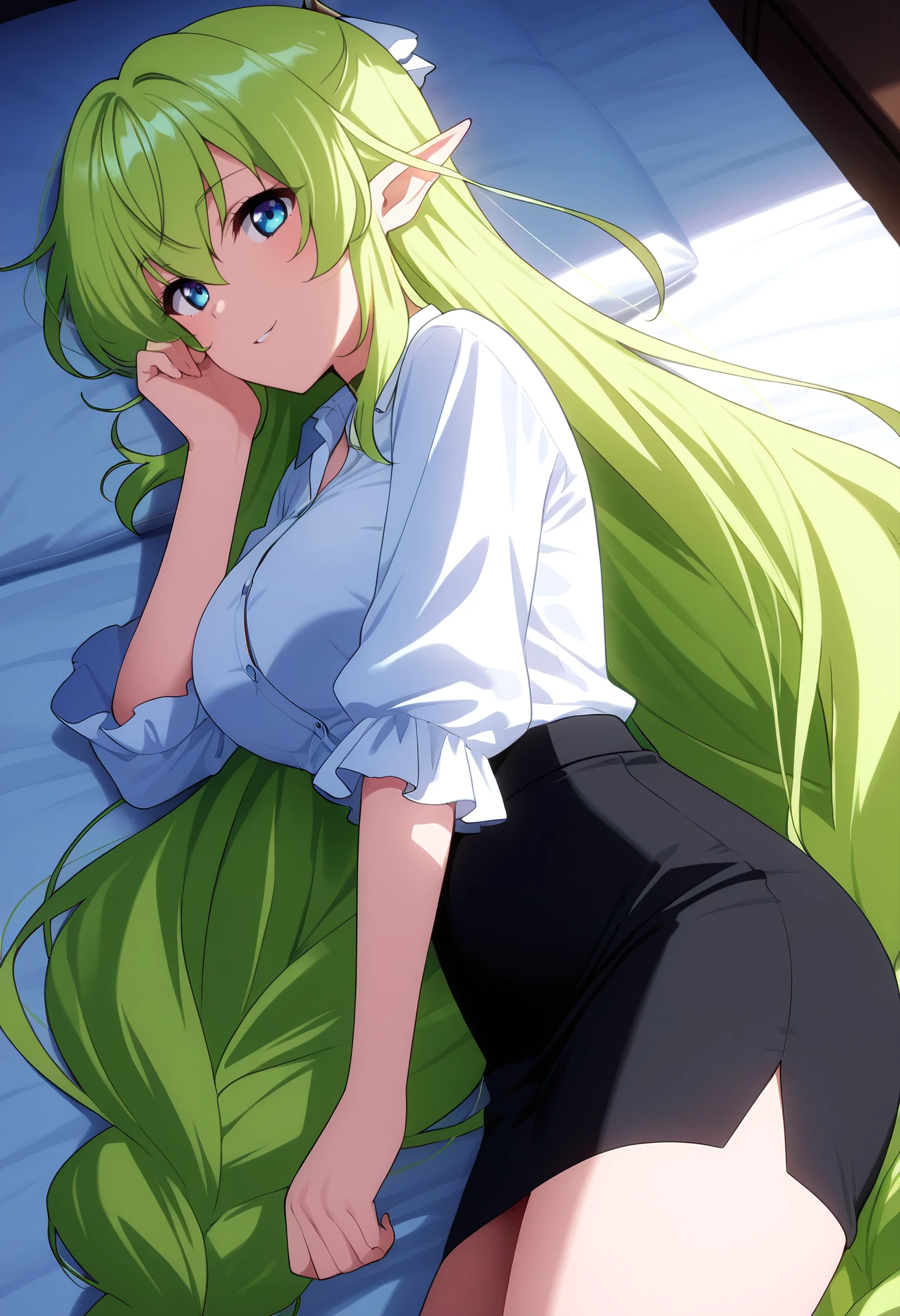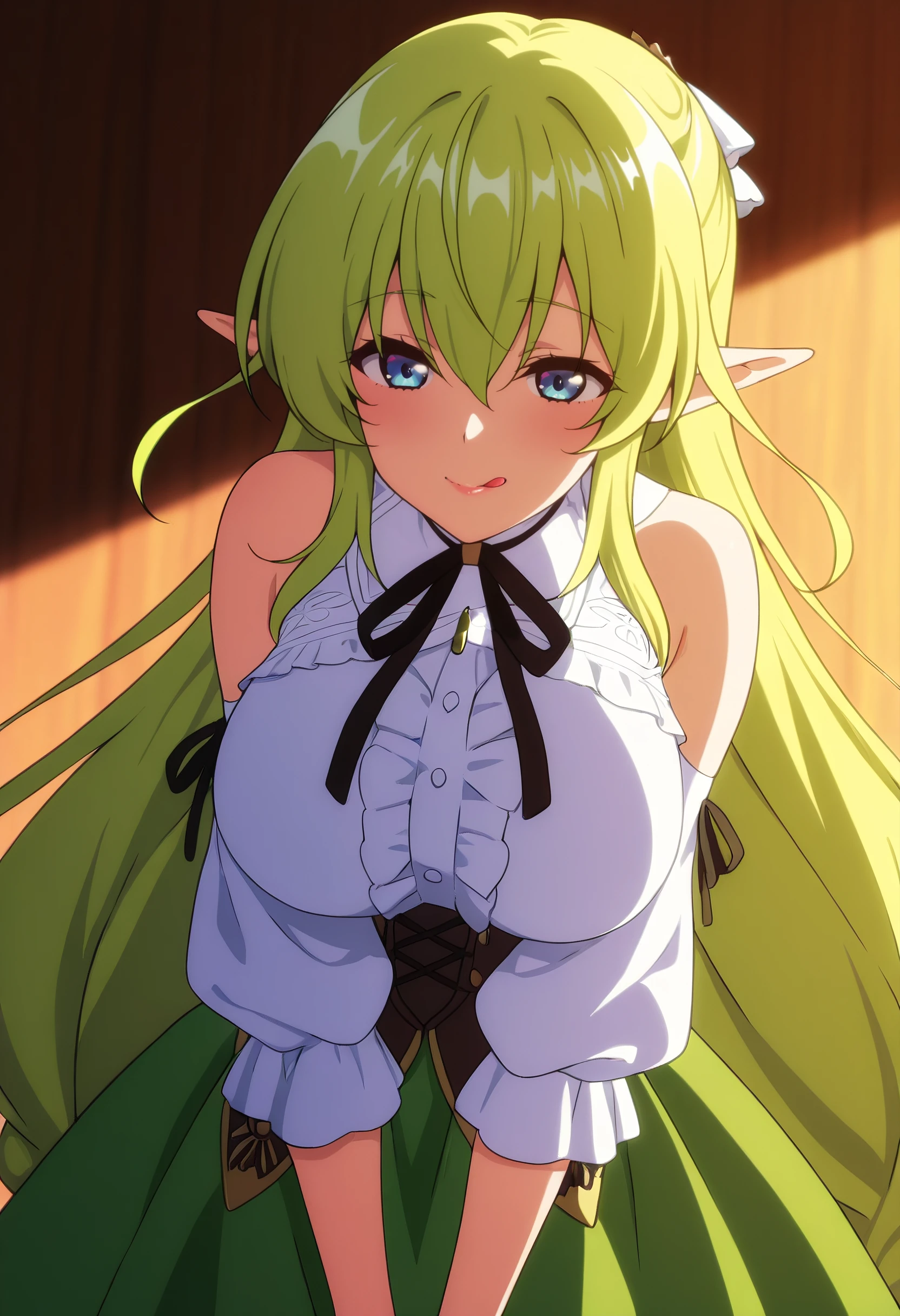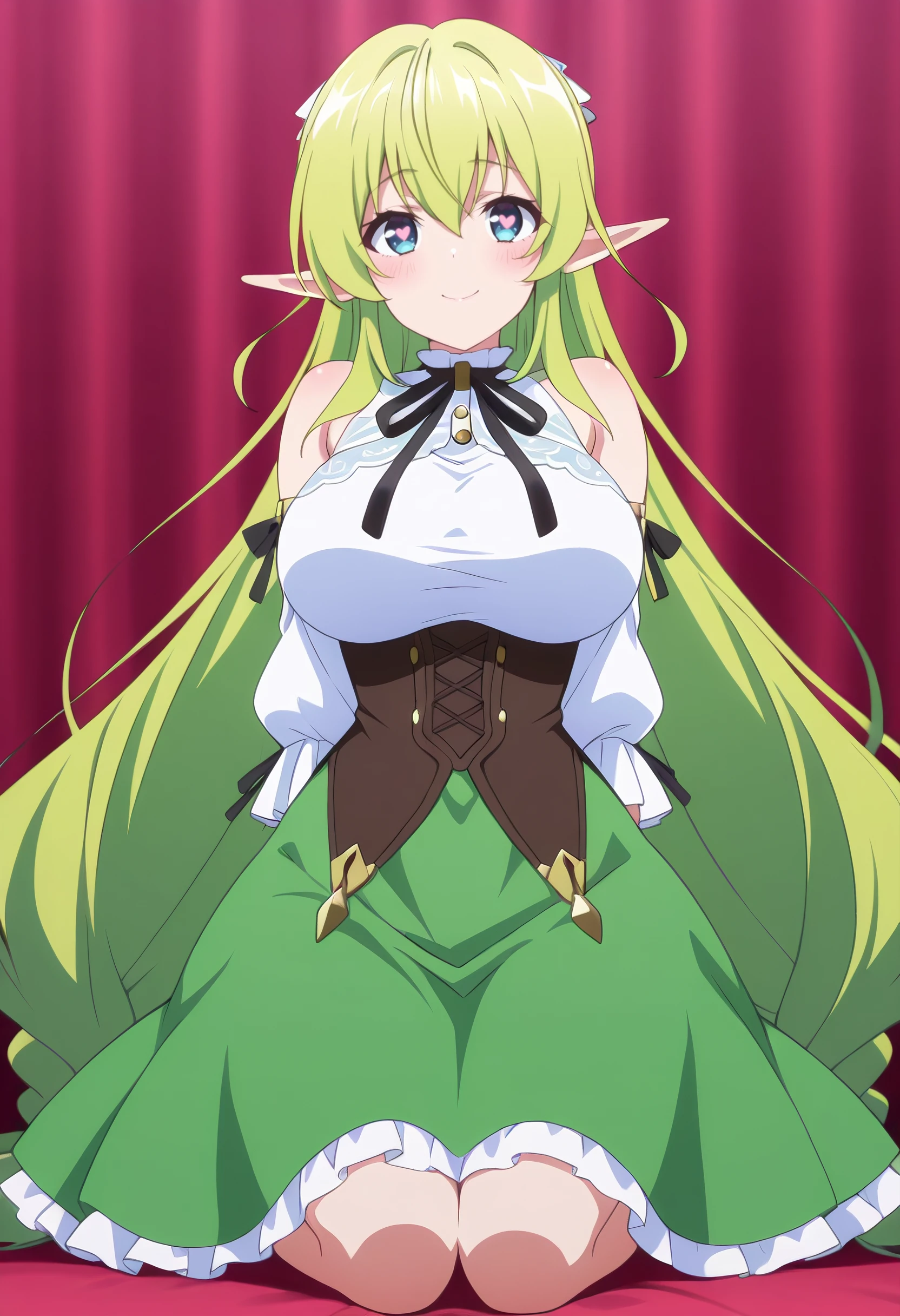 CKWLyrule, elf, green hair, pointy ears, braid, twin braids, hair between eyes, blue eyes, eyebrows visible through hair, bangs, very long hair, absurdly long hair, long pointy ears,
