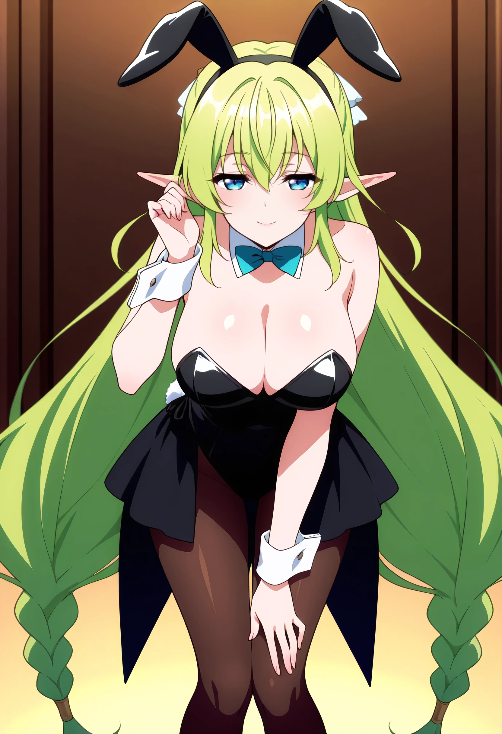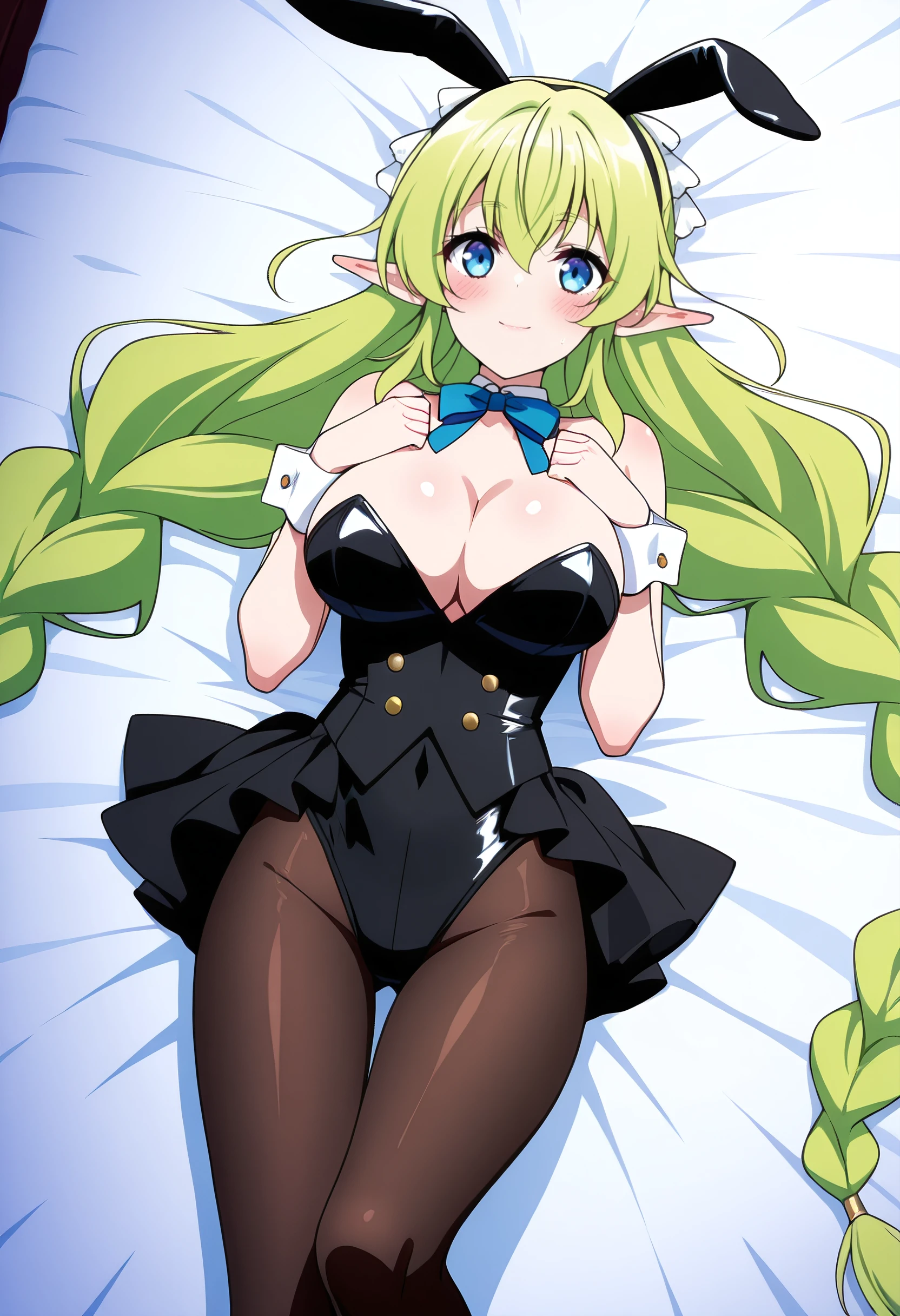 LyruleBunnysuit, animal ears, bare shoulders, bow, bowtie, cleavage, detached collar, wrist cuffs, leotard, pantyhose, playboy bunny, rabbit ears, ribbon, black leotard, fake animal ears, black skirt, blue ribbon, skirt, sleeveless, brown legwear,