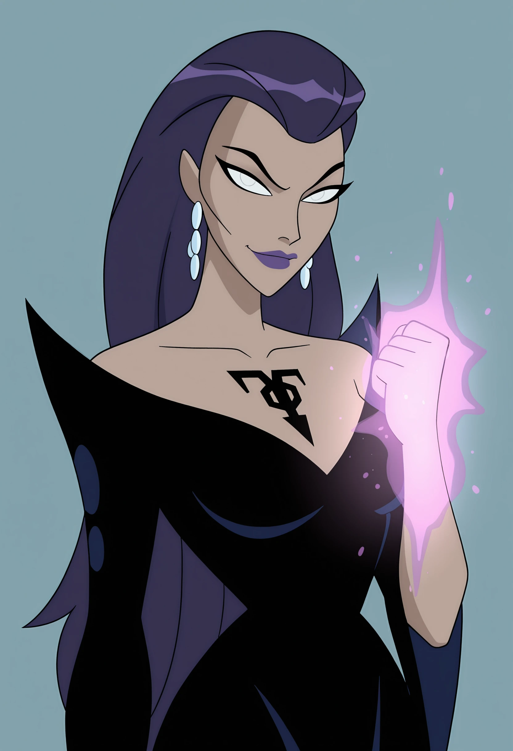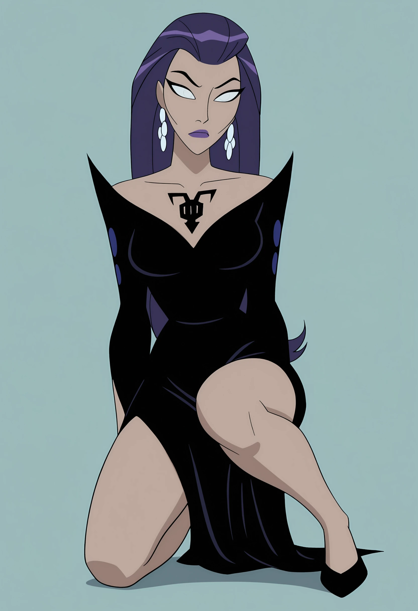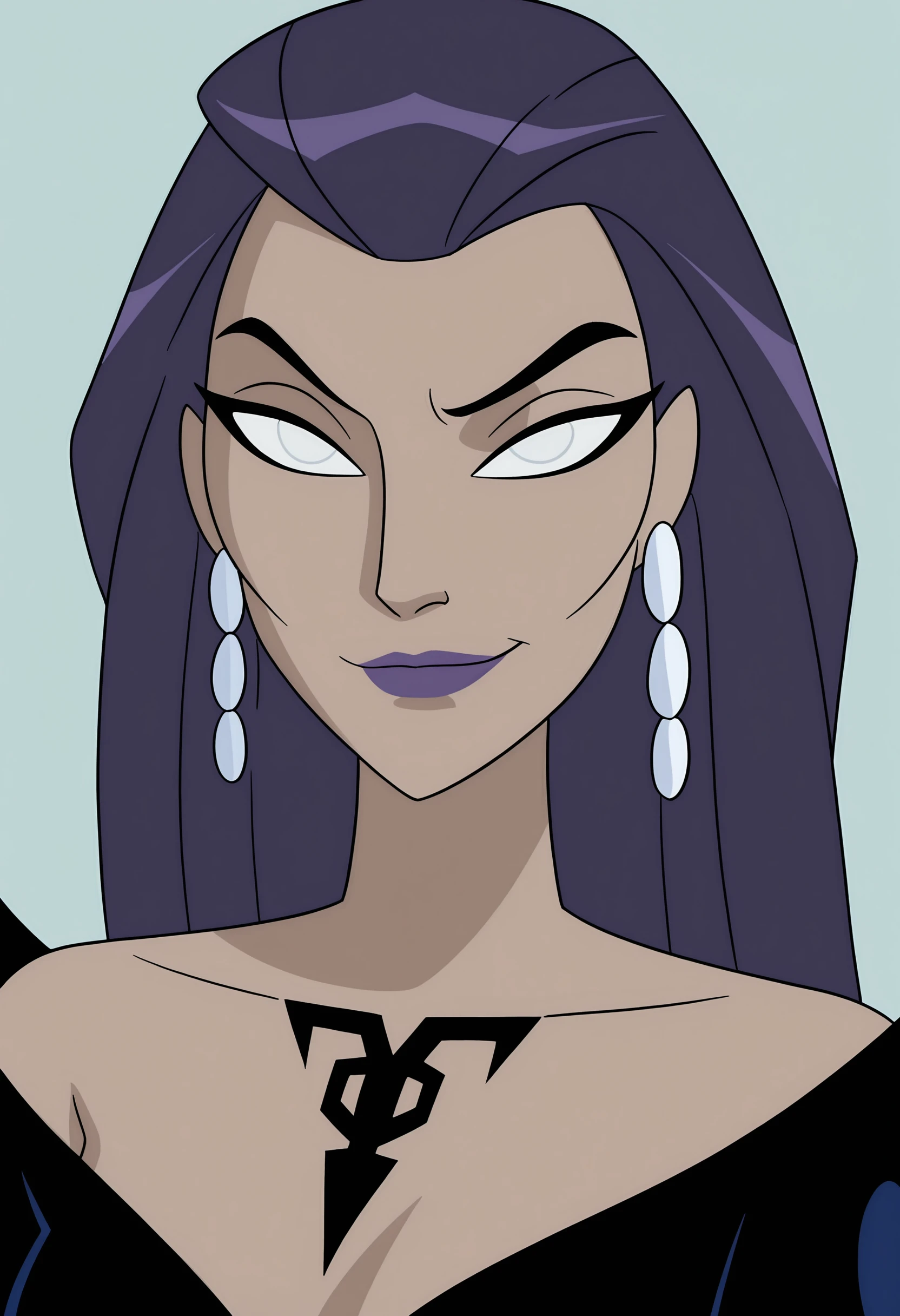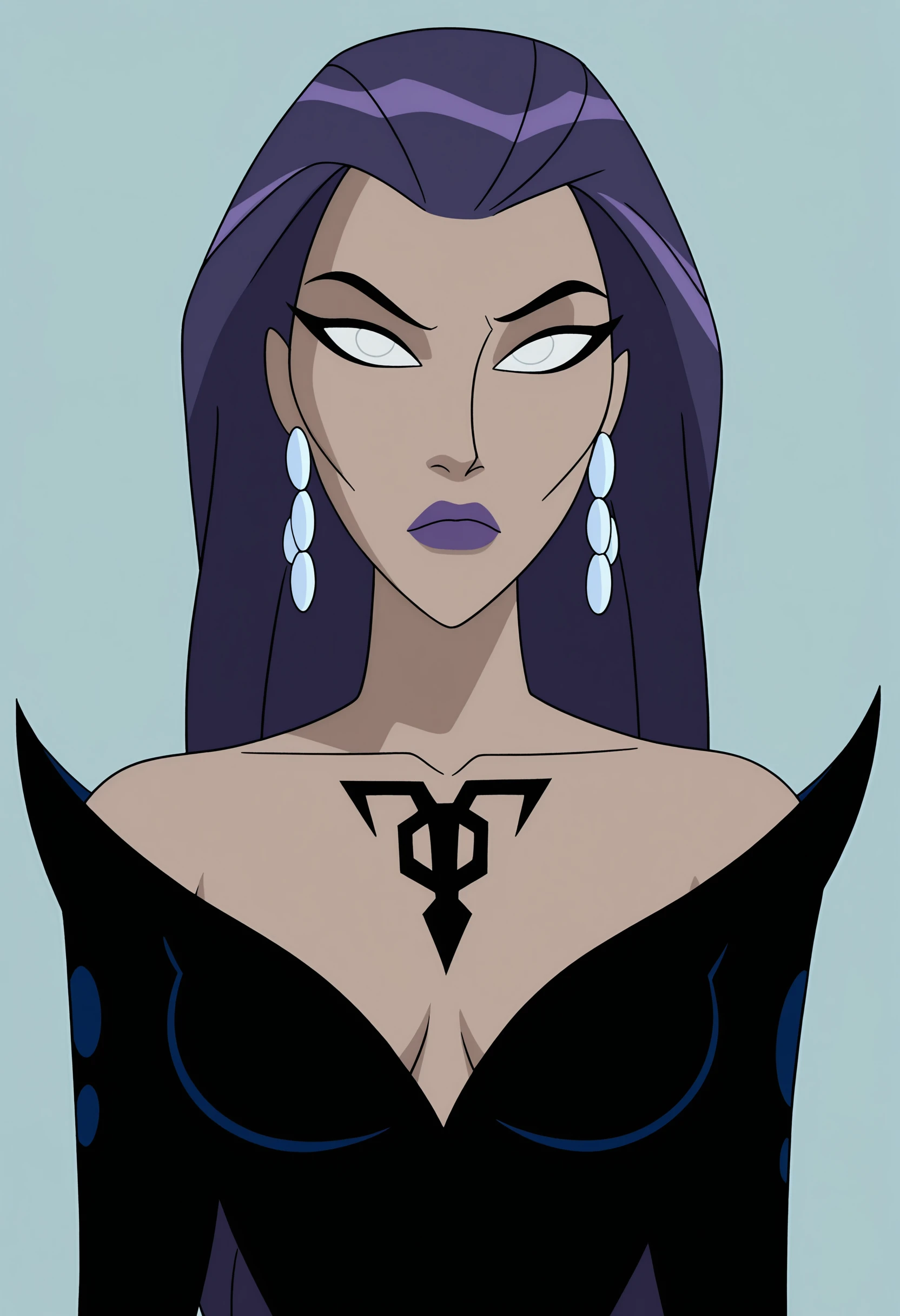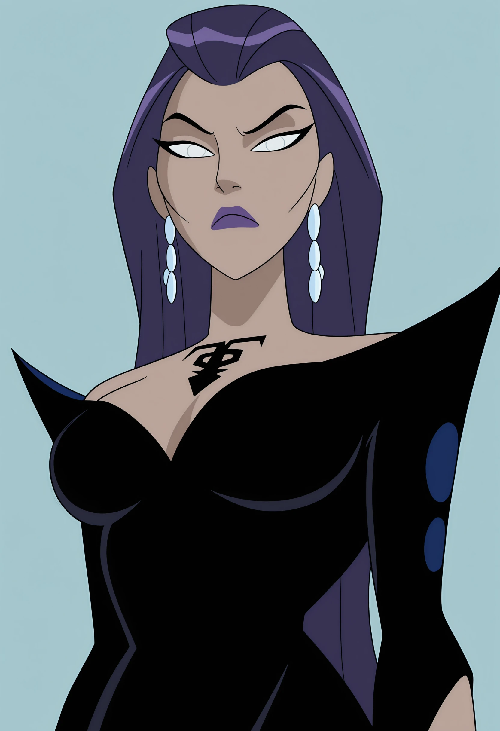 tljilf, long hair, purple hair, white eyes, purple lips, tattoo, earrings, black dress