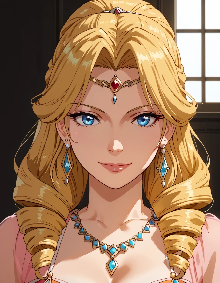 Aleria, blonde hair, cleavage, blue eyes, jewelry, long hair, necklace, see-through, earrings, circlet, drill hair, skirt,