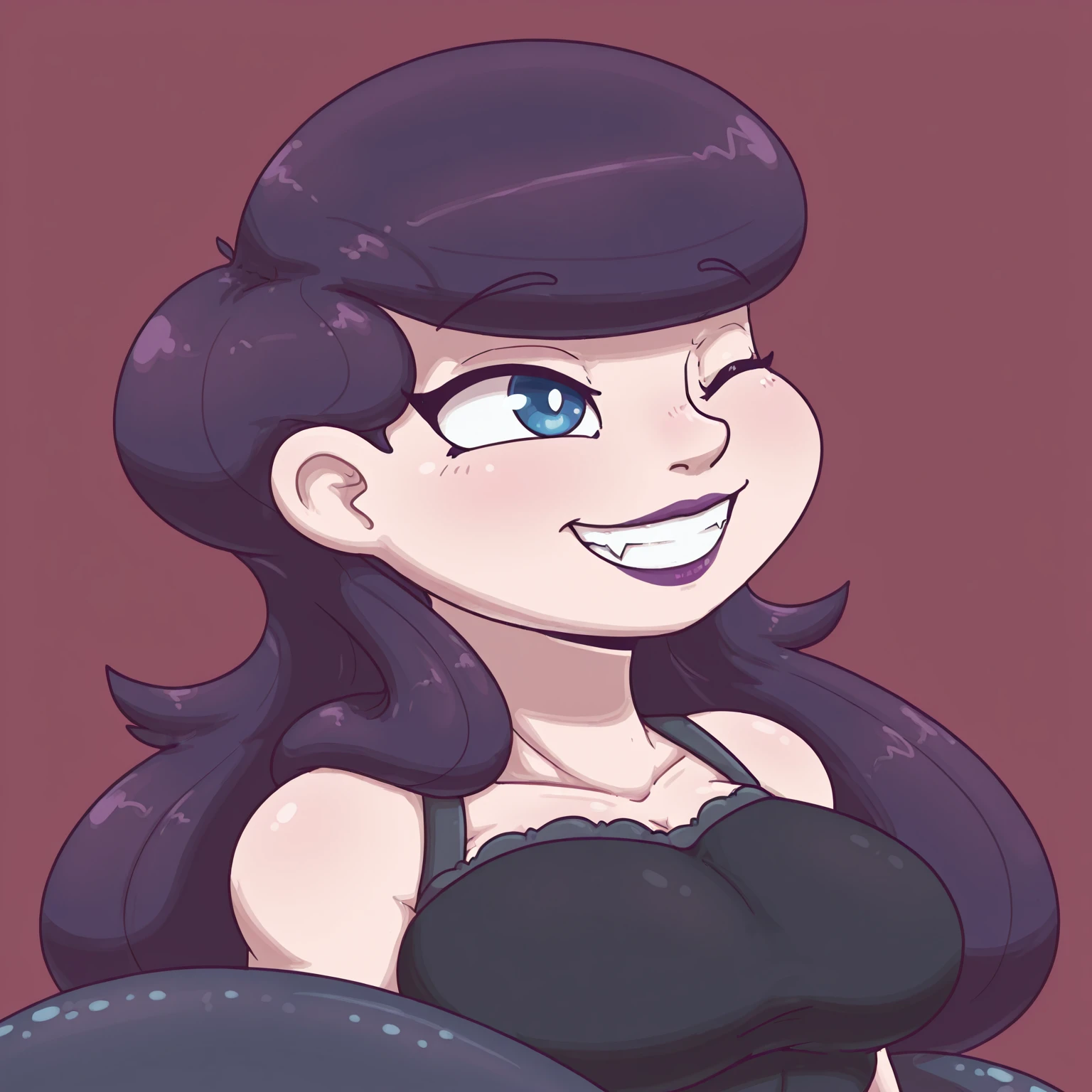 LindaAxugeam, slug girl, lamia, purple hair, long hair, blue eyes, , purple nails, purple lipstick, hair ornament
