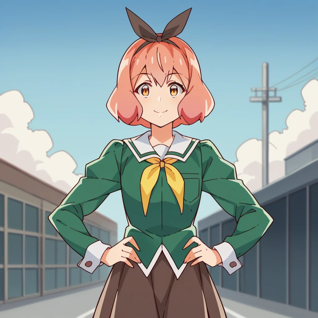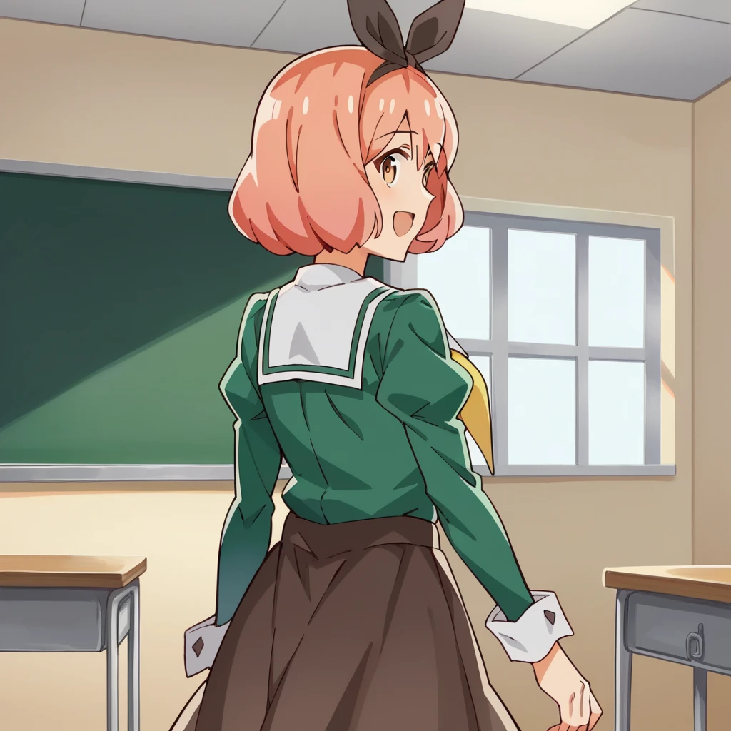 Koshiba_Def, school uniform, green shirt, long sleeves, green sleeves, white wrist cuff, long skirt, brown skirt, sailor collar, yellow neckerchief, Alt Outfit: