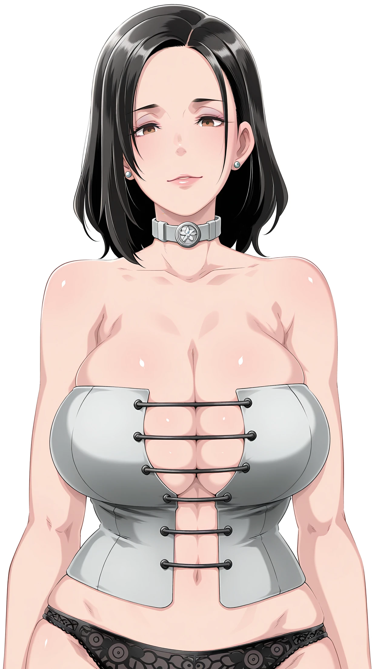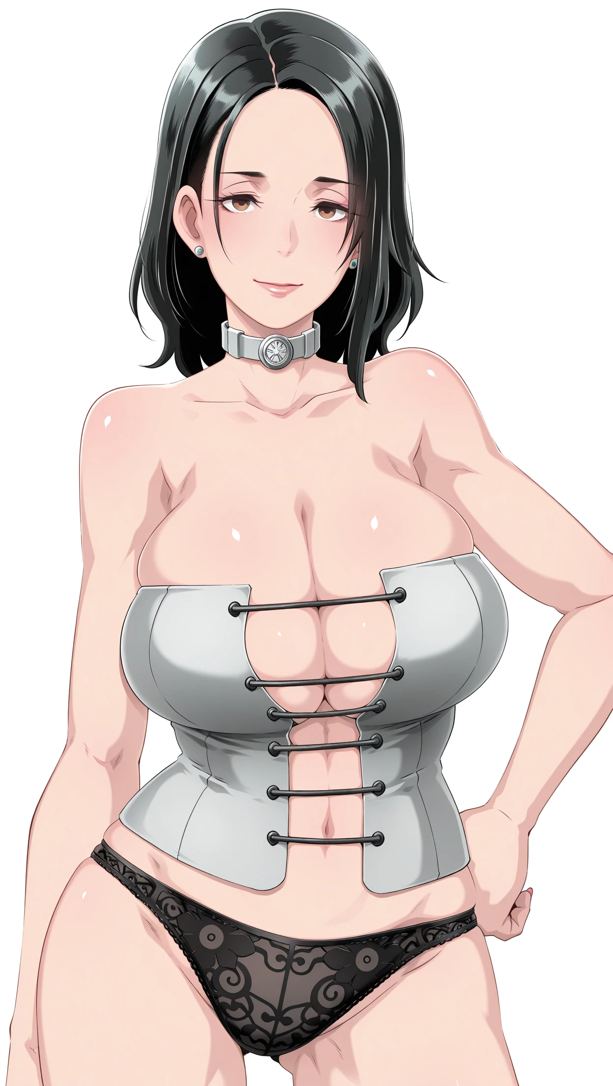 anime coloring, masterpiece, best quality, amazing quality, butcha-u-style, 1girl, mature female, medium hair, (dark black hair:1.2), parted bangs, perfect eyes, brown eyes, big breasts, stud earrings, corsetsiren, choker, cleavage, corset, panties, solo, pose, standing, looking at viewer, from front, ((((white background, simple background))))⚙️ Generation Settings