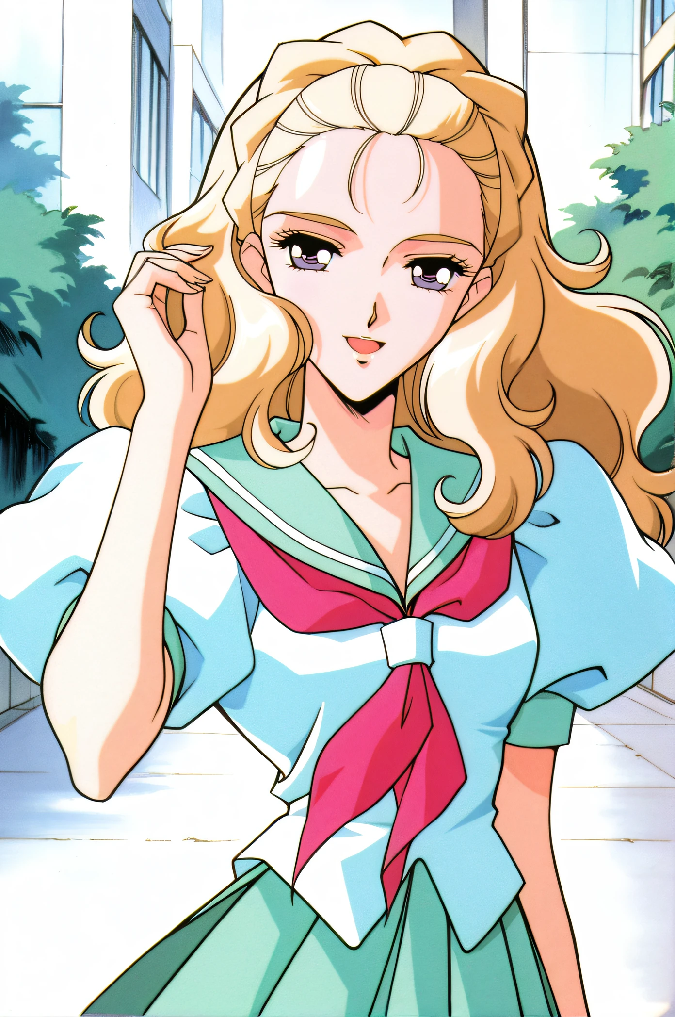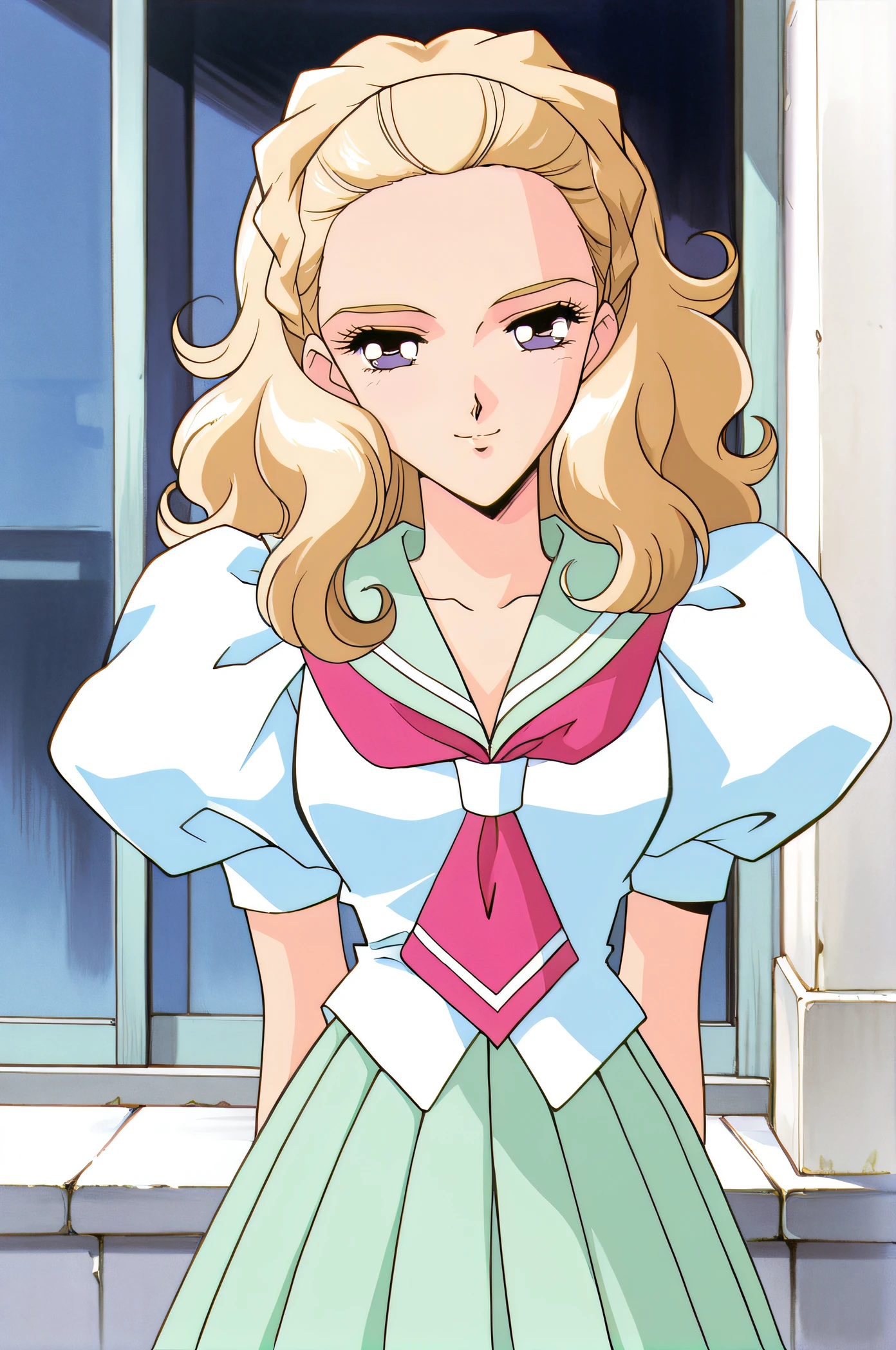 school uniform, serafuku, white puffy short sleeves, light green sailor collar, neckerchief, light green pleated skirt