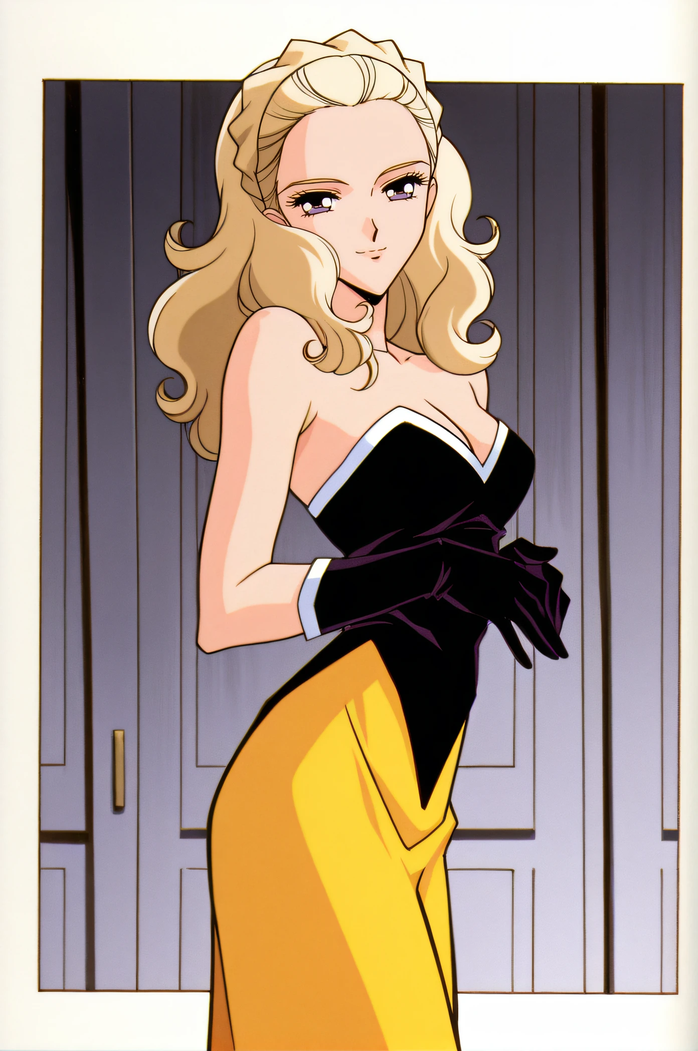 yellow dress, two-tone dress, black dress, white trim, cleavage, strapless, long skirt, black long gloves