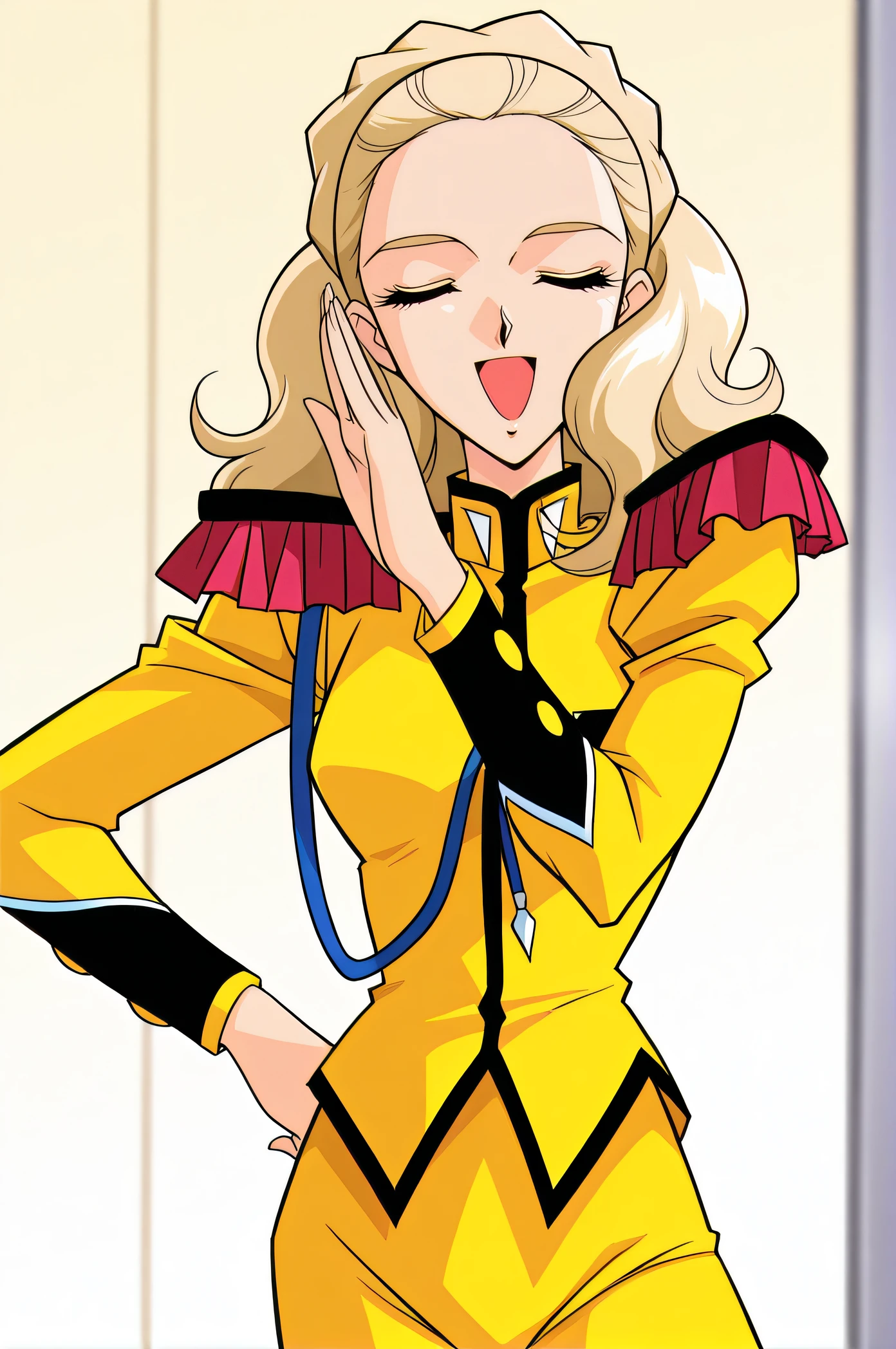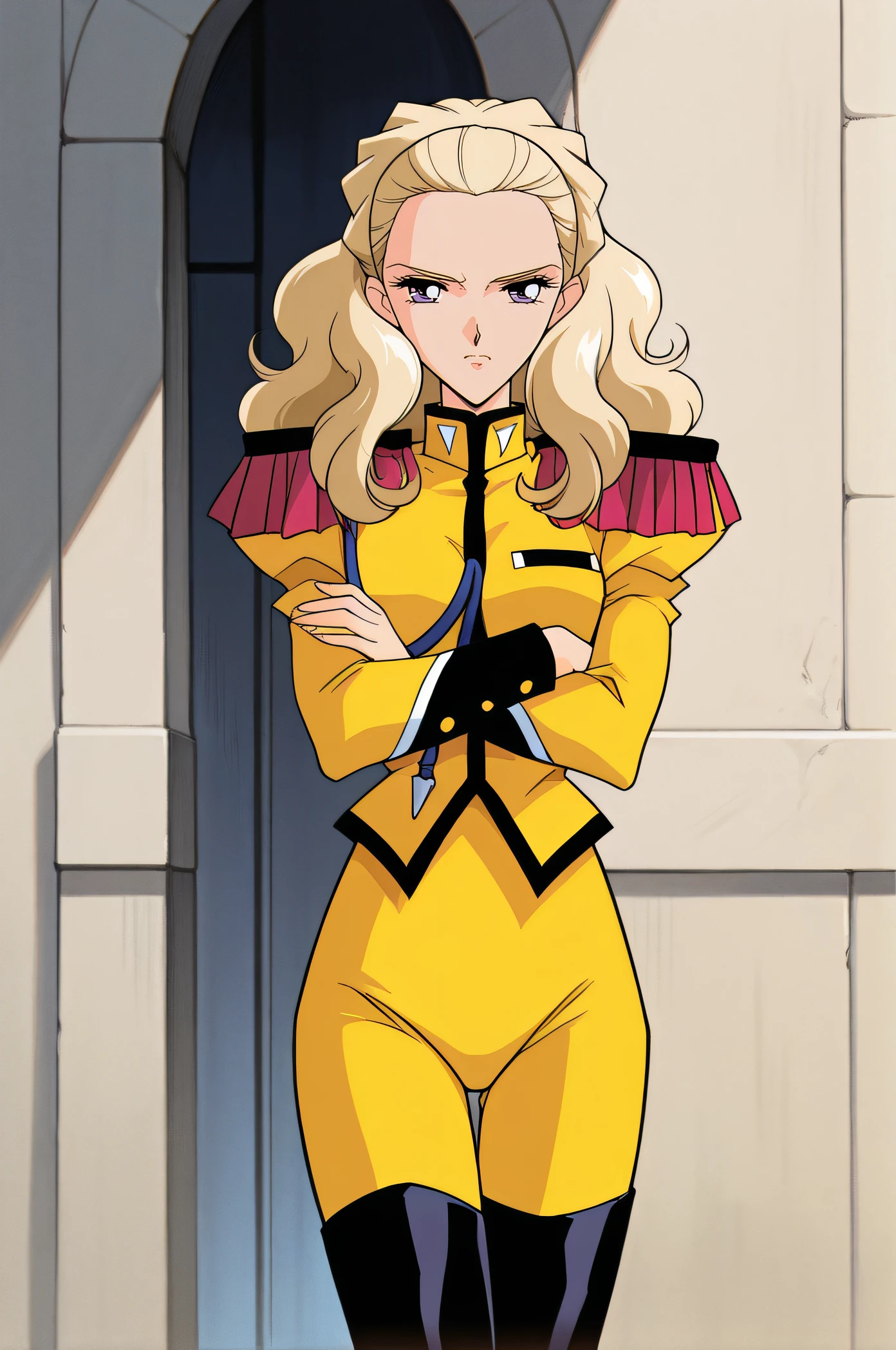 yellow uniform, epaulettes, yellow pants, black thigh boots