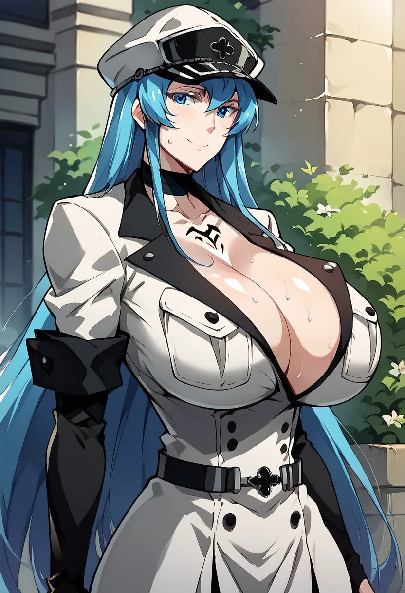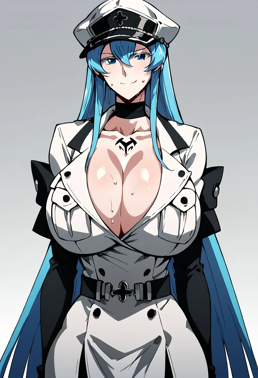 hat, solo, blue eyes, blue hair, long hair, cleavage, military uniform, uniform, military, smile, looking at viewer, huge breasts, choker, sweat, peaked cap, very long hair, esdeath