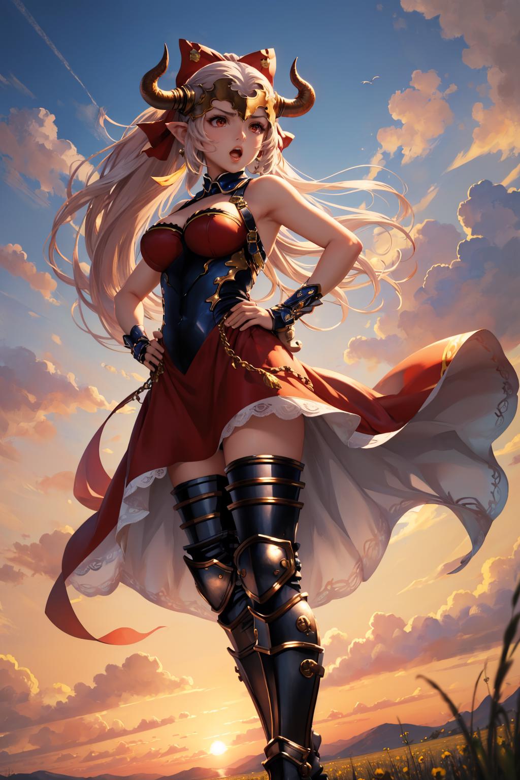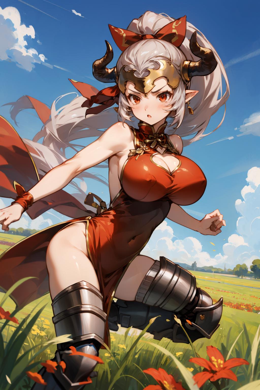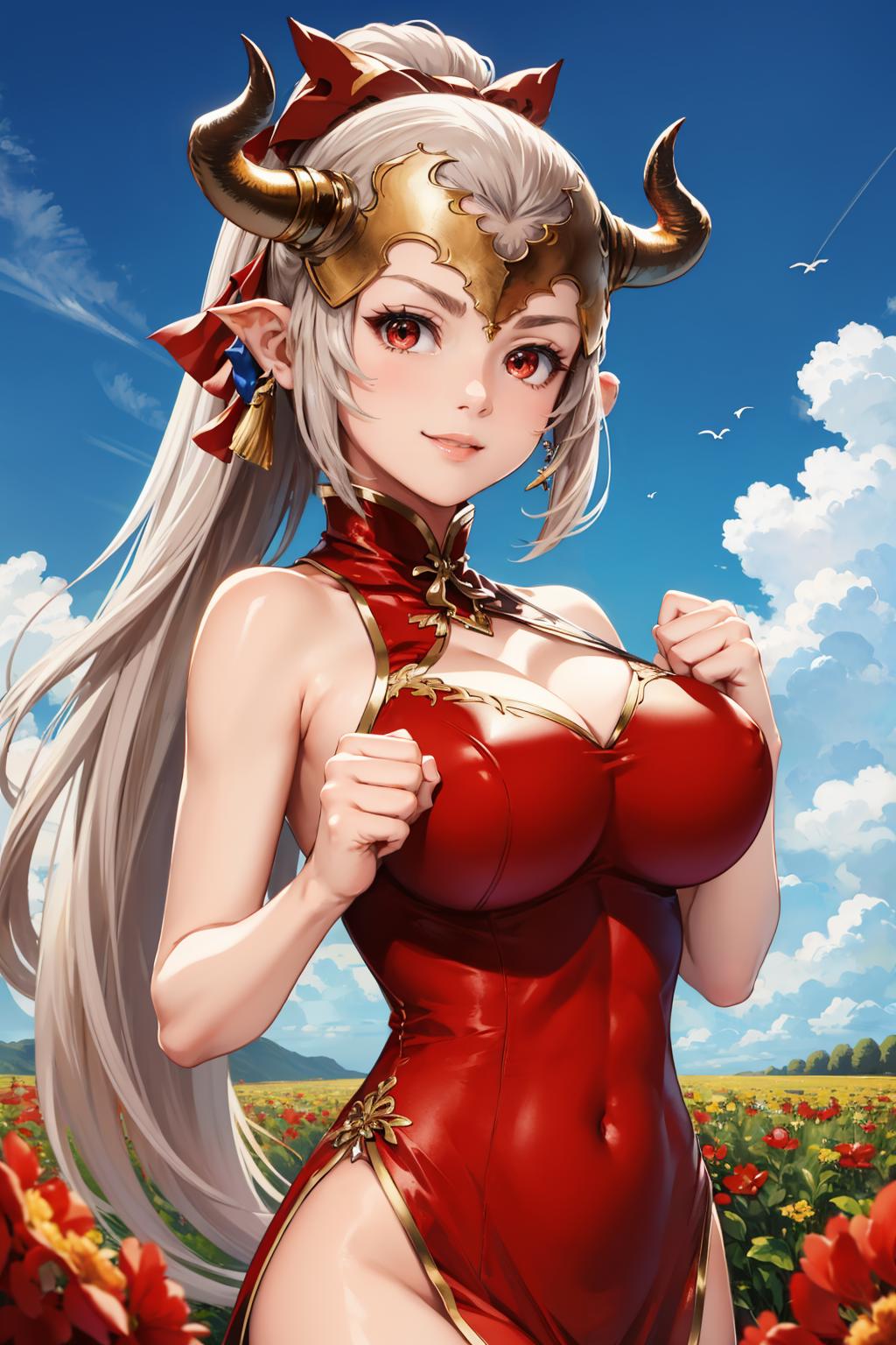 Add "headpiece, horns, ponytail, china dress, cleavage cutout, thigh boots" for her Event outfit.