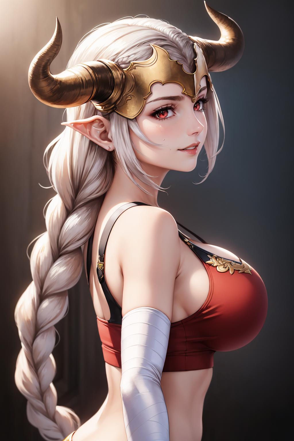 Add "headpiece, horns, single braid, red crop top, bandaged arm, black pants, brown boots" for her Water outfit.