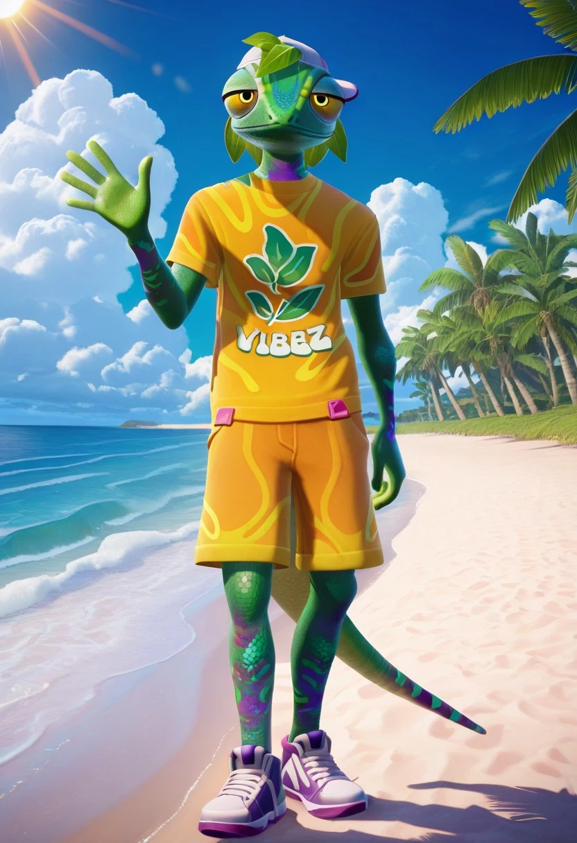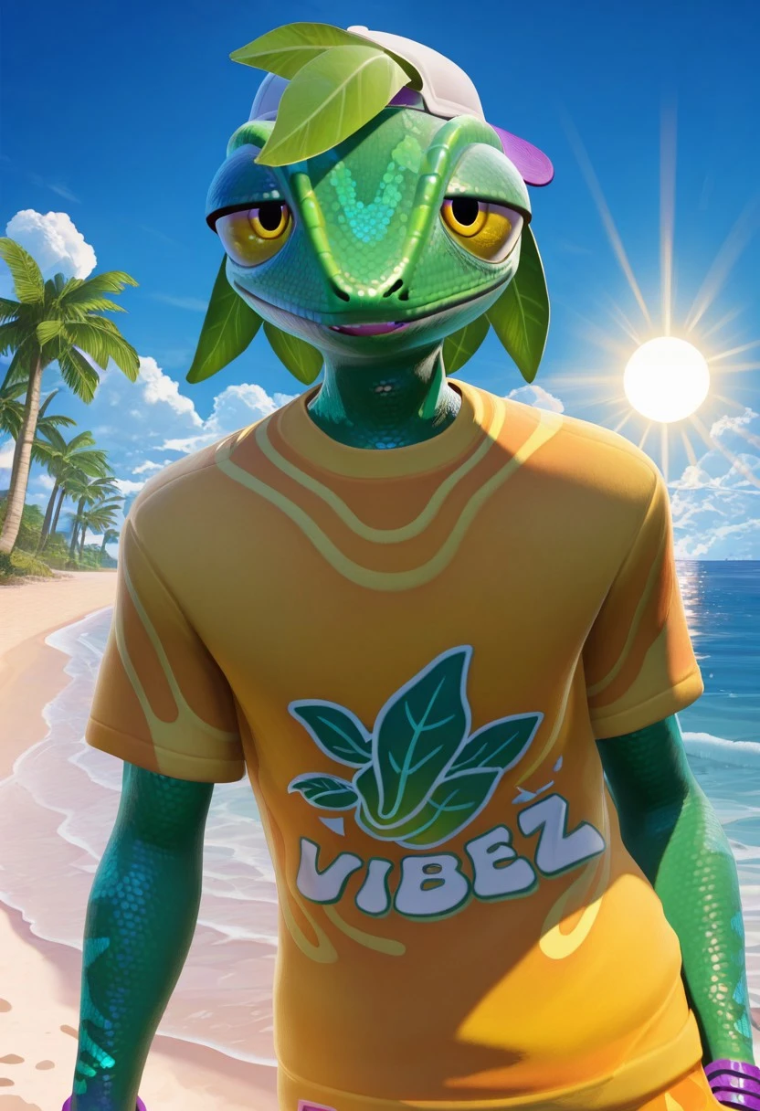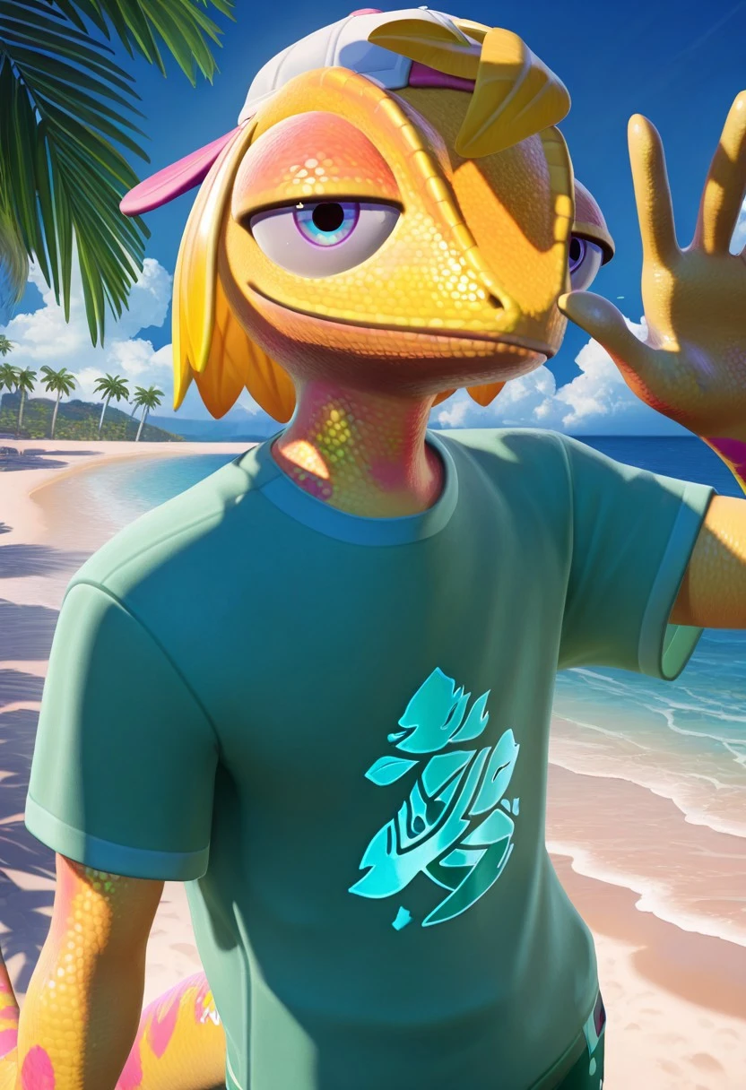 • ziggy_summer, anthropomorphic chameleon, humanoid reptile, yellow-orange skin, pink floral body patterns, sleepy blue eyes, yellow leafy hair, light green t-shirt with turtle logo, green shorts with lotus prints, teal and white sneakers, pink-white cap backwards, lizard tail
