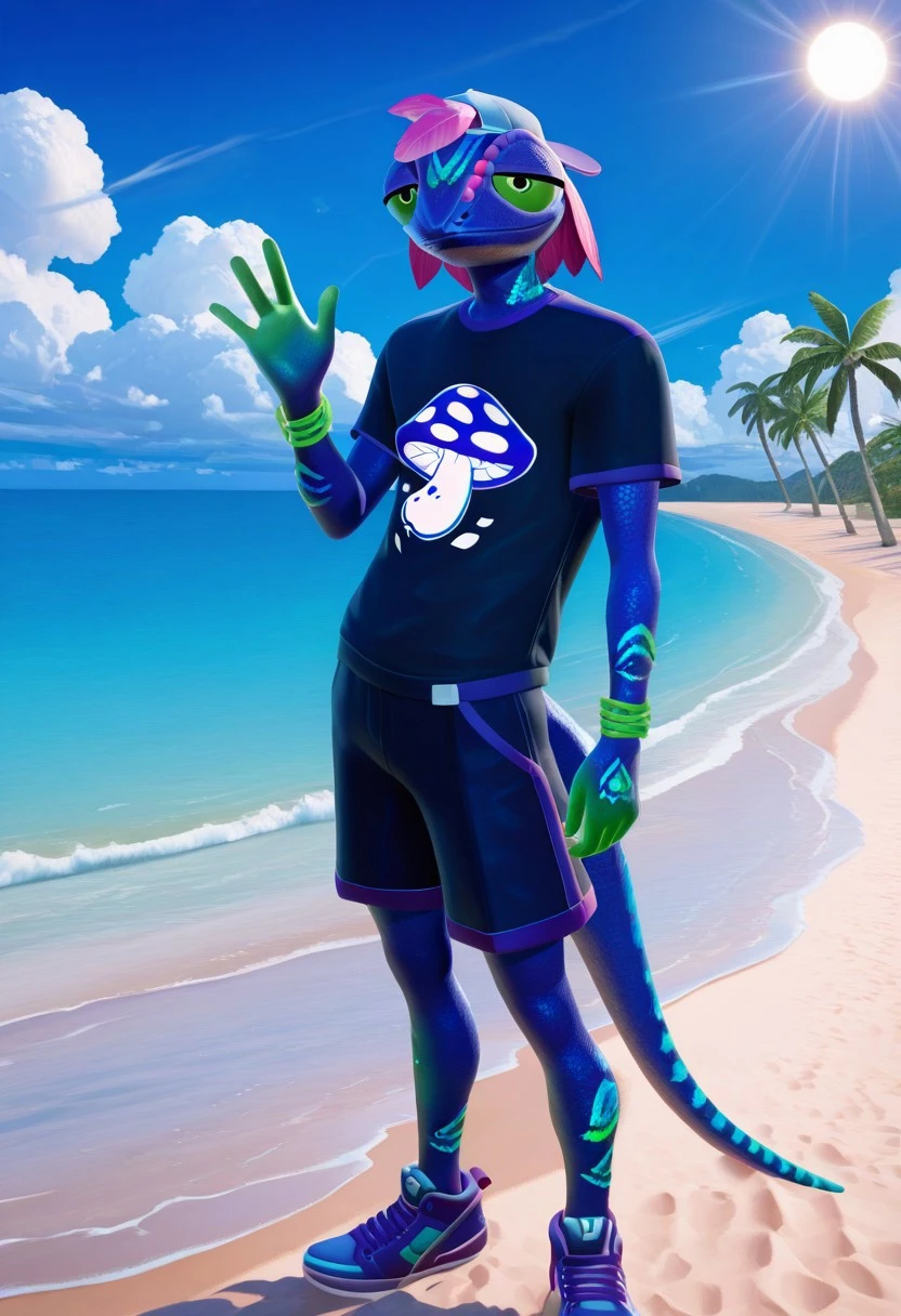 • ziggy_midnight, anthropomorphic chameleon, humanoid reptile, dark purple skin, neon green-blue skin swirls, sleepy lime eyes, pink leafy hair, purple-white cap backwards, dark t-shirt with cartoon mushroom print with purple trim, dark shorts with purple trim, purple and turquoise sneakers, lizard tail
