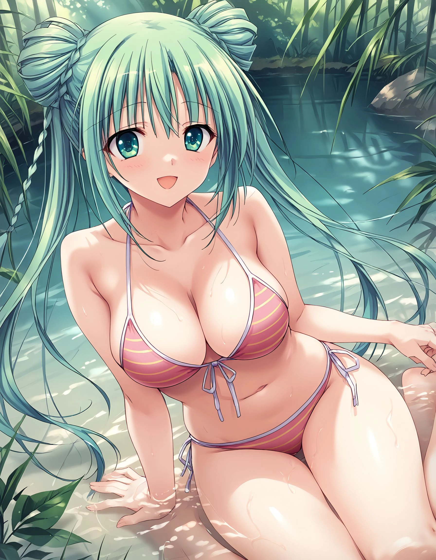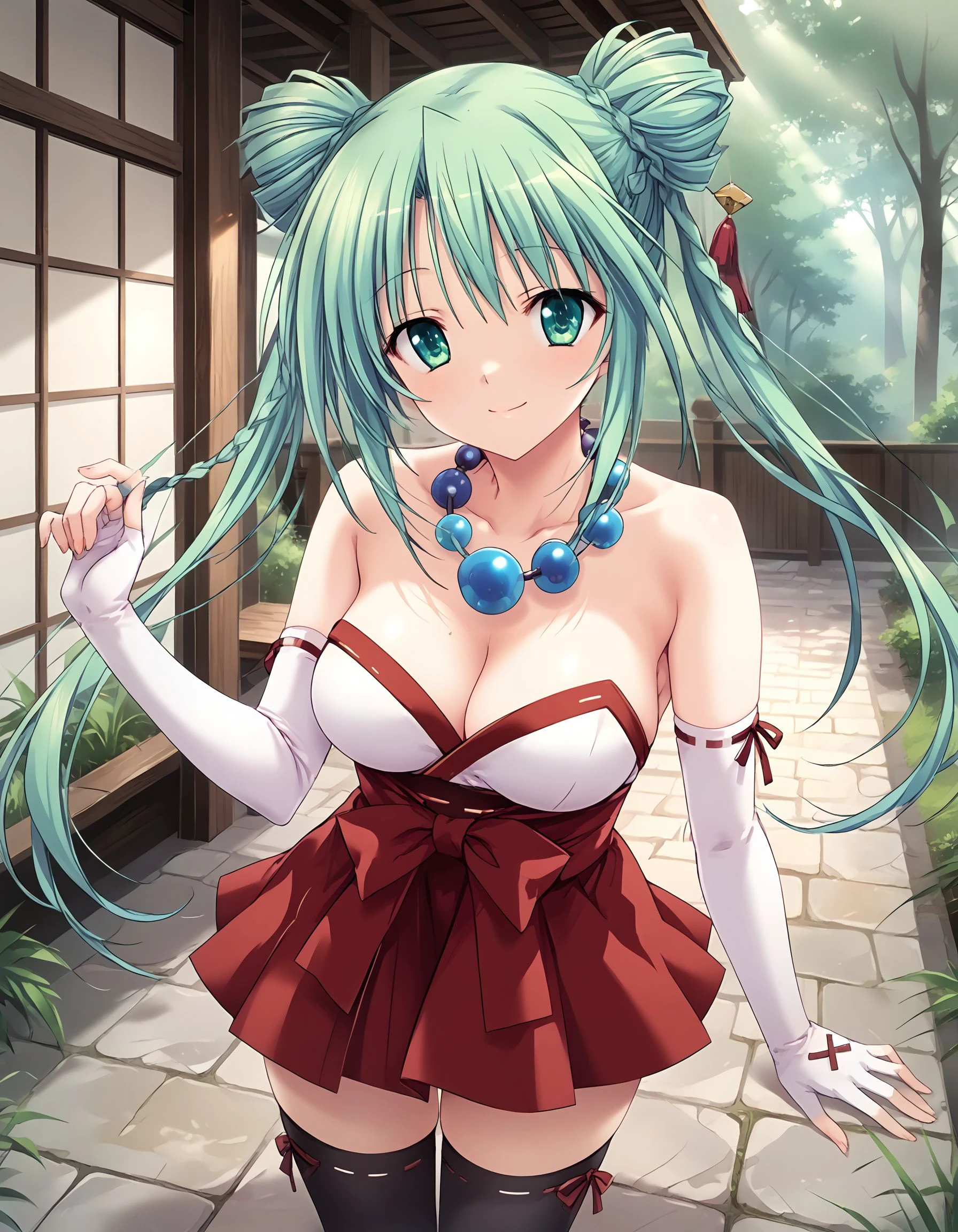 0tama, green hair, hair bun, double bun, hair braid, double braid, twintails, green eyes, large breasts,