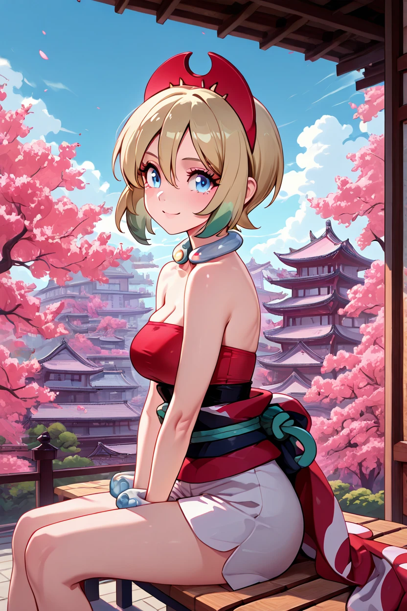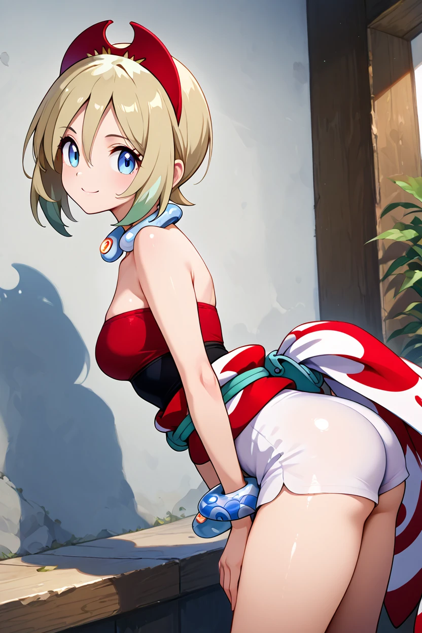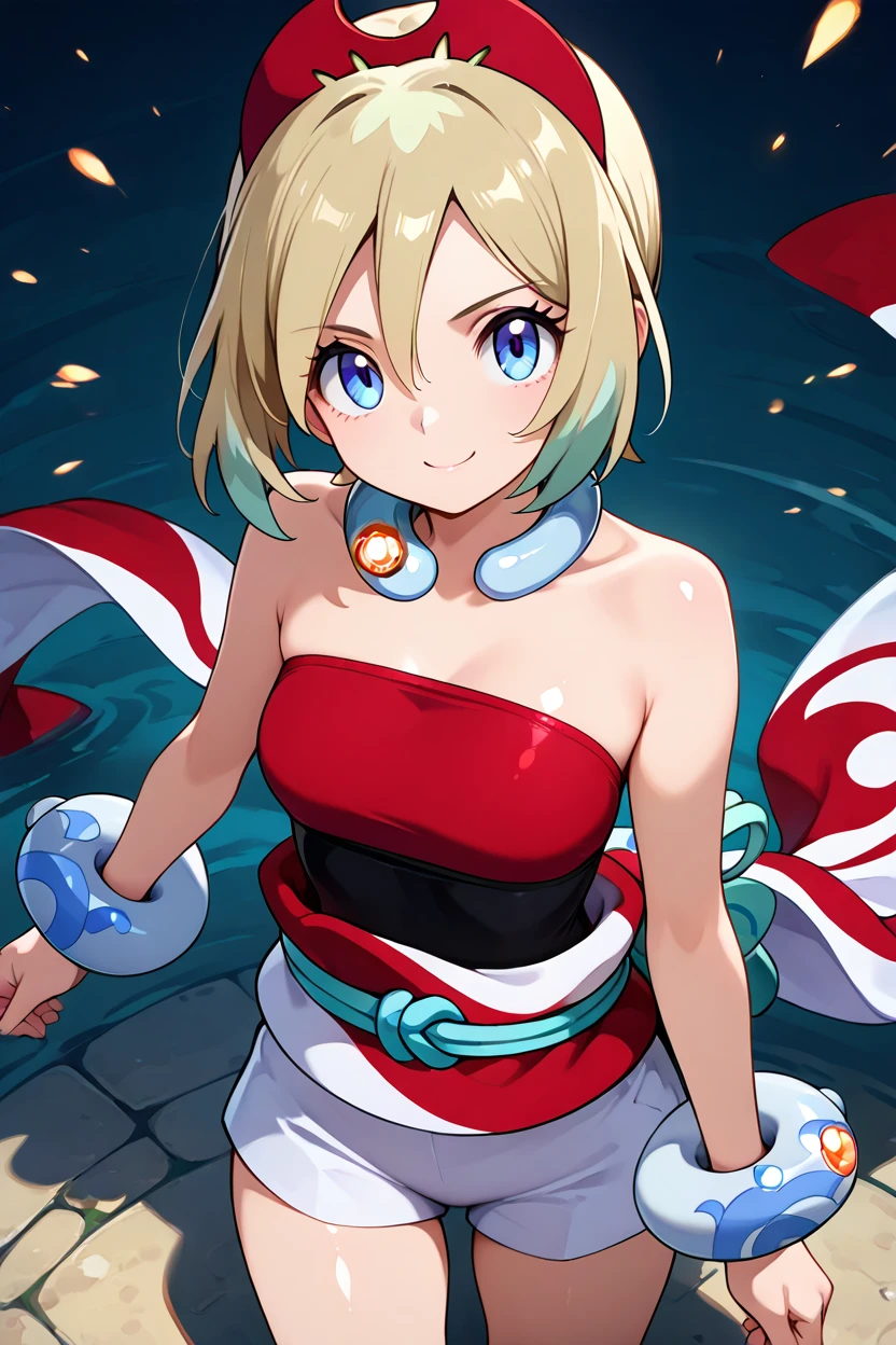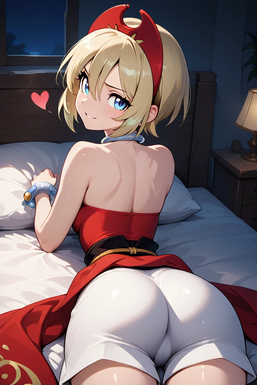 zzIrida, blonde hair, blue eyes, short hair, bangs, hair between eyes, red hairband, bracelet, neck ring, red shirt, sash, solo, strapless shirt, white shorts, waist cape,