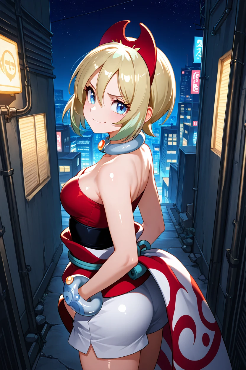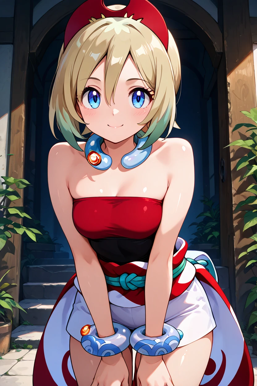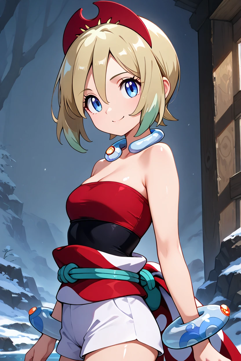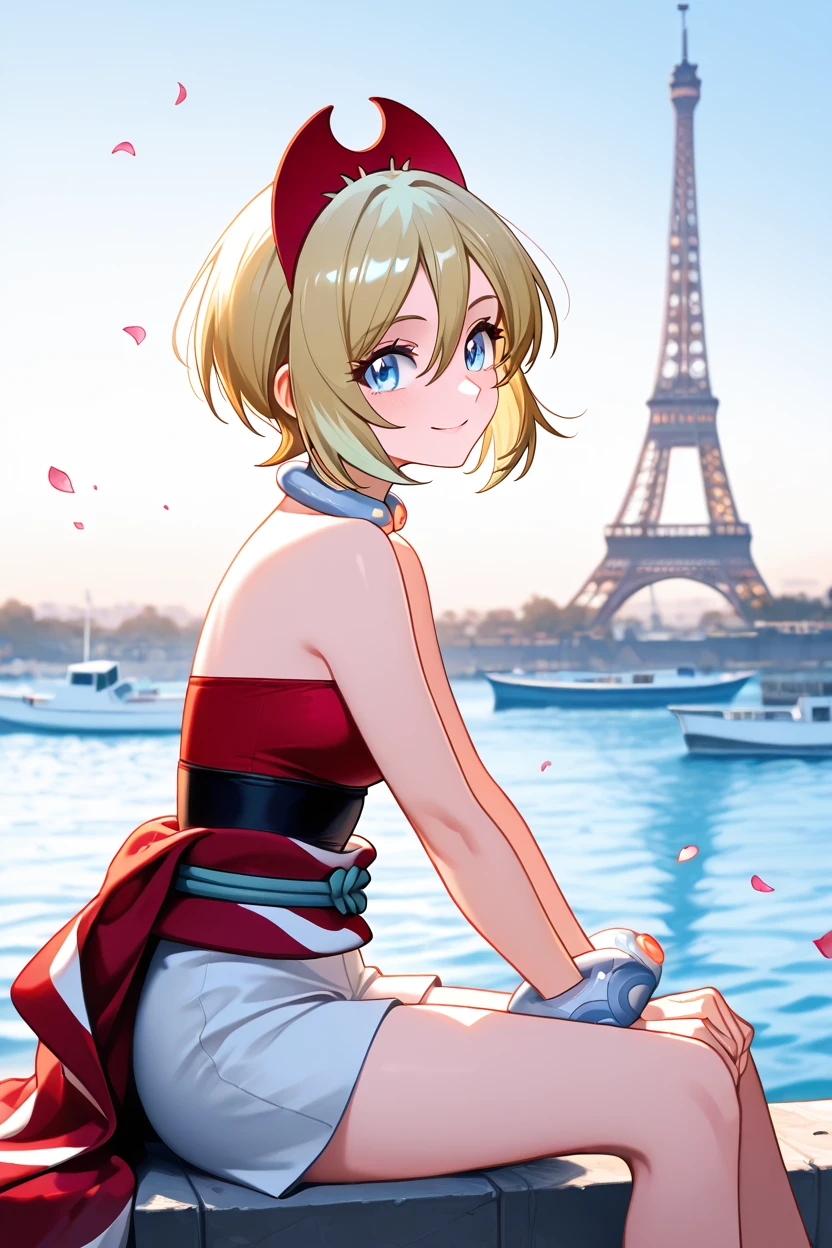 zzIrida, blonde hair, blue eyes, short hair, bangs, hair between eyes, red hairband, bracelet, neck ring, red shirt, sash, solo, strapless shirt, white shorts, waist cape,