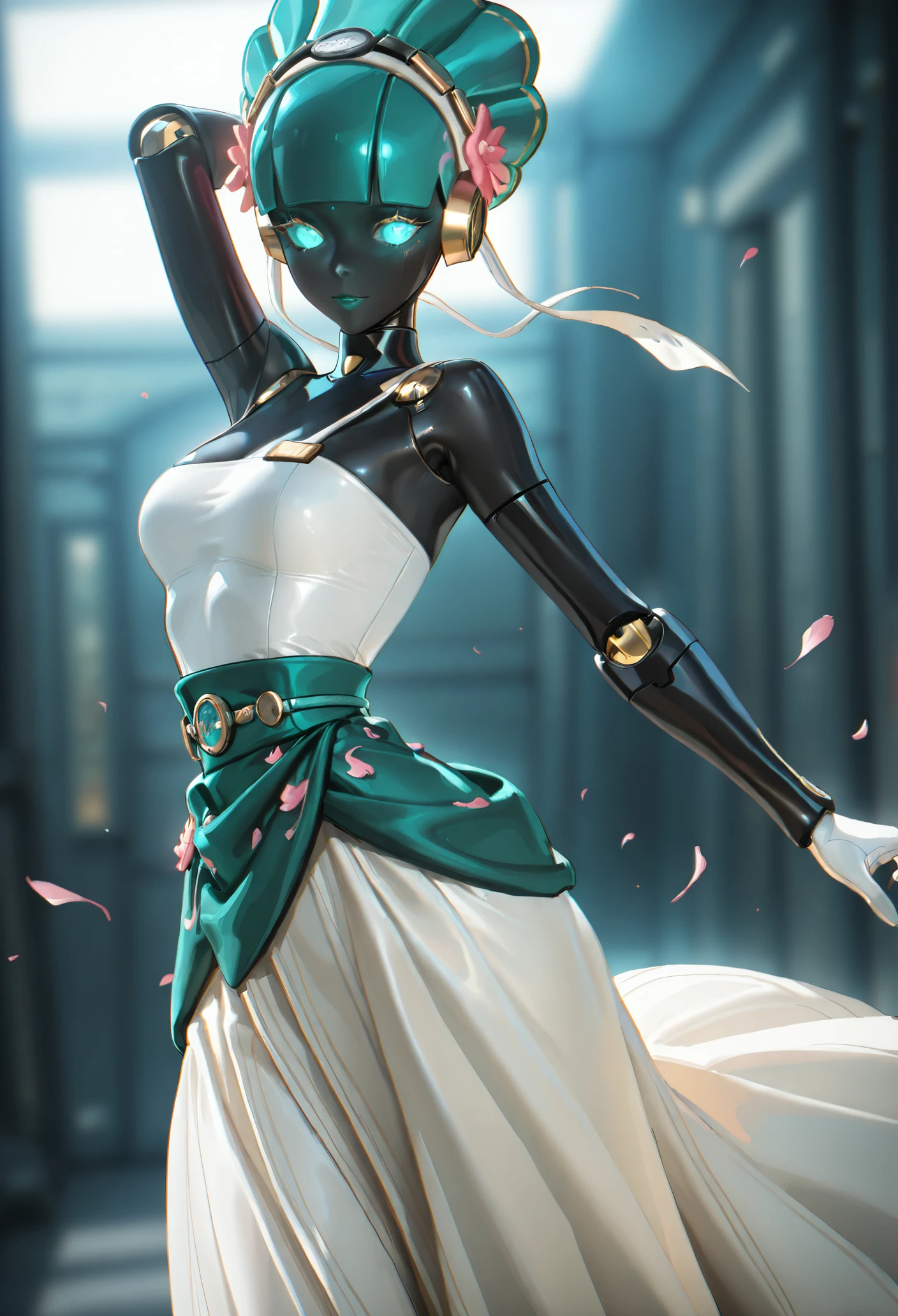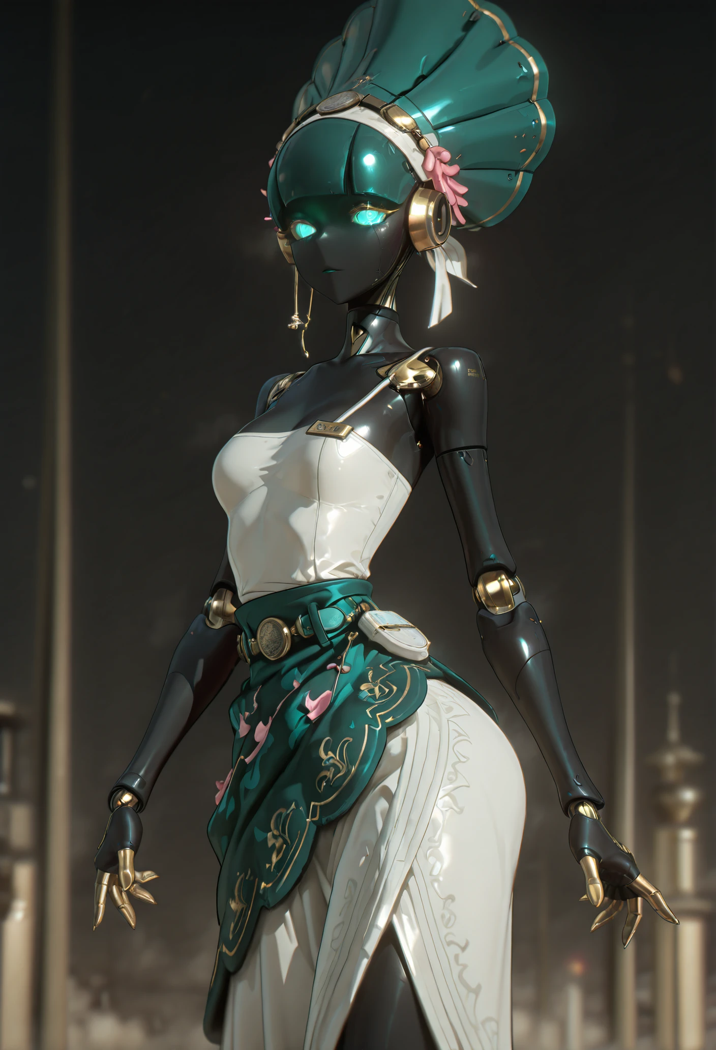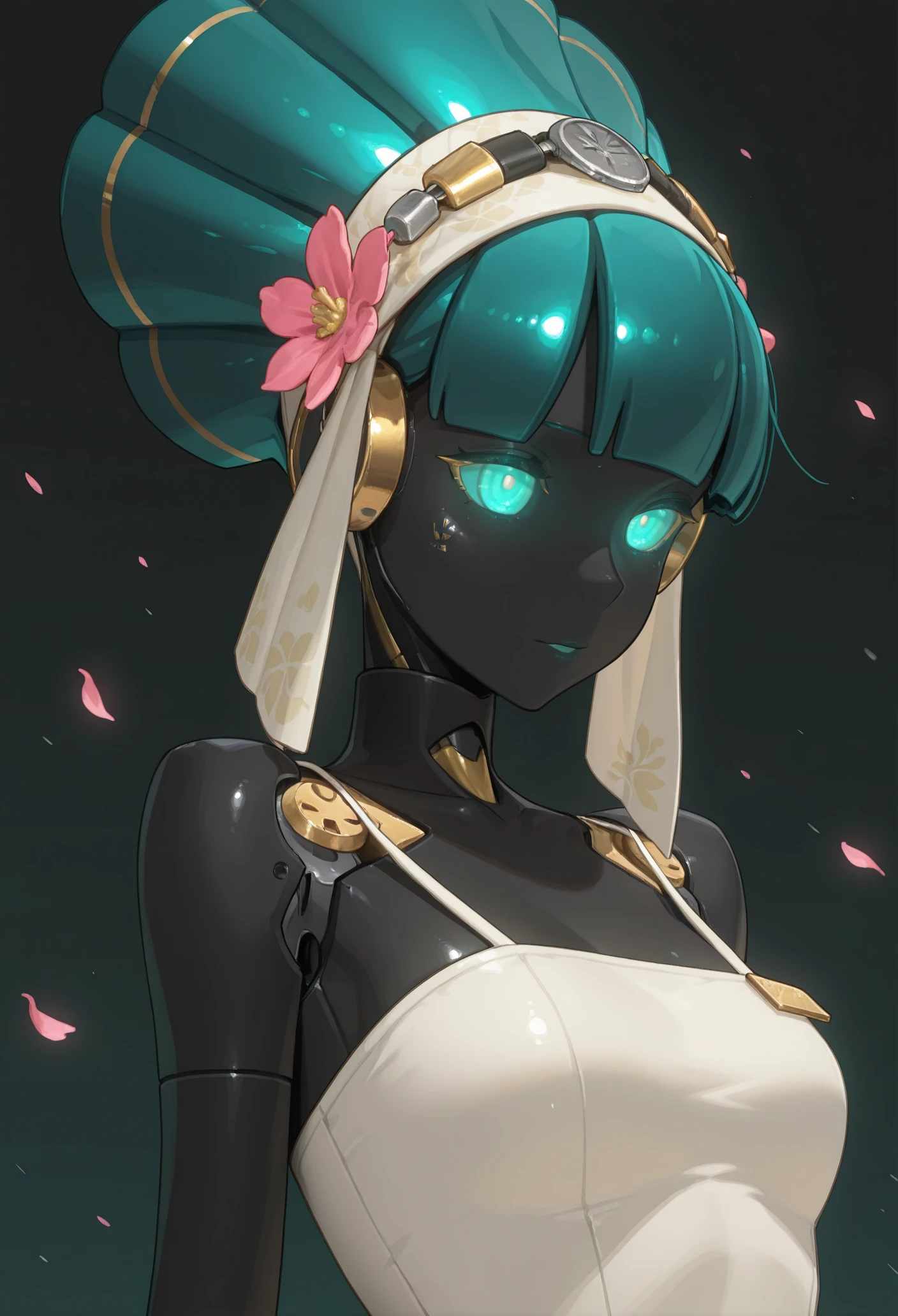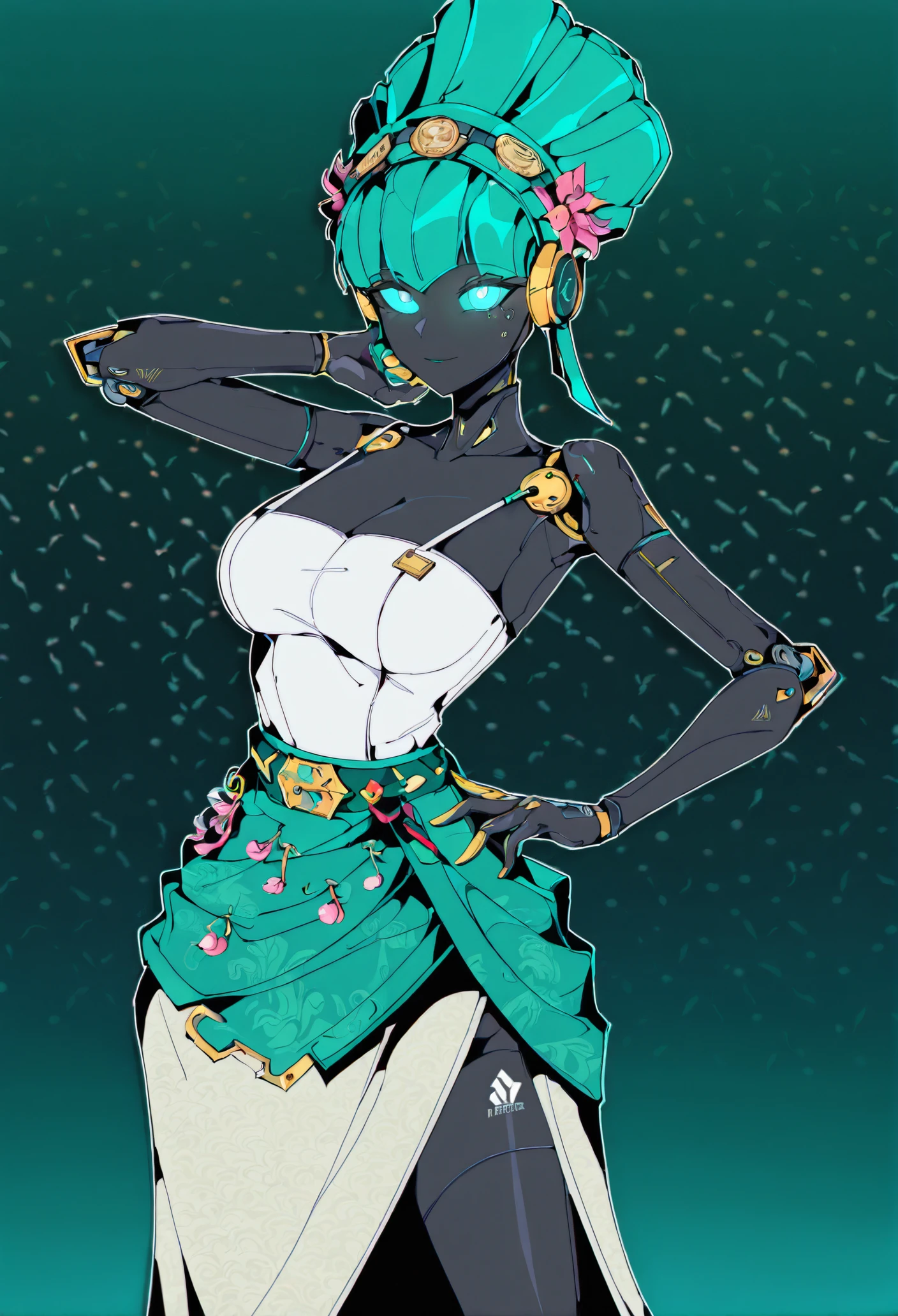 Base: black skin, glowing eyes, aqua eyes, aqua hair, mechanical body, robot girl, robot joints