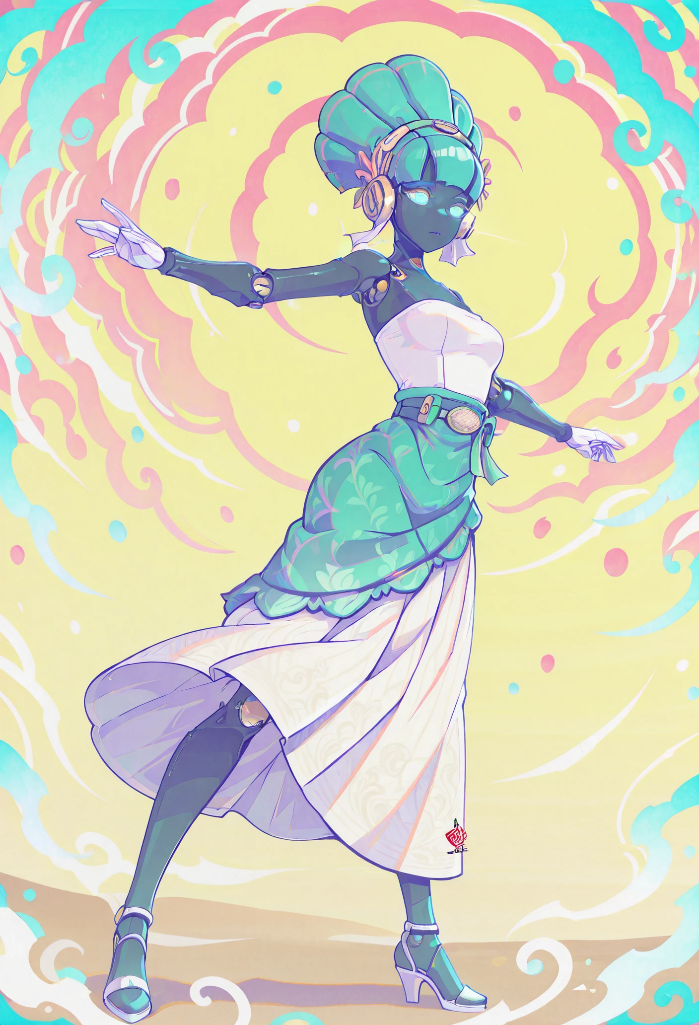 Outfit: green headdress, flower headdress, white tube top, green sash, white long skirt, asymmetrical skirt, strappy heels with gold points