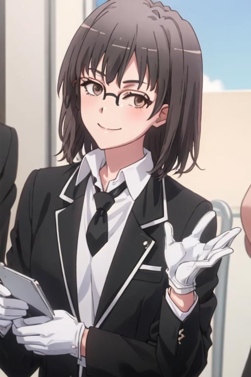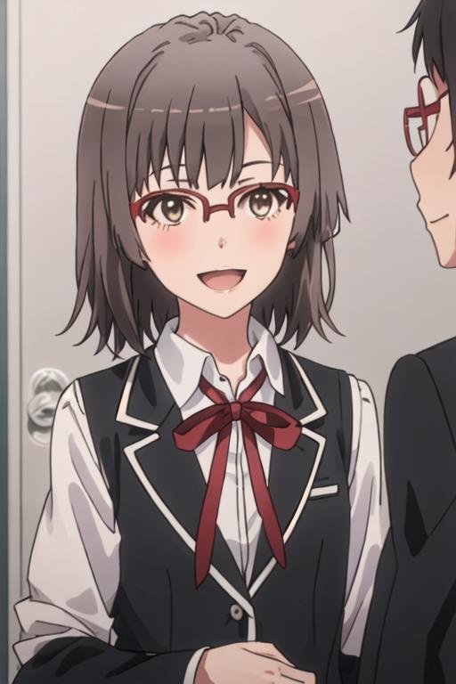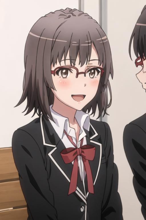 The trigger word is ebina_hina_yahariorenoseishunlovecomewamachigatteiru, and the recommended tags are best quality, masterpiece, highres, solo, {ebina_hina_yahariorenoseishunlovecomewamachigatteiru:1.15}, short_hair, brown_hair, glasses, smile, red-framed_eyewear, black_hair, brown_eyes.