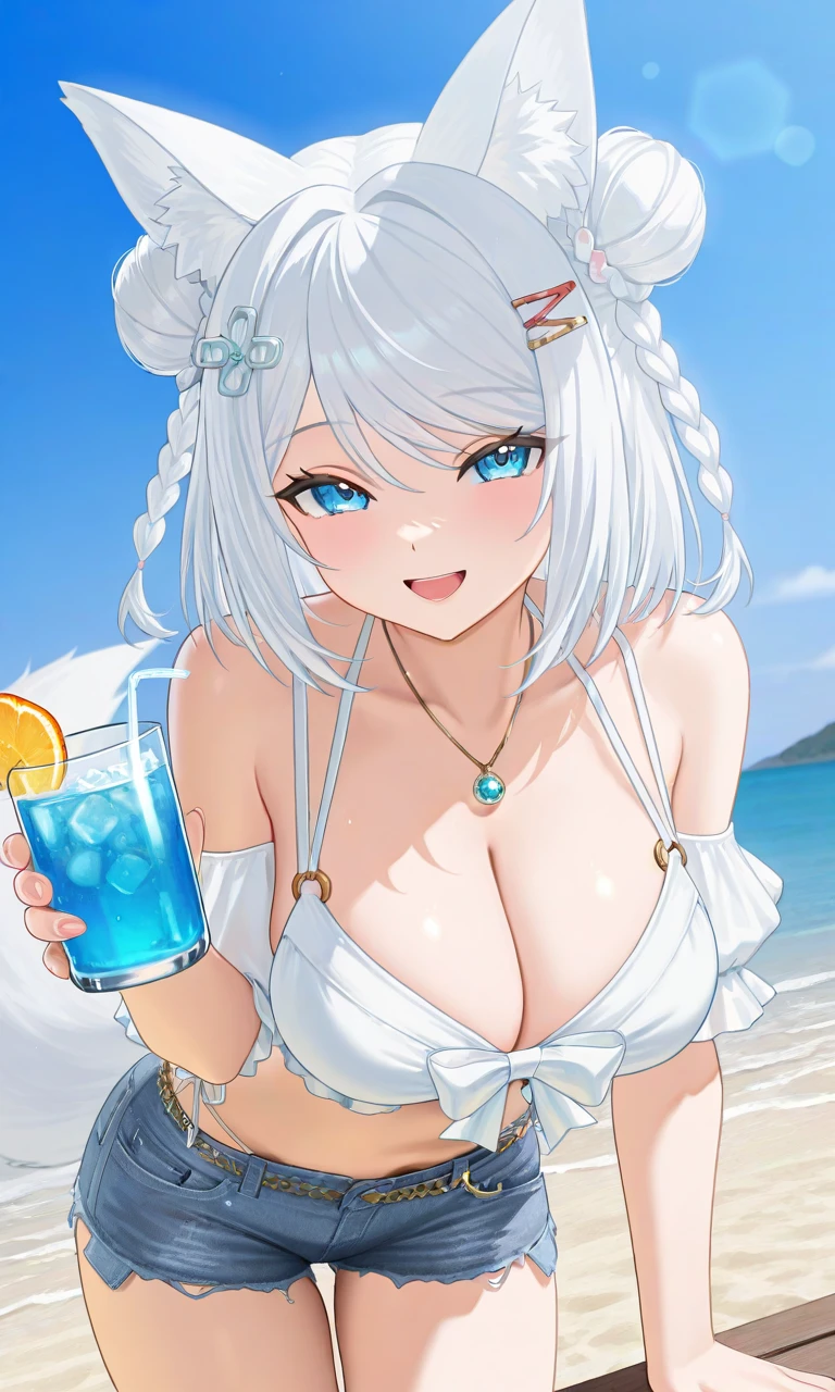 vmizuki, mizuki summer, fox ears, medium hair, double bun, braid, fox tail, hair ornament, hairclip, necklace, white bikini, bow bikini, blue shorts, denim shortsYou can change hair hair style by using