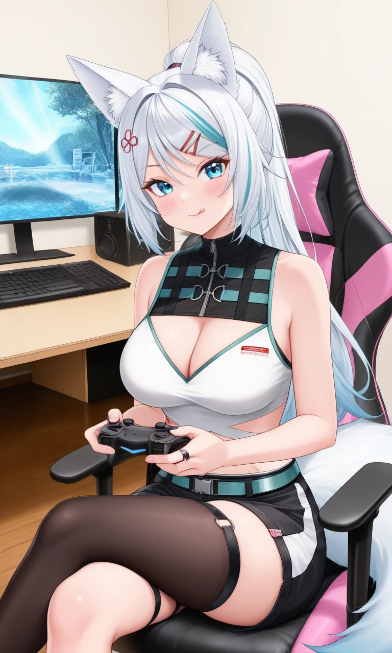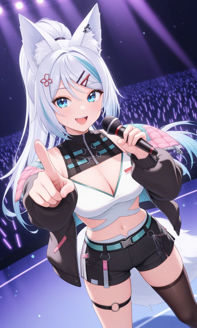vmizuki, mizuki fes, fox ears, long hair, streaked hair, ponytail, fox tail, hair ornament, hairclip, crop top, sleeveless shirt, cutout, black shoulder, aqua belt, black shorts, black single thighhigh, thigh strapYou can