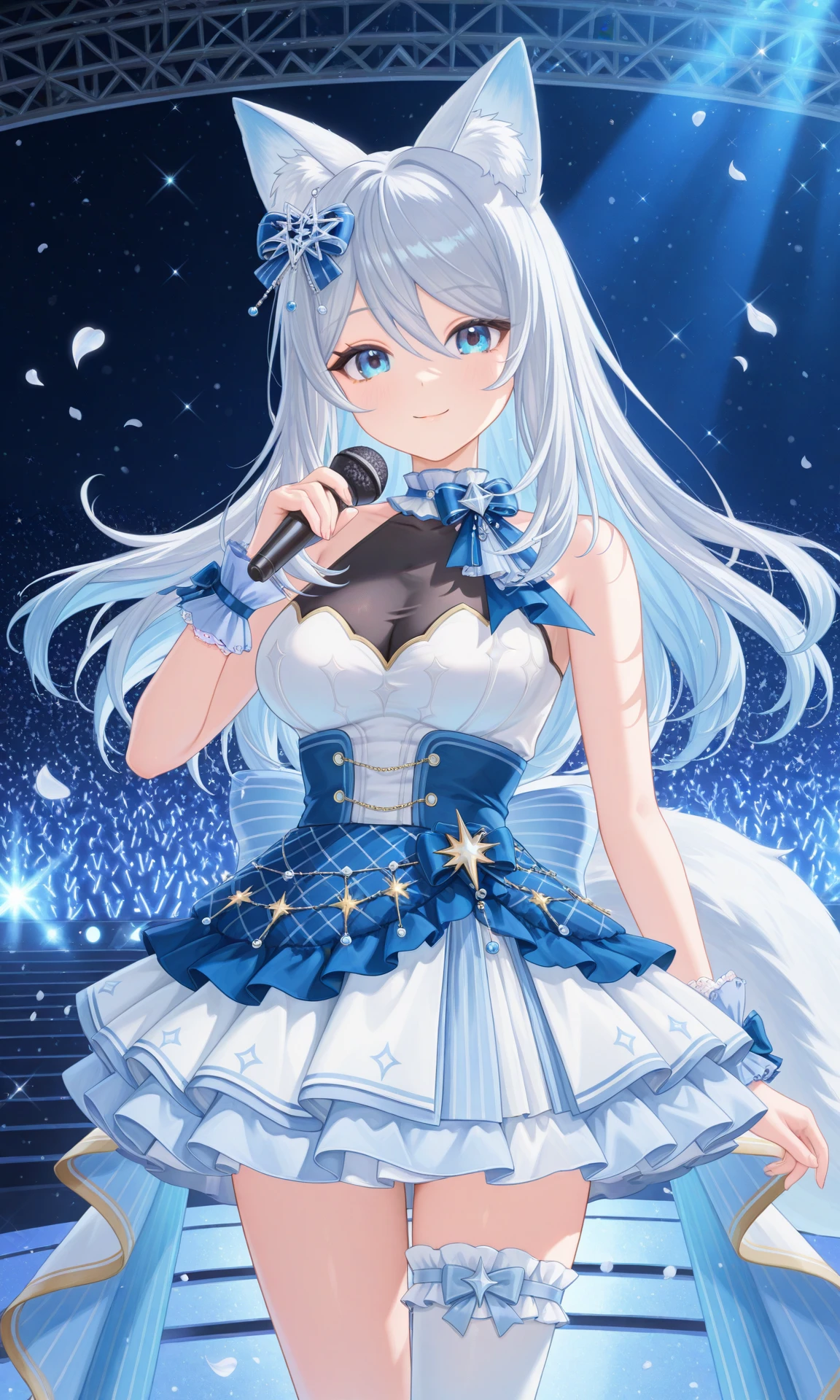 vmizuki, mizuki luminous, fox ears, long hair, fox tail, hair bow, blue bow, idol, layered dress, white dress, blue dress, sleeveless, wrist cuffs, white skirt, white single thighhigh, frilled thigh strap