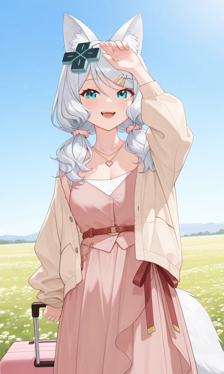 vmizuki, mizuki cozy, fox ears, long hair, low twintails, d-pad hair ornament, hairclip, fox tail, pink dress, trench dress, sleevelessYou can add