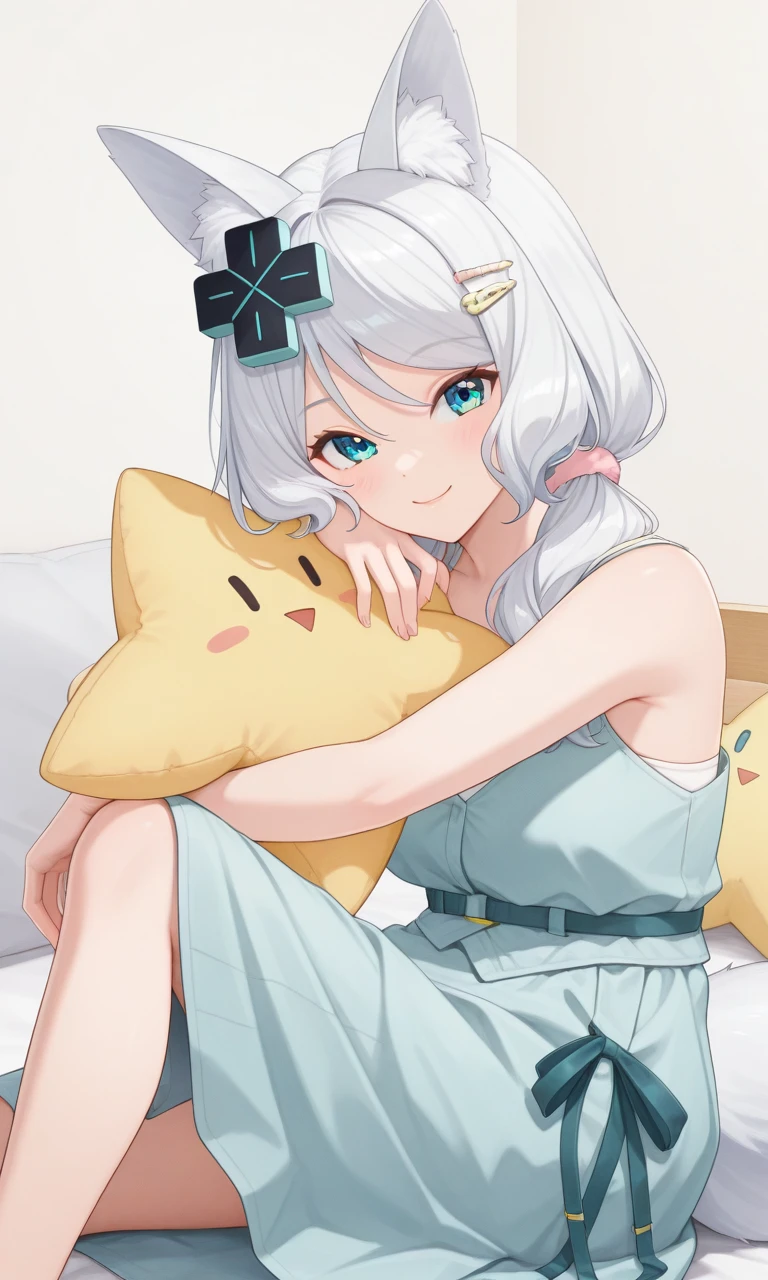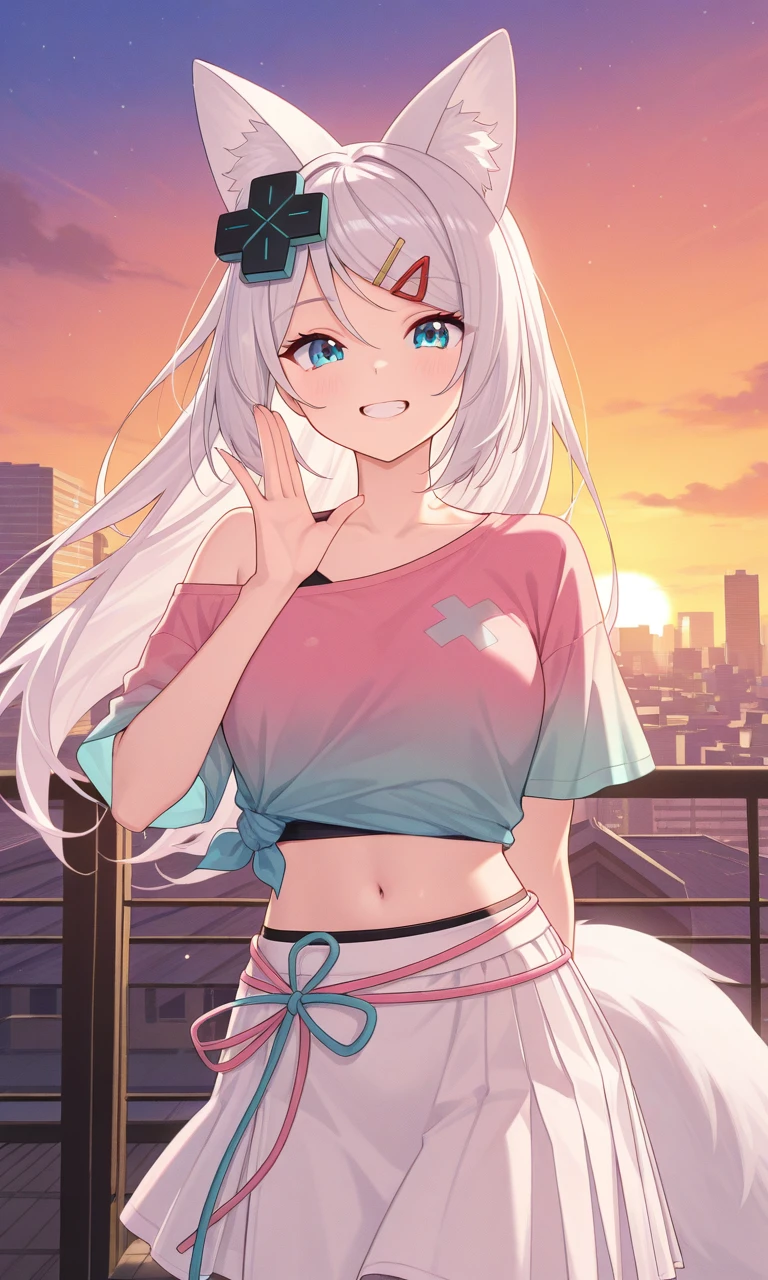 vmizuki, mizuki default, fox ears, long hair, d-pad hair ornament, hairclip, fox tail, short sleeves, pink shirt, gradient shirt, tied shirt, cropped shirt, navel, white skirt🚪Second outfit(Roomwear-Dress) :