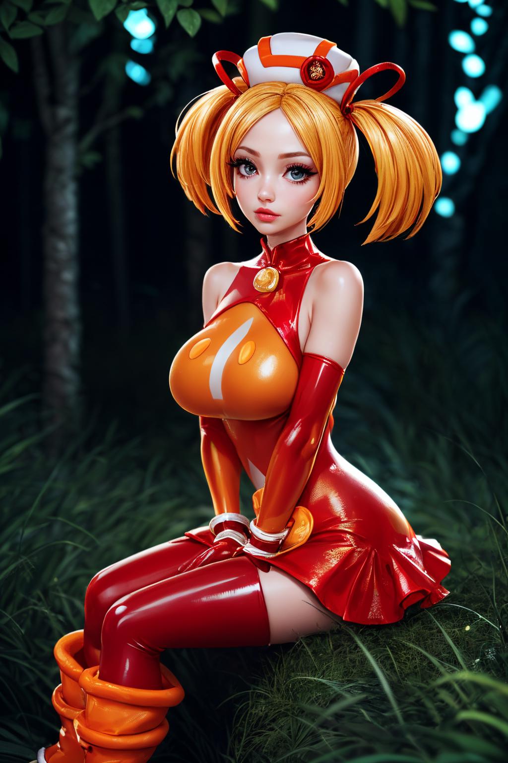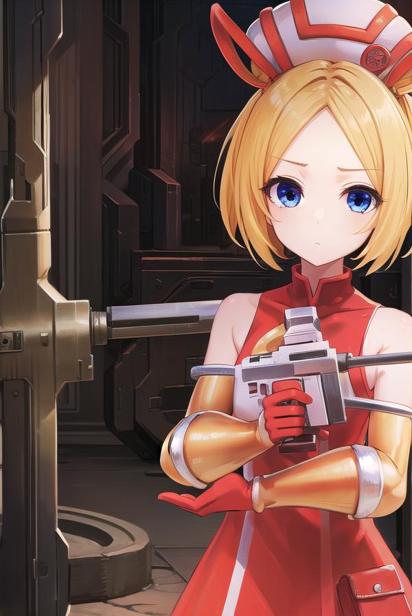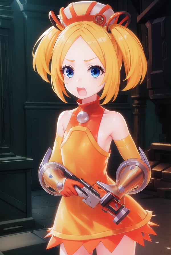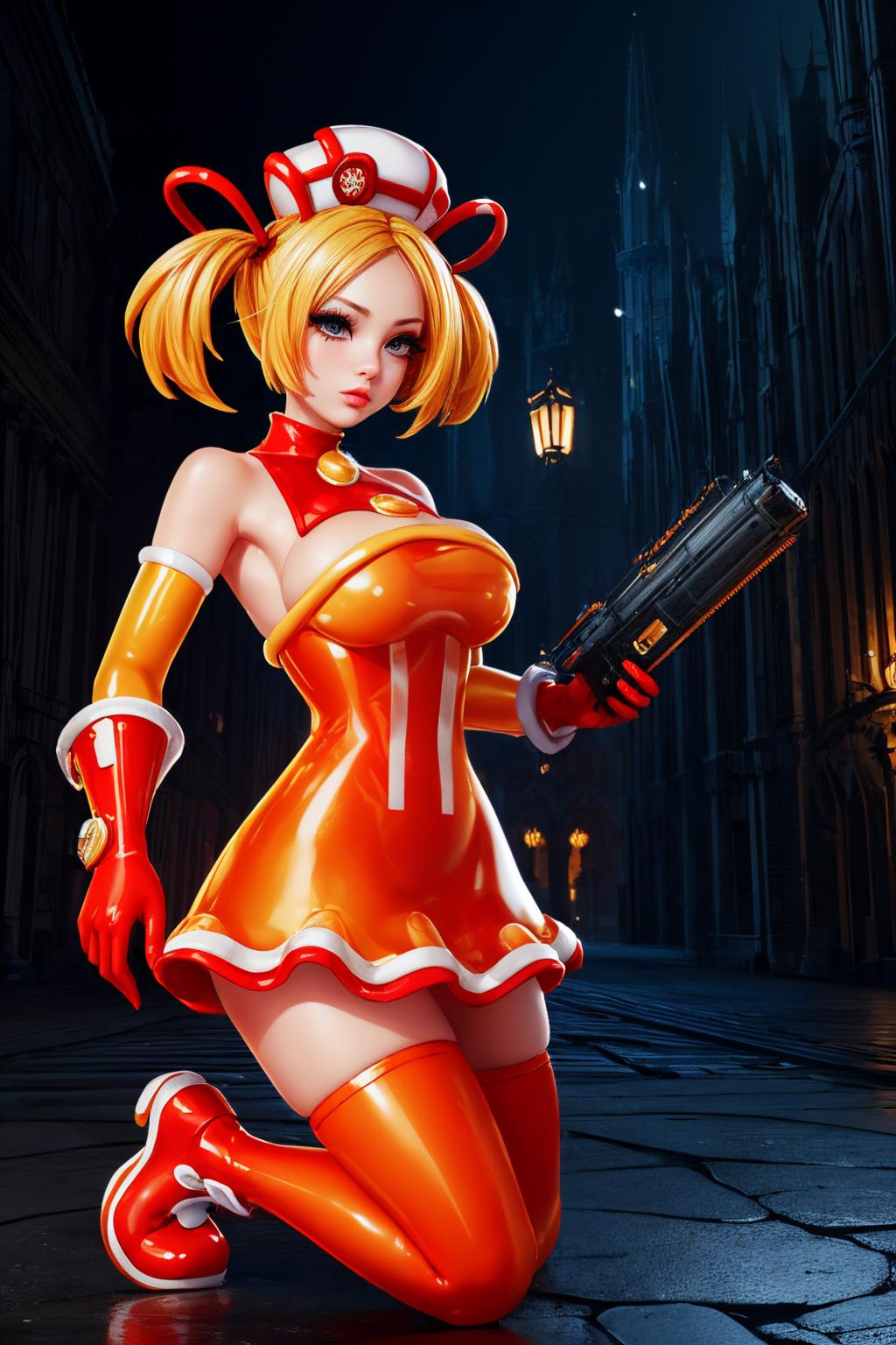 gloves, hat, dress, boots, gun, huge weapon, orange footwear, orange dress, bare shoulders, red gloves,