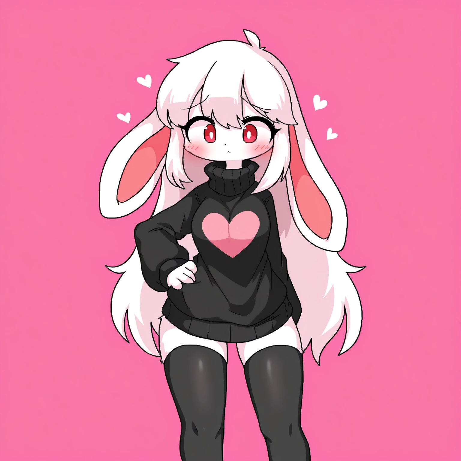 ockim, rabbit, rabbit ears, white fur, long hair, white hair, red eyes, turtleneck heart sweater, black sweater, thighhighs, medium breasts