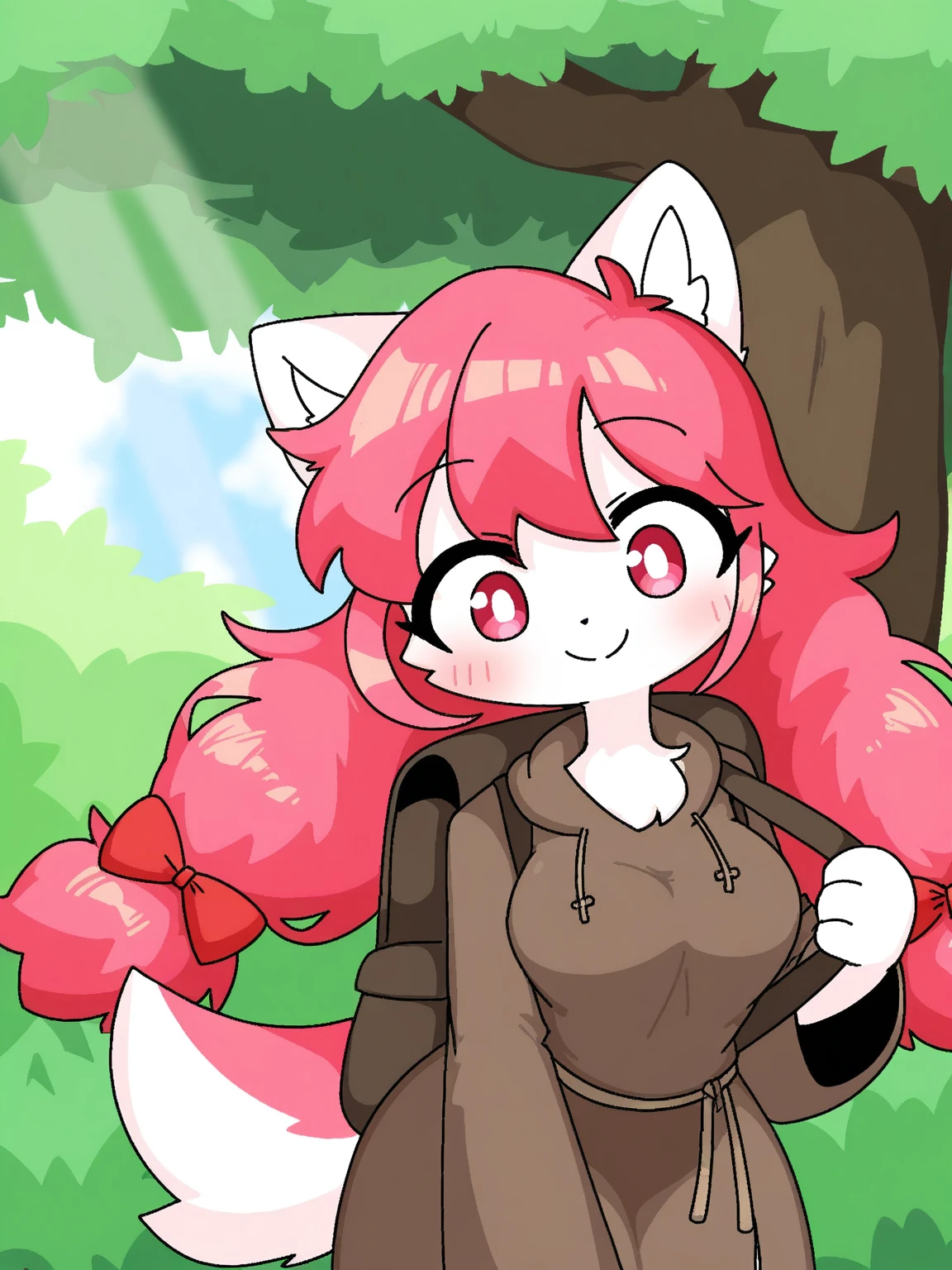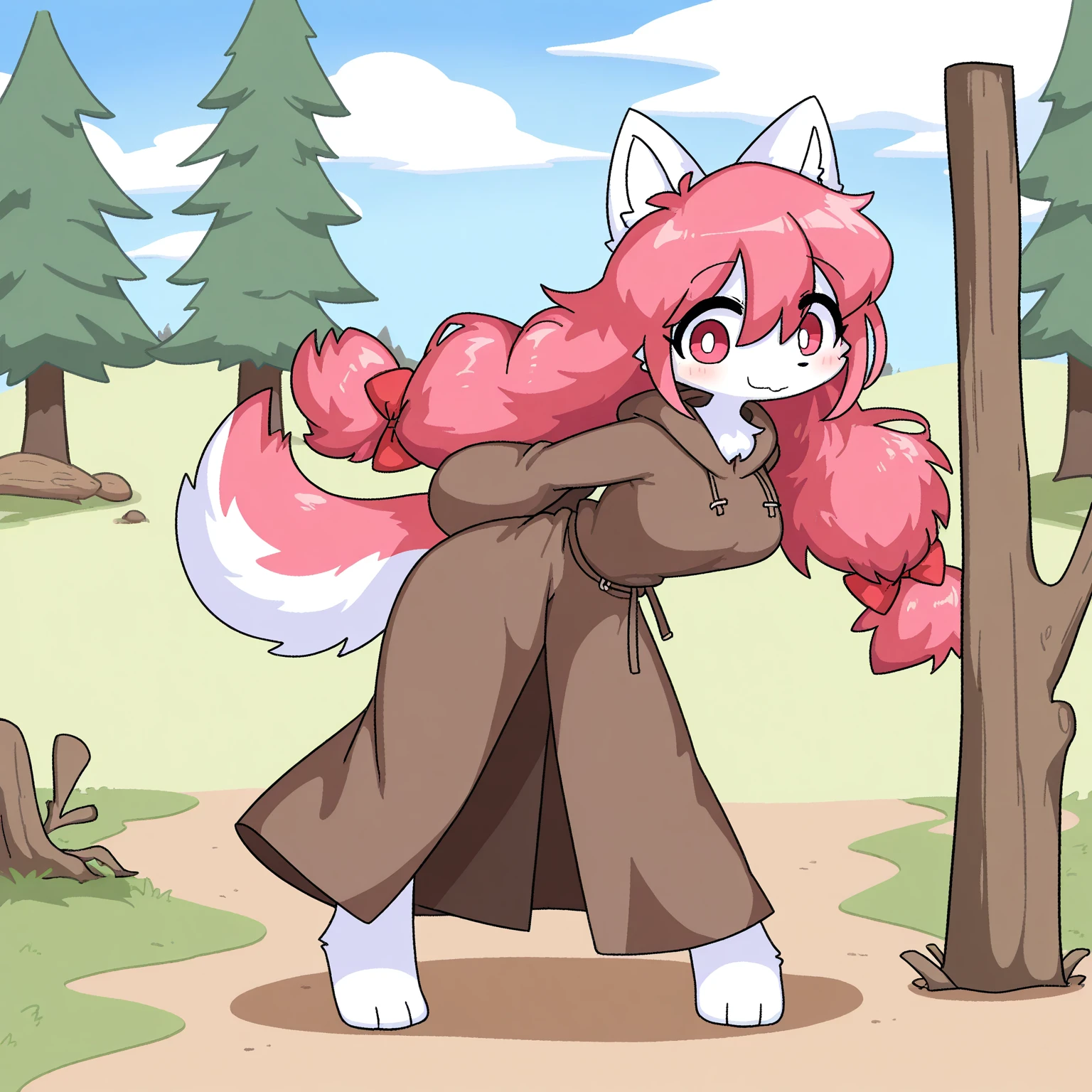 ocpeddler, wolf, wolf ears, brown robe, white fur, pink hair, pink eyes, split hair, hair bow, two-tone tail, long hair, low-tied long hair, medium breasts