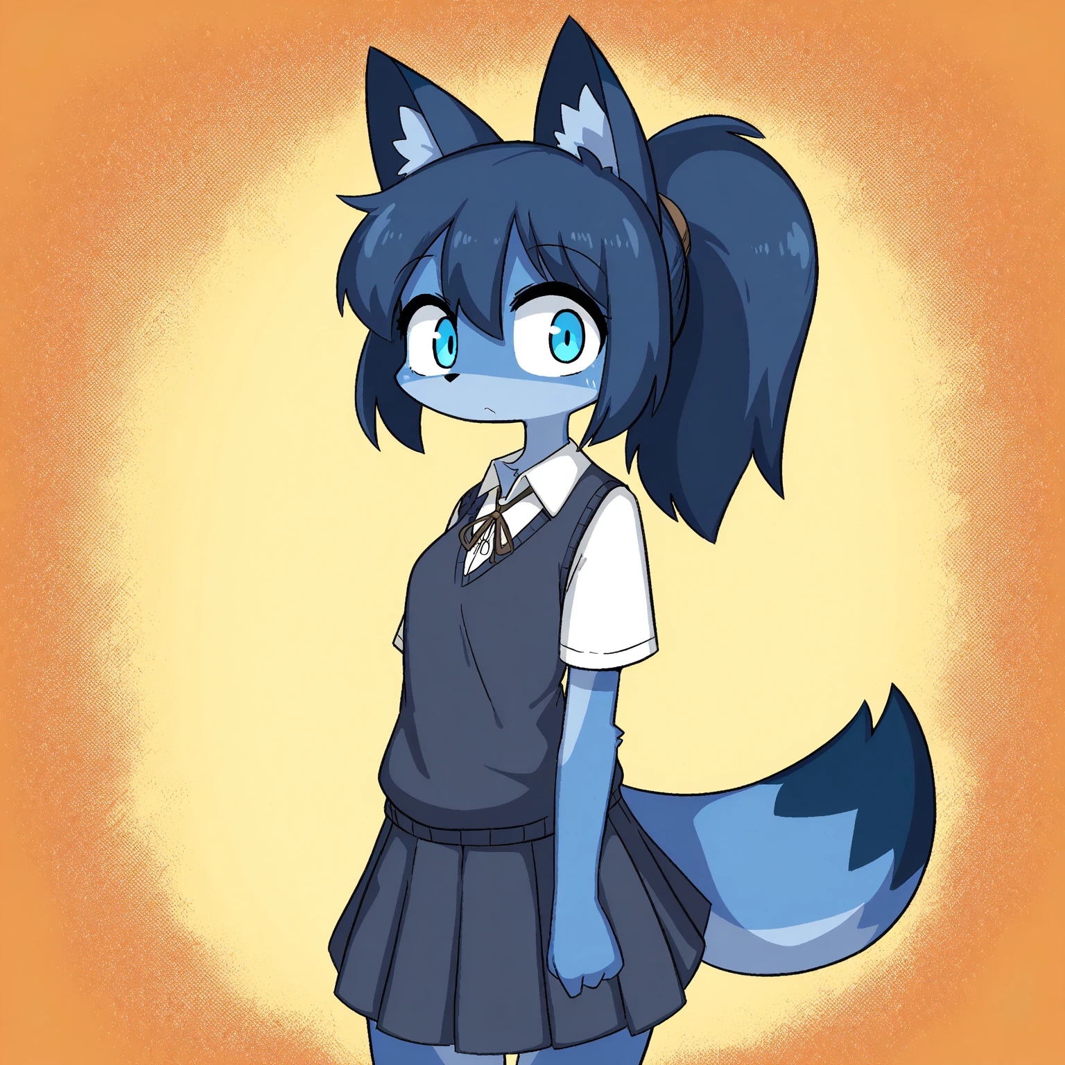 ochaul, fox, fox ears, blue fur, blue eyes, blue hair, two-tone fur, dipstick tail, ponytail
