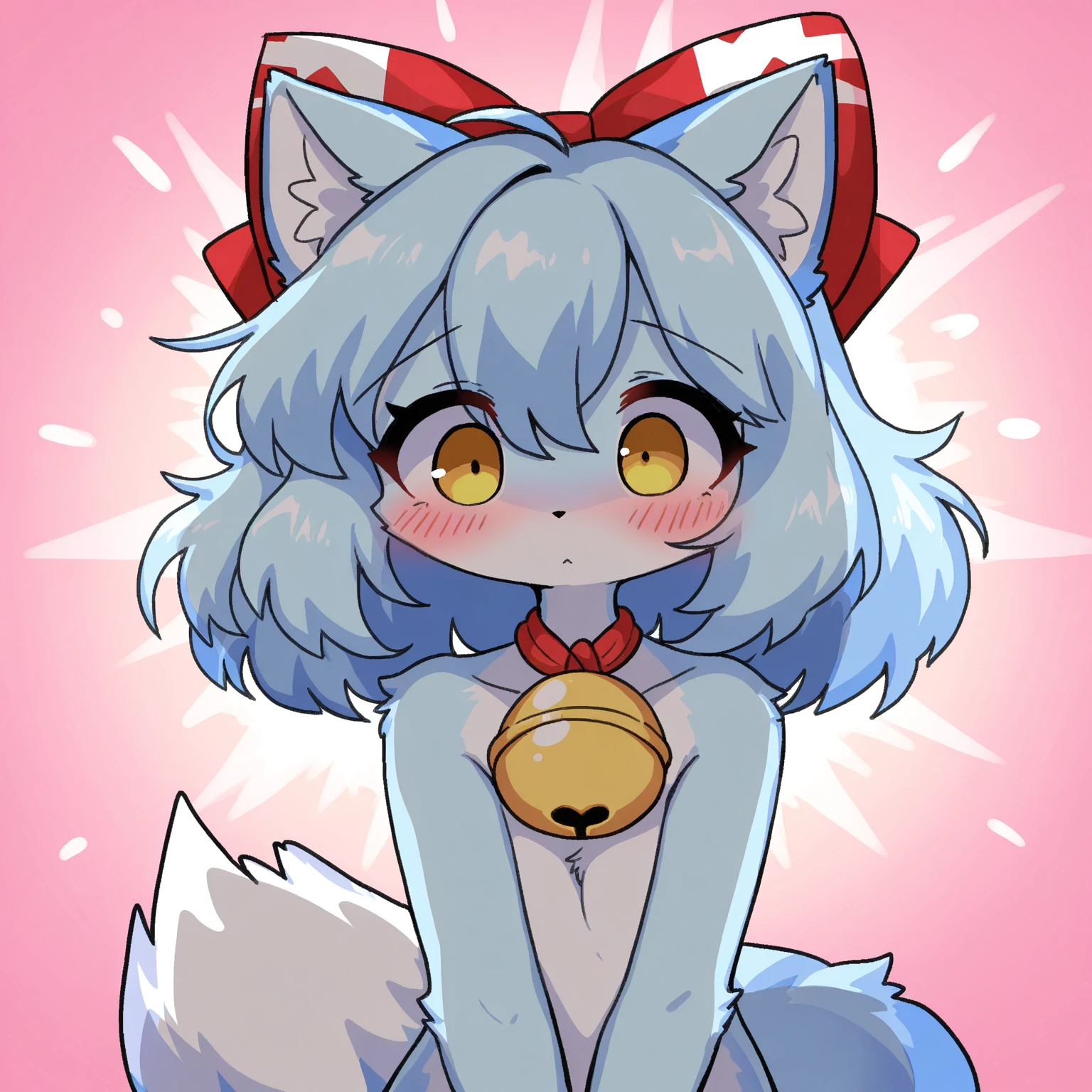 ocseoli, fox, fox ears, light blue hair, light blue fur, hair bow, neck bell, dipstick tail, yellow eyes, medium hair