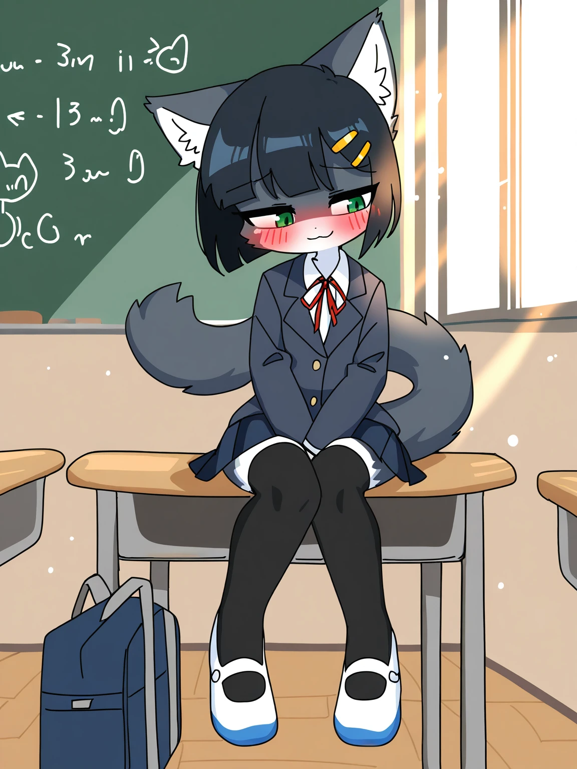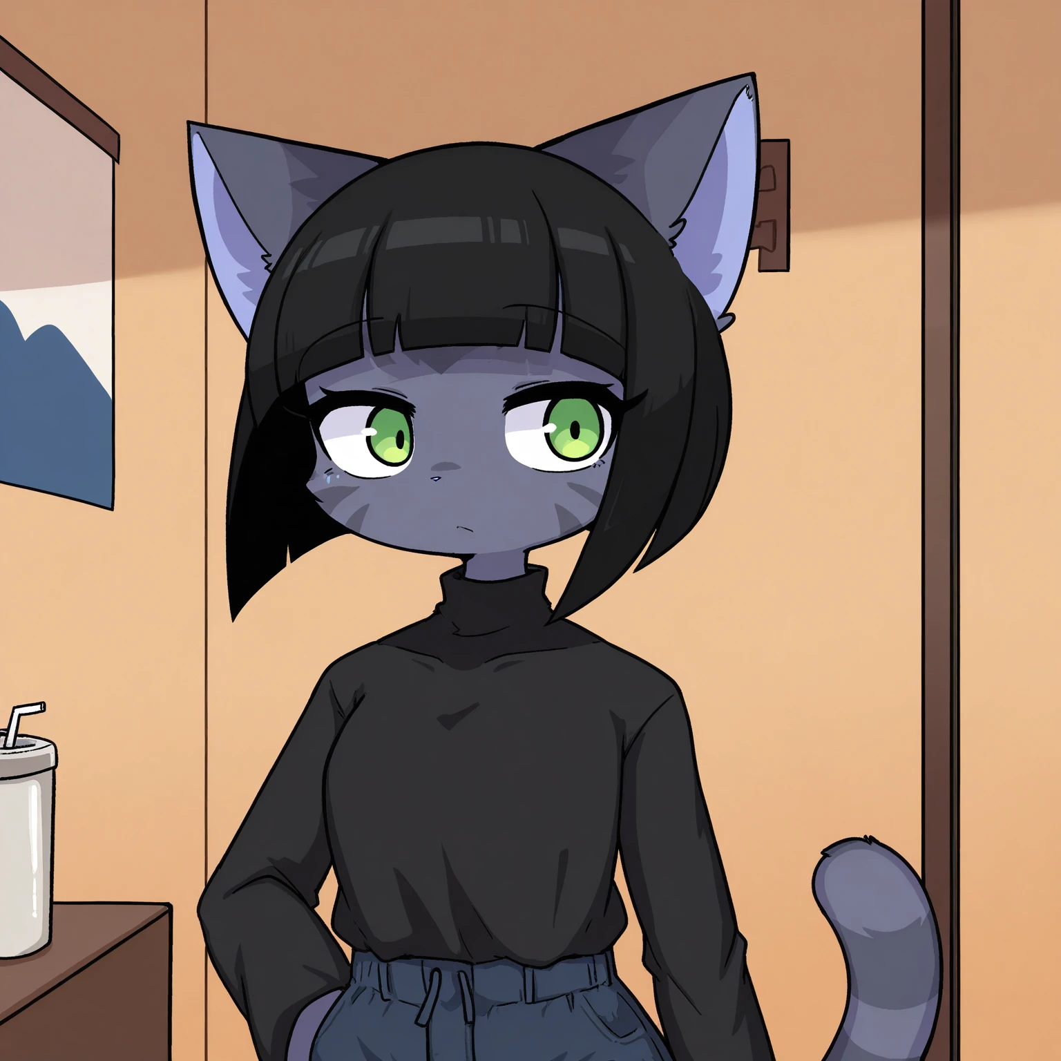 ocaisa, cat, cat ears, grey fur, green eyes, blunt bangs, bob cut, black hair, short hair, medium breasts
