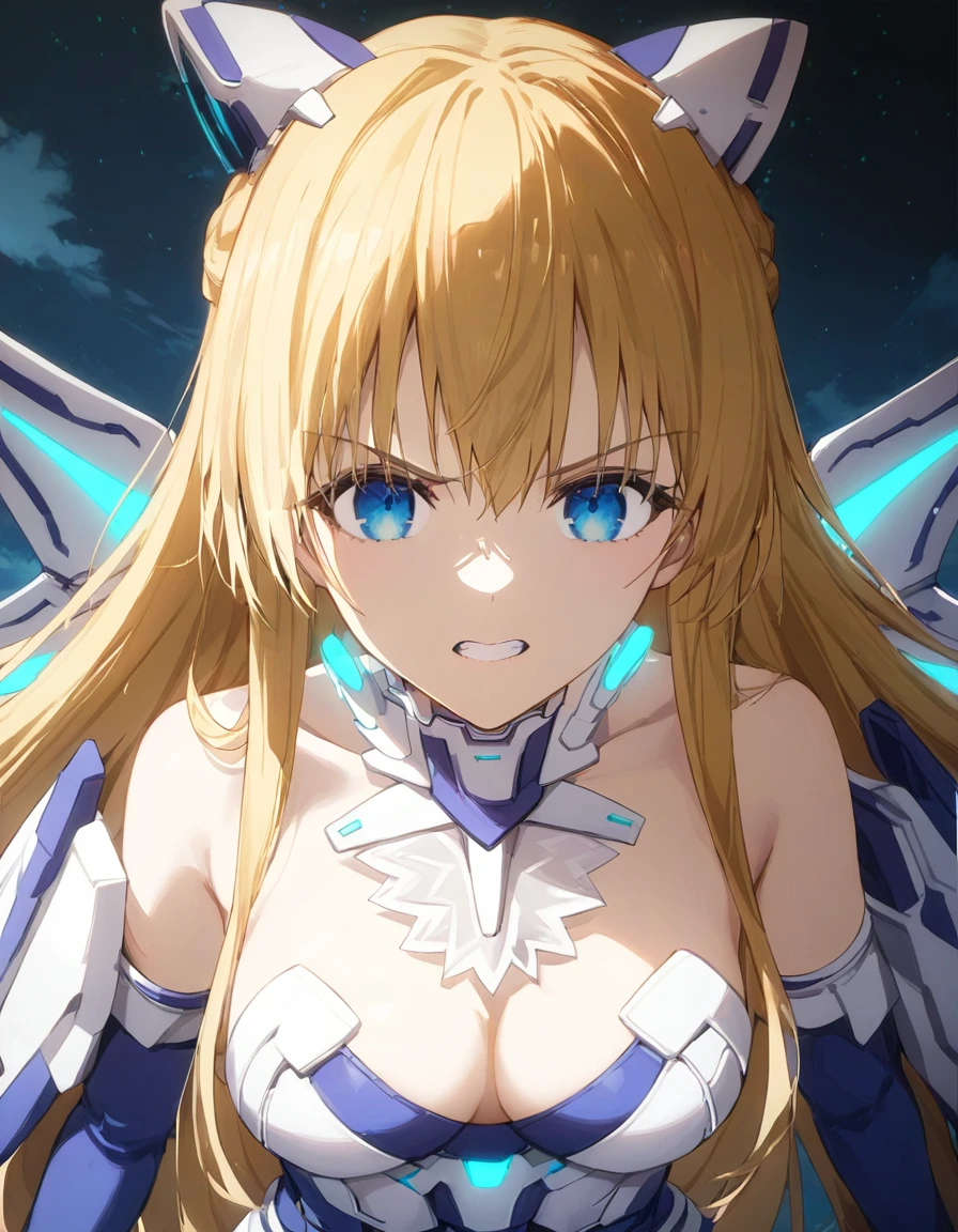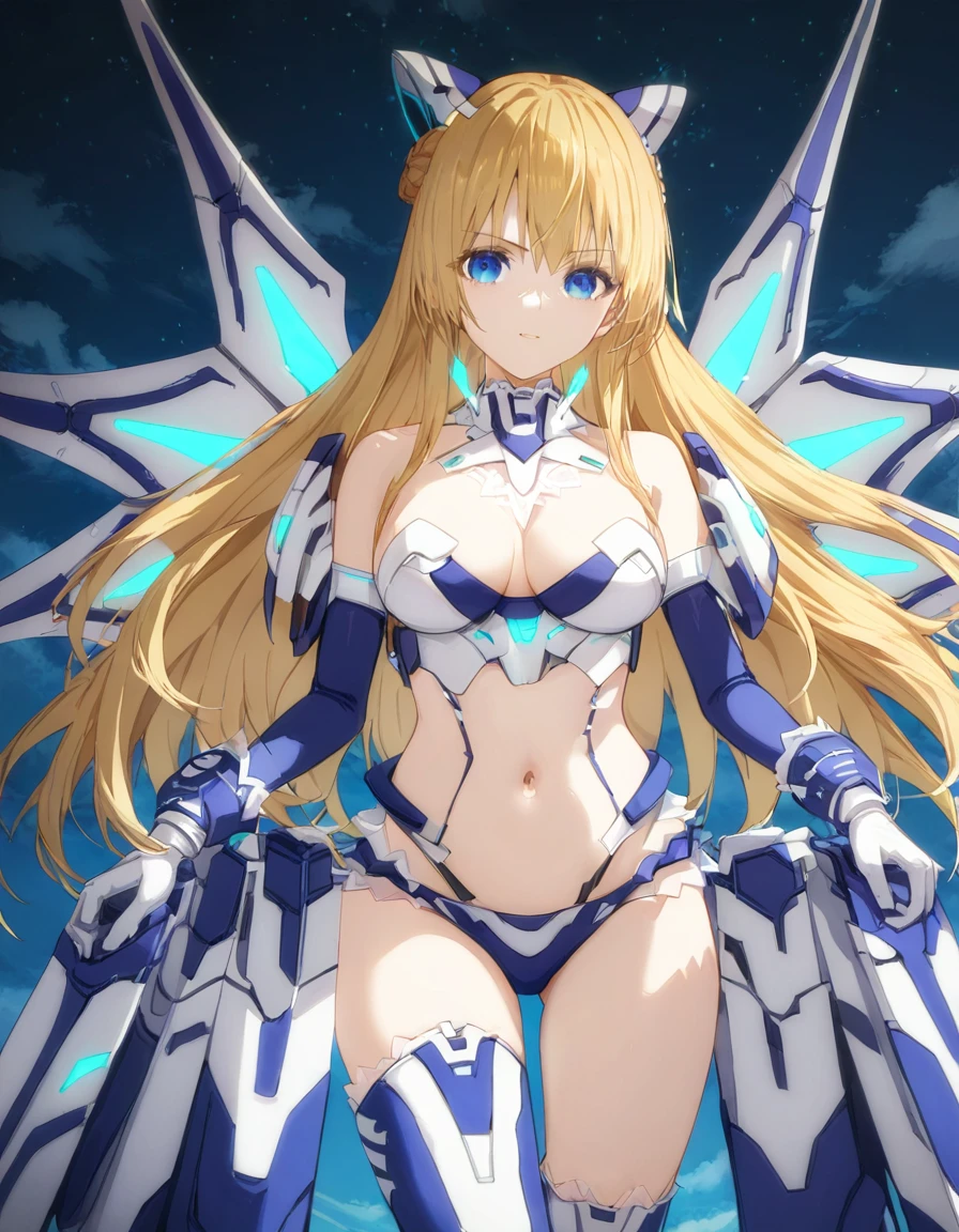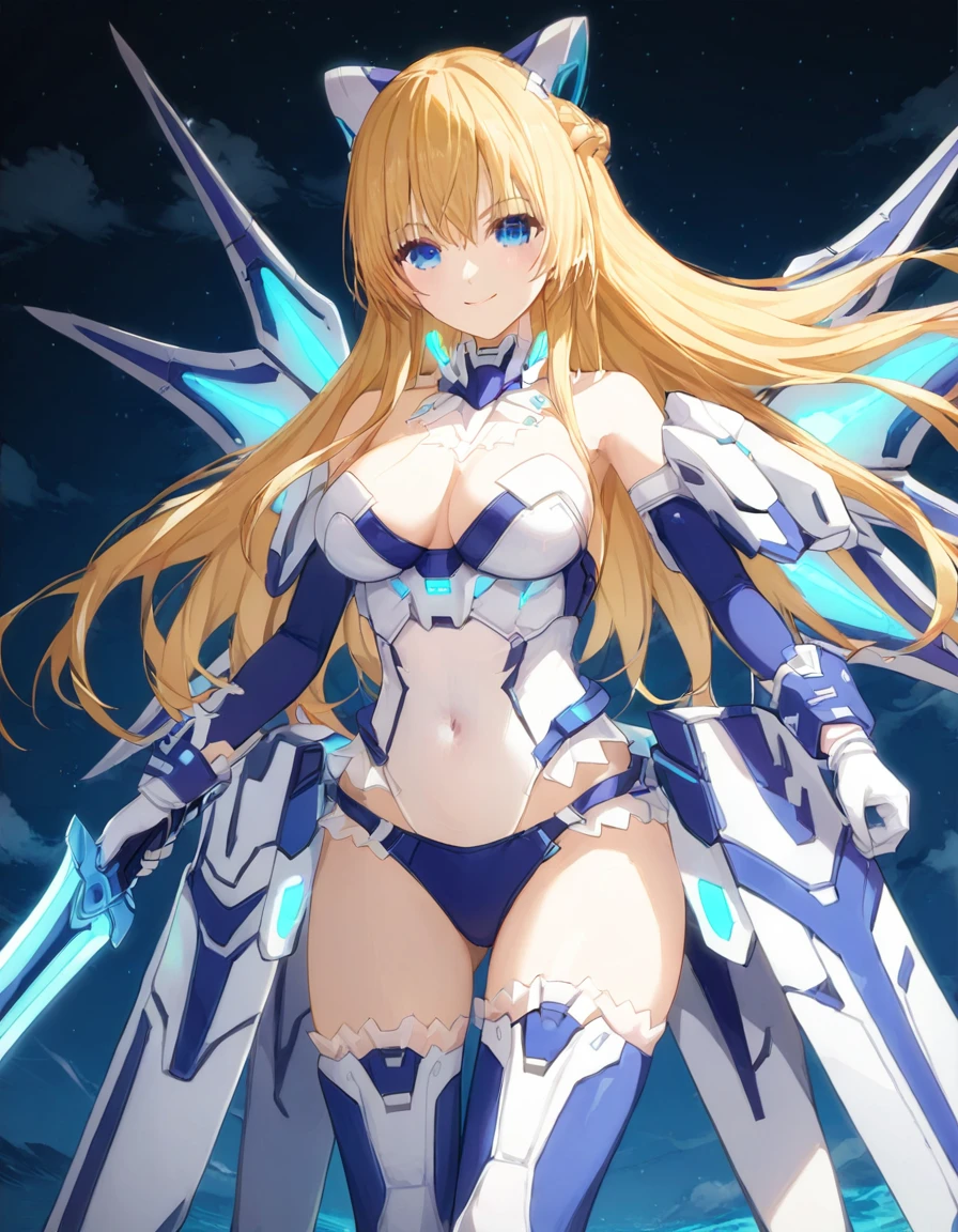 Artemisia, 1girl, solo, long hair, breasts, looking at viewer, blush, smile, blue eyes, blonde hair, large breasts, thighhighs, gloves, navel, holding, cleavage, bare shoulders, medium breasts, weapon, braid, wings, sword, white gloves, holding weapon, leotard, covered navel, floating hair