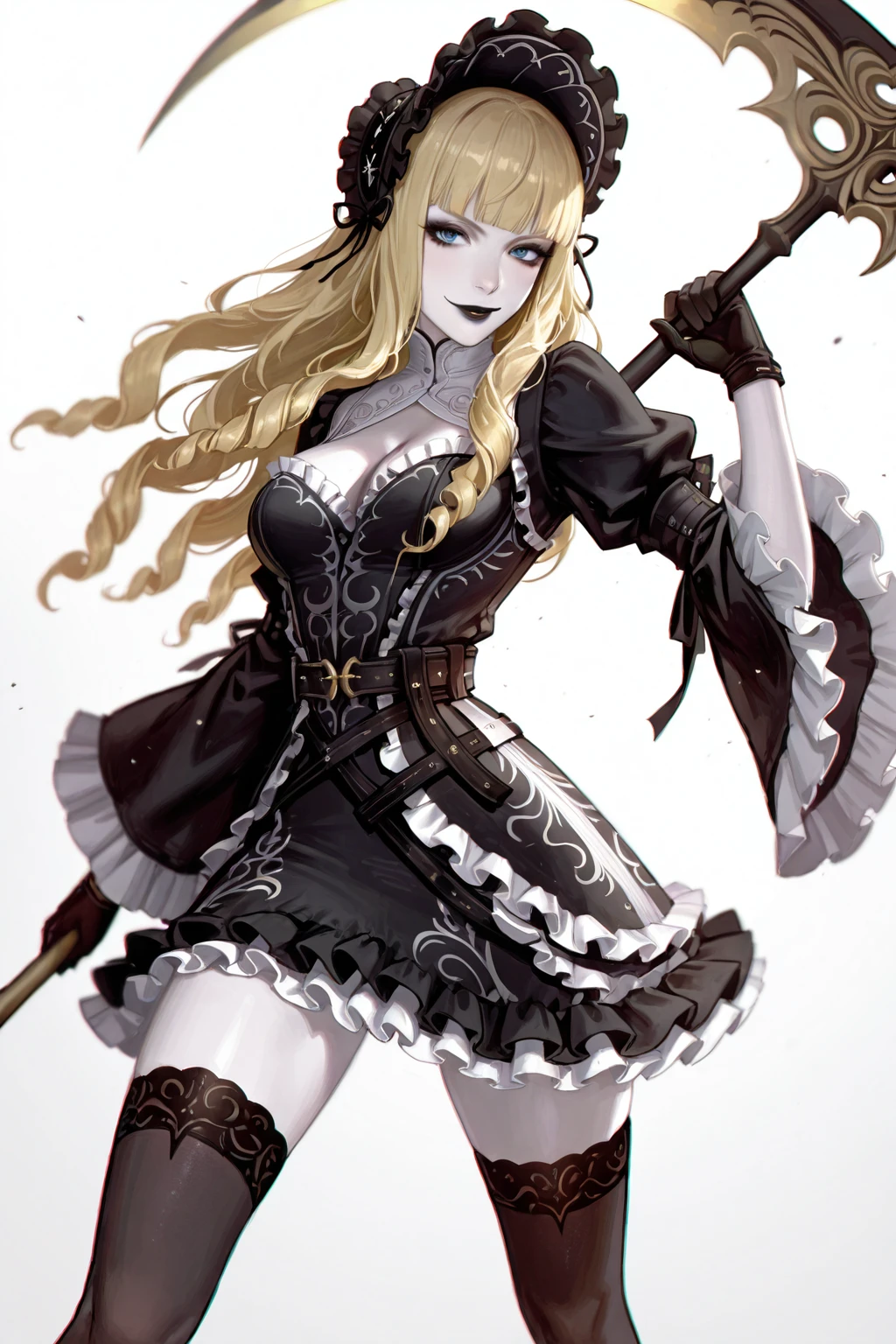 margaret moonlight, long hair, blonde hair, gloves, hairband, belt, blunt bangs, wide sleeves, black dress, blue eyes, makeup, drill hair, frilled dress, lipstick, pale skin, bonnet, goth fashion, black lips, black thighhighs