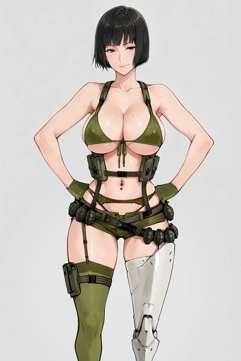 holly summers, short hair, black hair, red eyes, brown eyes, swimsuit, large breasts, belt, black eyes, short shorts, bob cut, single thighhigh, front-tie top, bikini top only, garter belt, front-tie bikini top, holster, green bikini, navel piercing, , green shorts, cyborg, green gloves, prosthesis, amputee, green thighhighs, grenade, mechanical legs, prosthetic leg