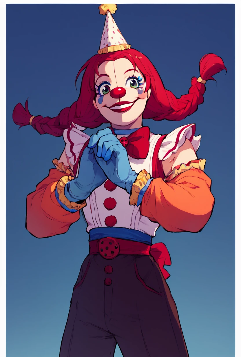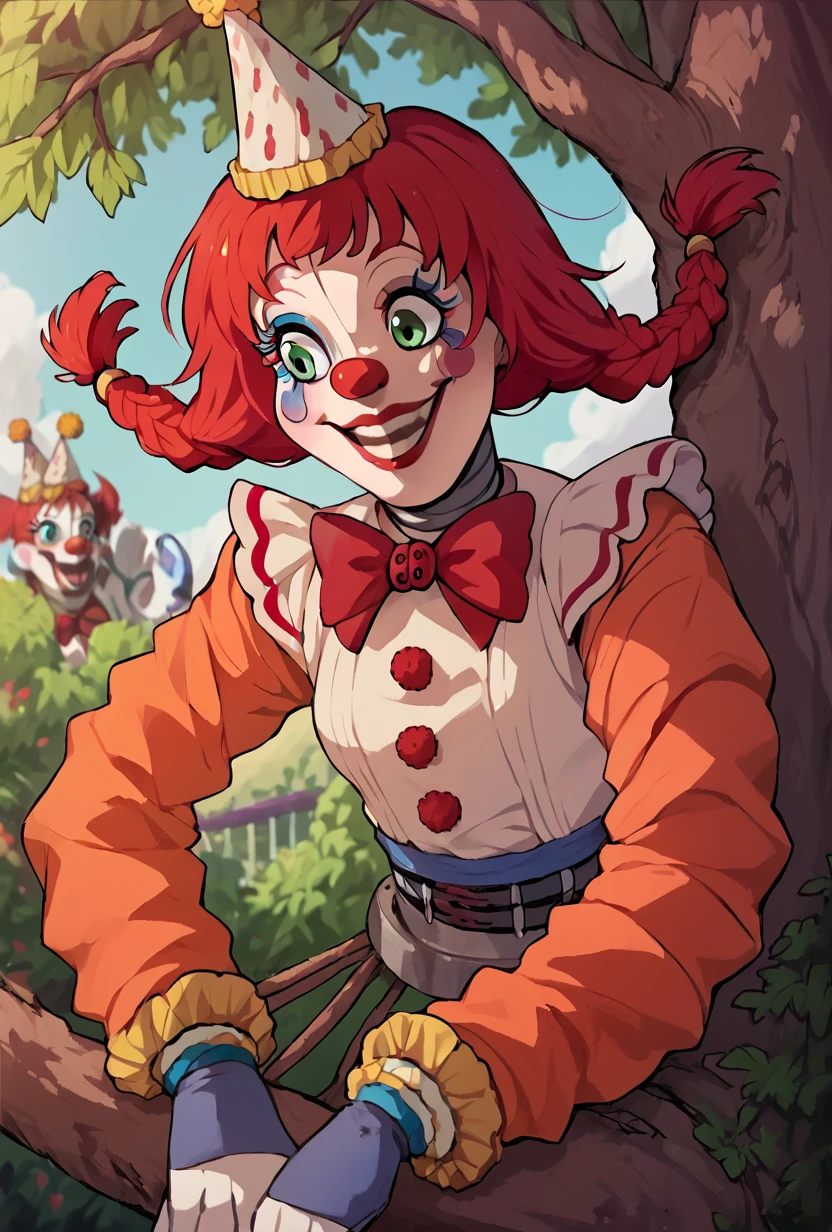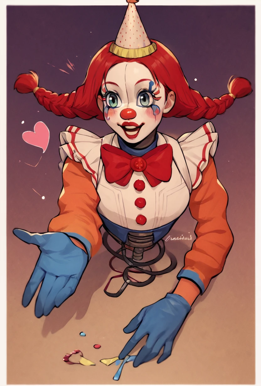 jackie, party hat, clown, solo,red bow, twin tails, red hair, , twin braids, , orange arms,